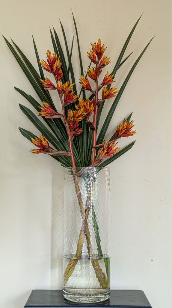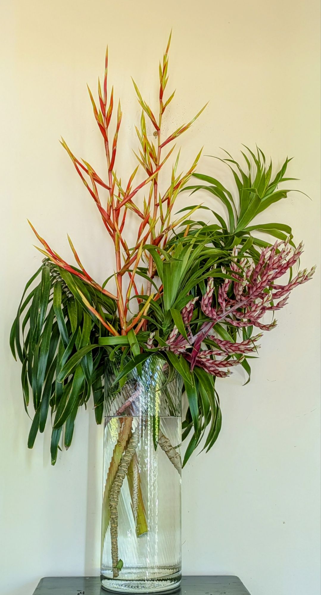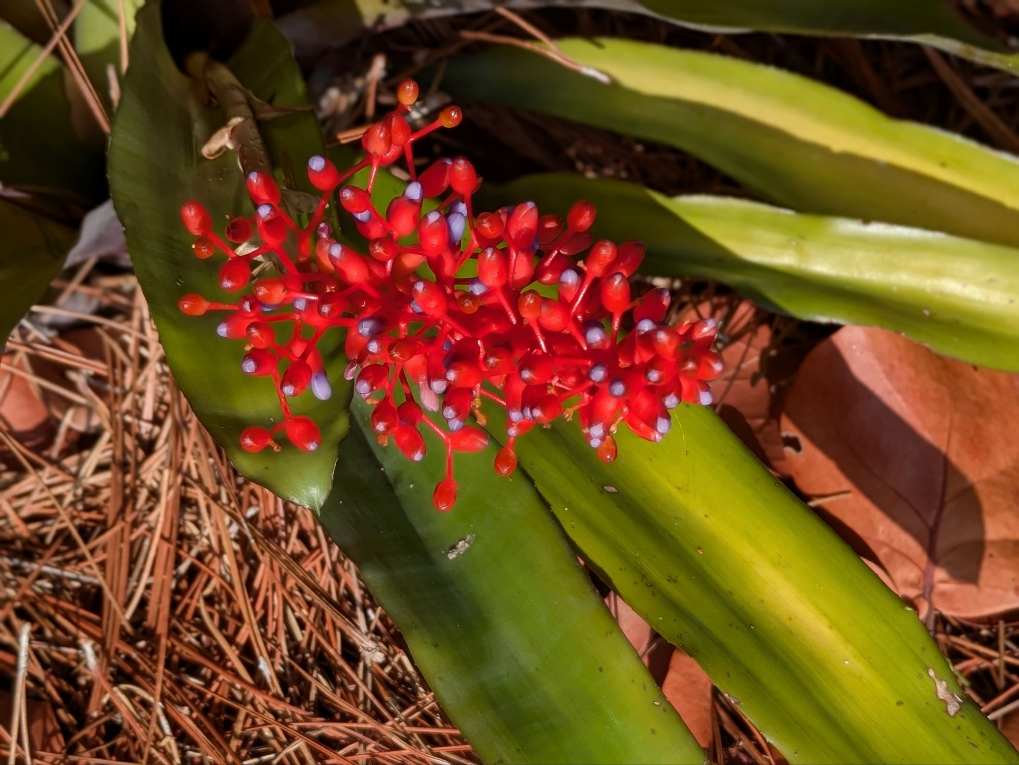 At long last our dry spell was broken last week. Locals swear that those of us who live on the limestone ridge (the highest point on the East Coast of Florida) are in the doughnut hole – a place where rain goes around us. Sometimes I believe this. This summer it has been true, the rain just wasn’t quite getting here. The garden gratefully soaked up all the moisture from the sky and promptly asked for more. This afternoon is looking quite promising for a rain shower. Things are looking a bit torched around here, so it seems a perfect time to introduce the Flaming Torch Bromeliad.