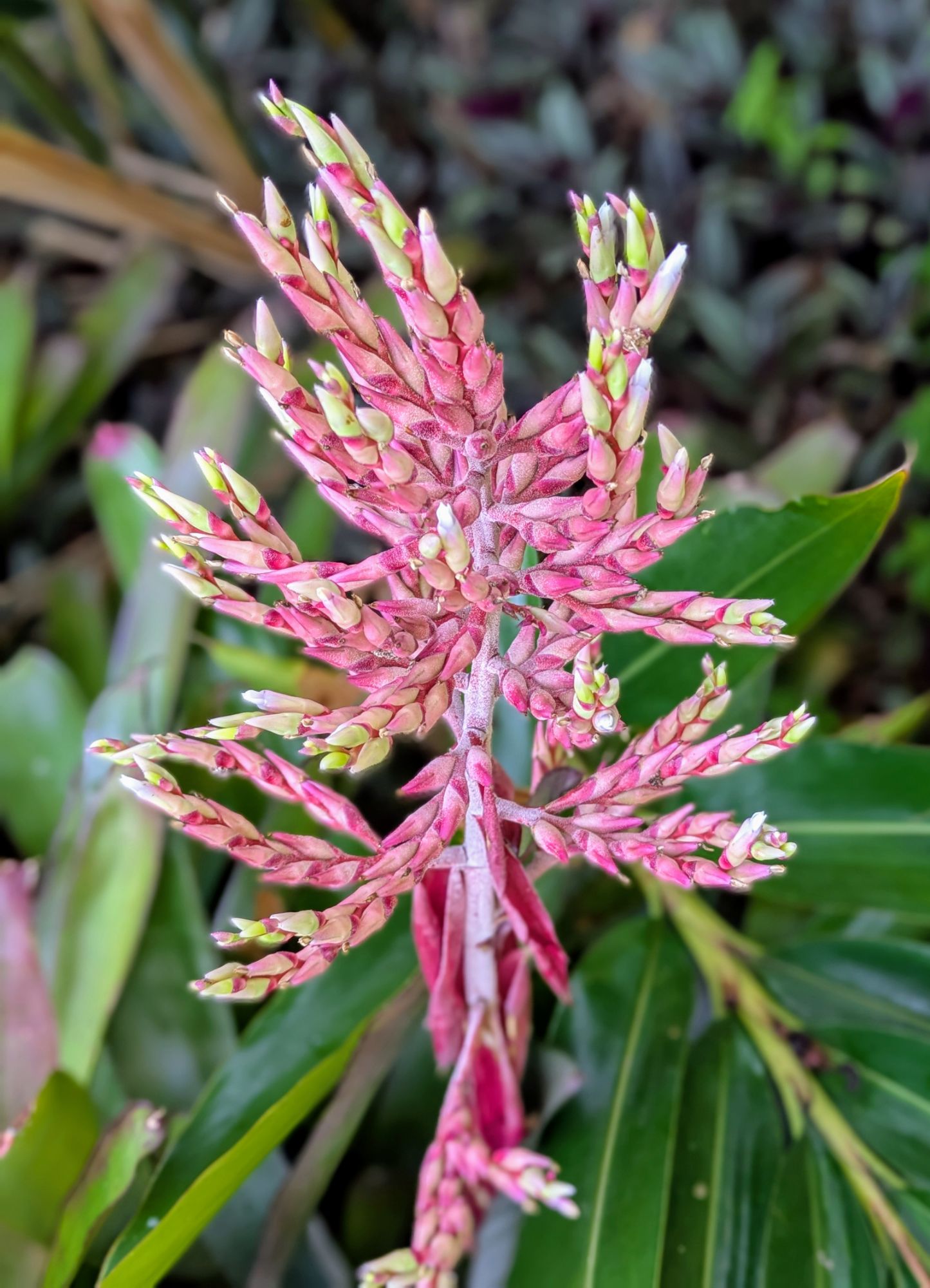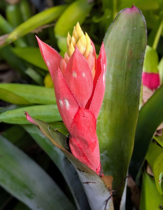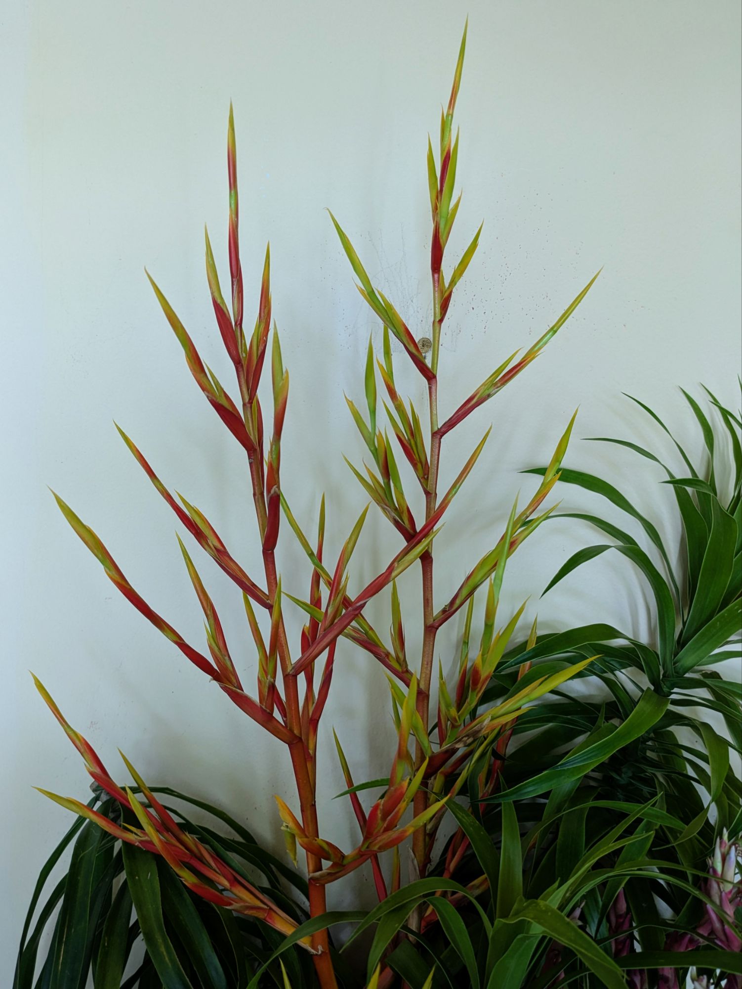 Meet the Flaming Torch (Billbergia pyramidalis). These are very aptly named, when the sun hits them just right, they look exactly like that. Another common name is Hurricane or Foolproof plant. The peak of hurricane season is September 6th, so I can get that. As far as being foolproof, I have killed a number of these following directions that they grow in full sun. This is not true. Those planted in full sun were torched!