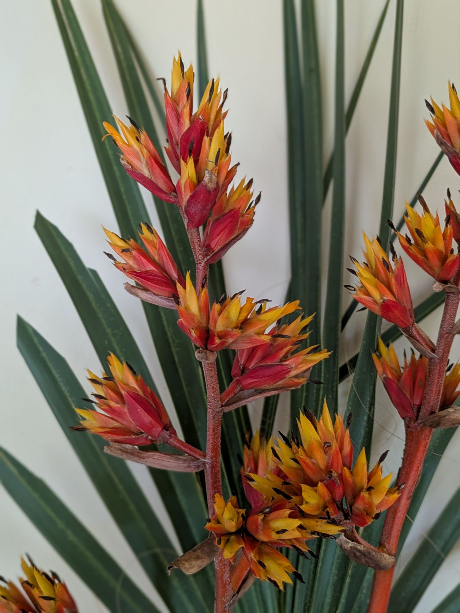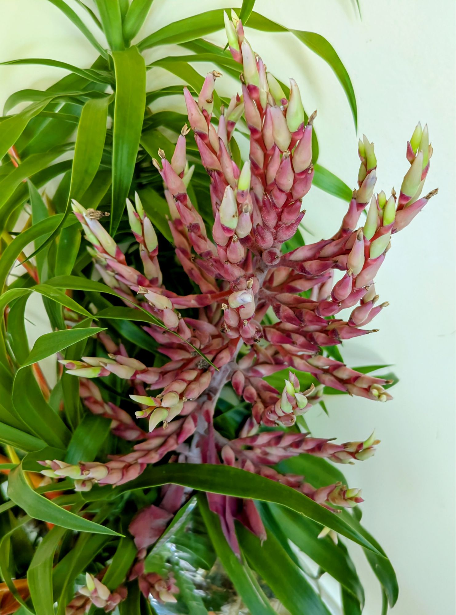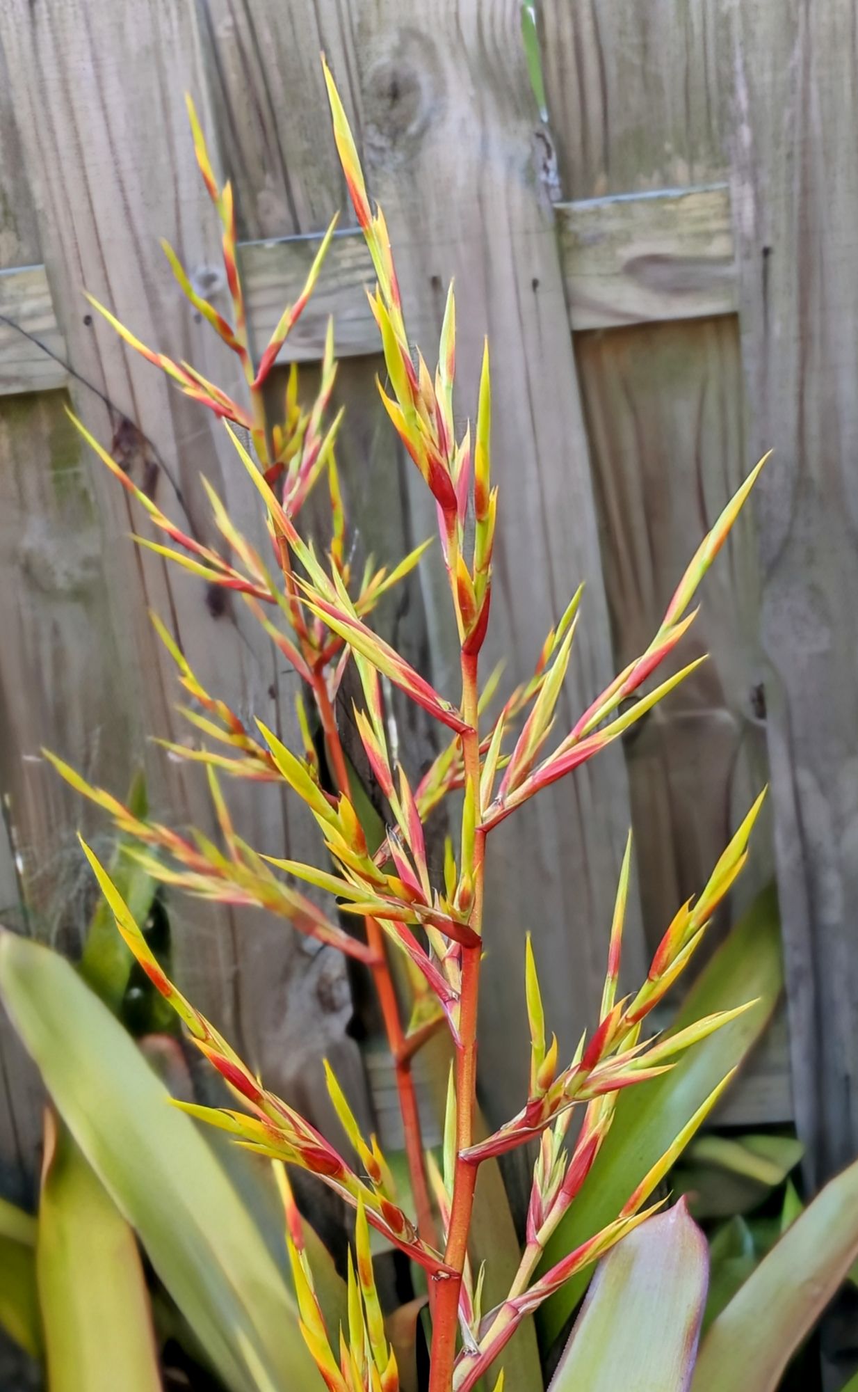 Meet the Flaming Torch (Billbergia pyramidalis). These are very aptly named, when the sun hits them just right, they look exactly like that. Another common name is Hurricane or Foolproof plant. The peak of hurricane season is September 6th, so I can get that. As far as being foolproof, I have killed a number of these following directions that they grow in full sun. This is not true. Those planted in full sun were torched!