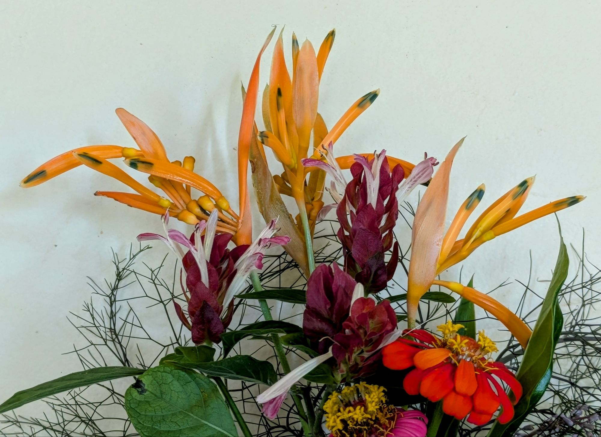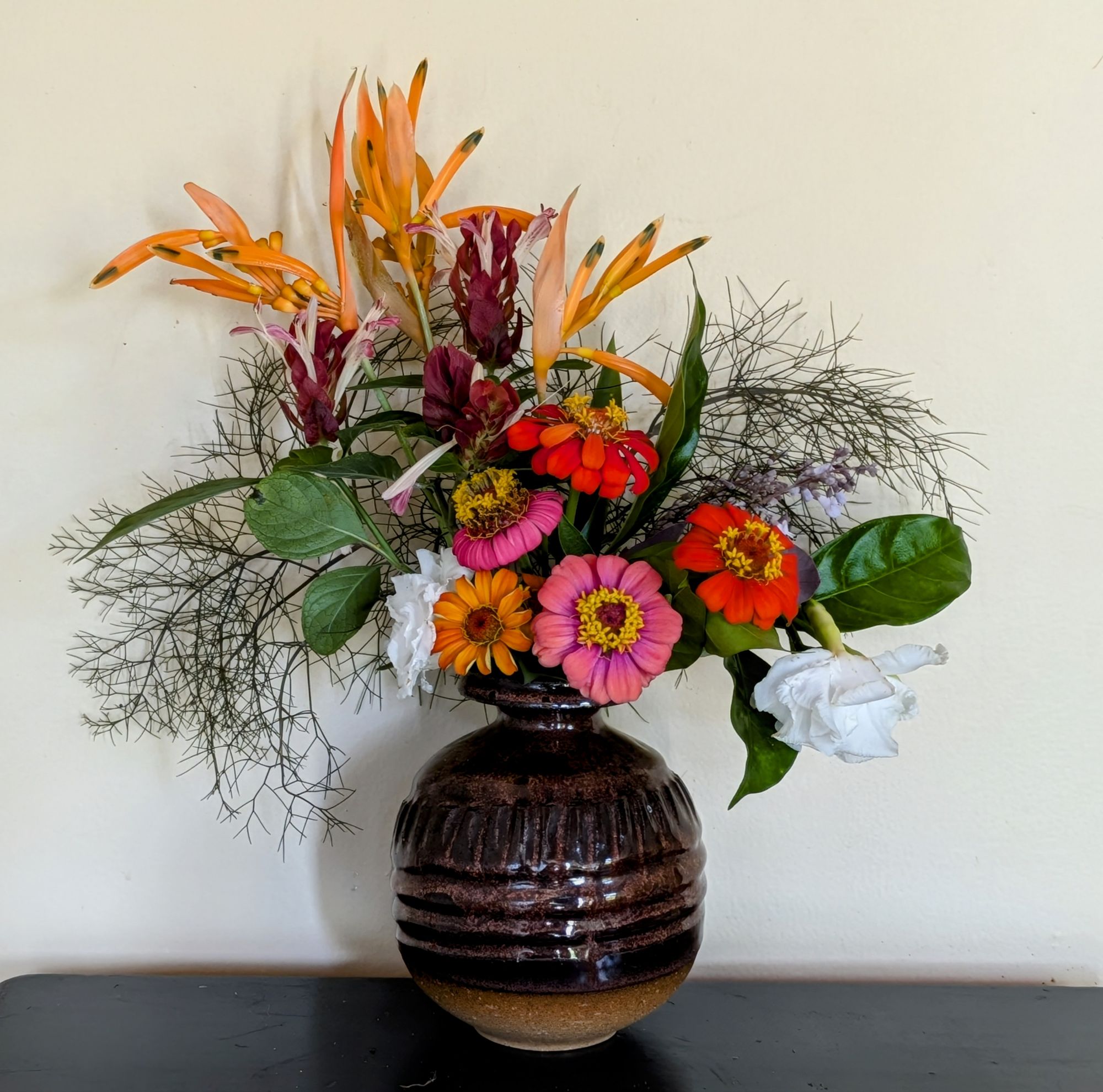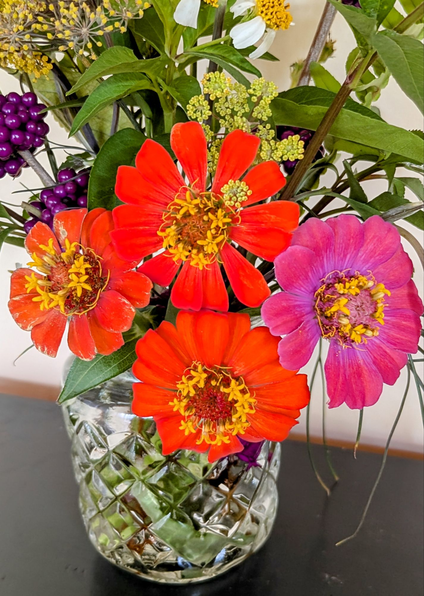 The rest of the arrangement has Zinnias, in pink and orange. Firebush (Hamelia patens) is orange tubular flowers. Dark foliage and pale yellow flowers are from Bronze or Copper Fennel (Foeniculum vulgare). The vase is a non heirloom florist vessel from somewhere..