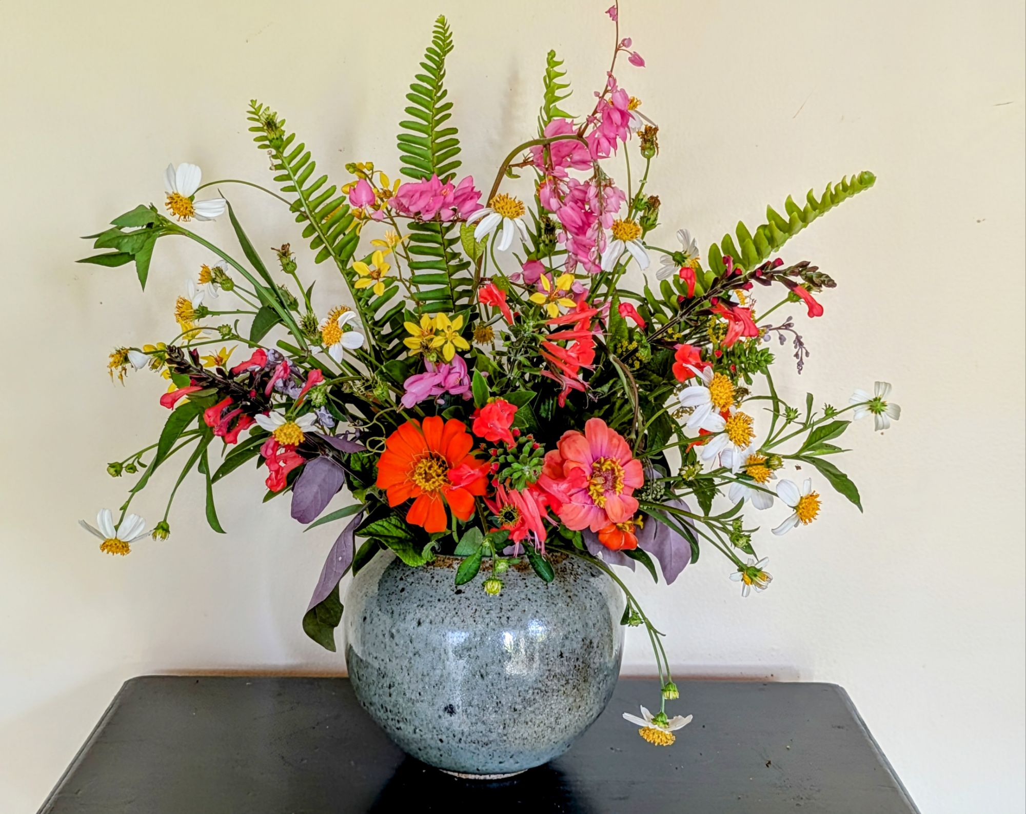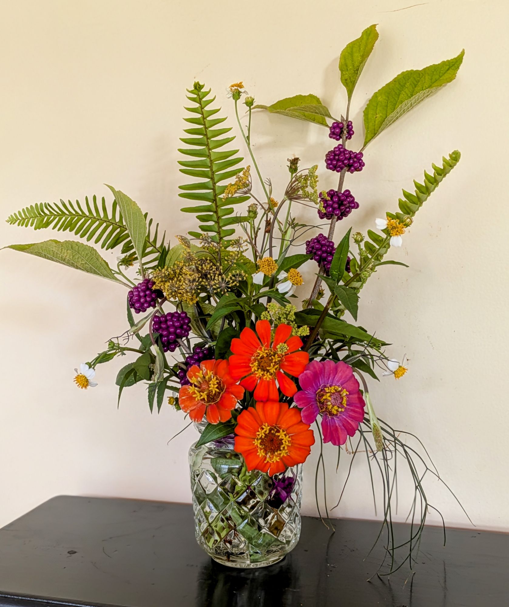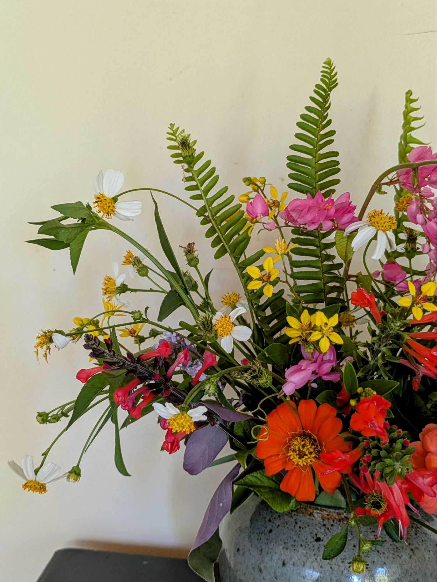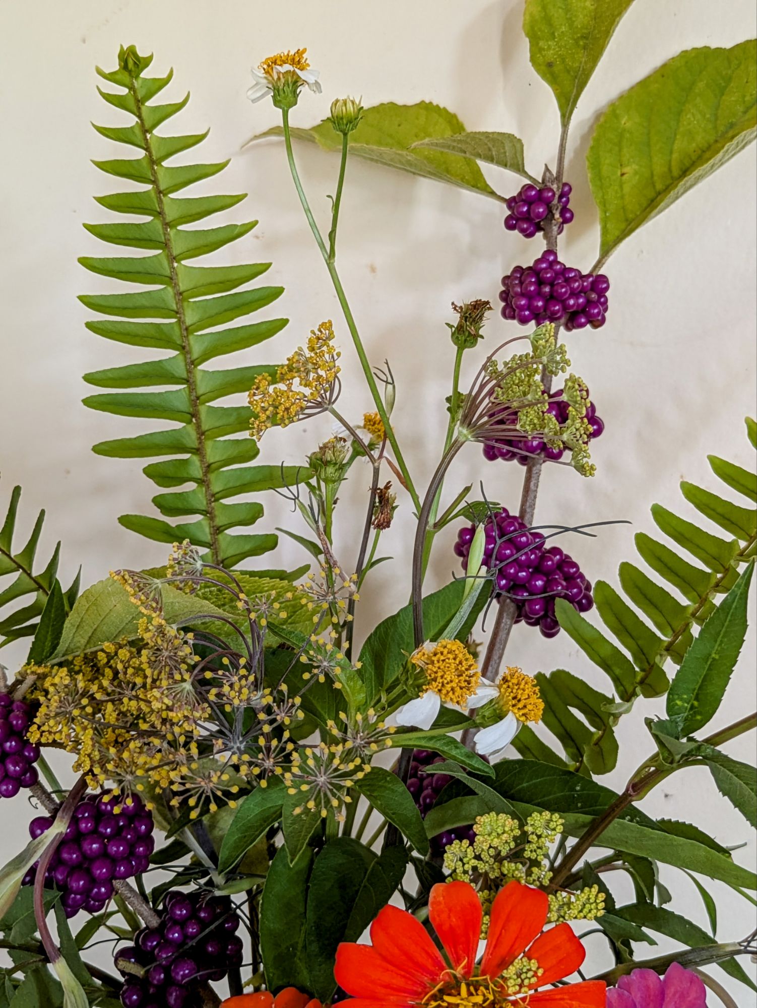 The rest of the arrangement has Zinnias, in pink and orange. Firebush (Hamelia patens) is orange tubular flowers. Dark foliage and pale yellow flowers are from Bronze or Copper Fennel (Foeniculum vulgare). The vase is a non heirloom florist vessel from somewhere..