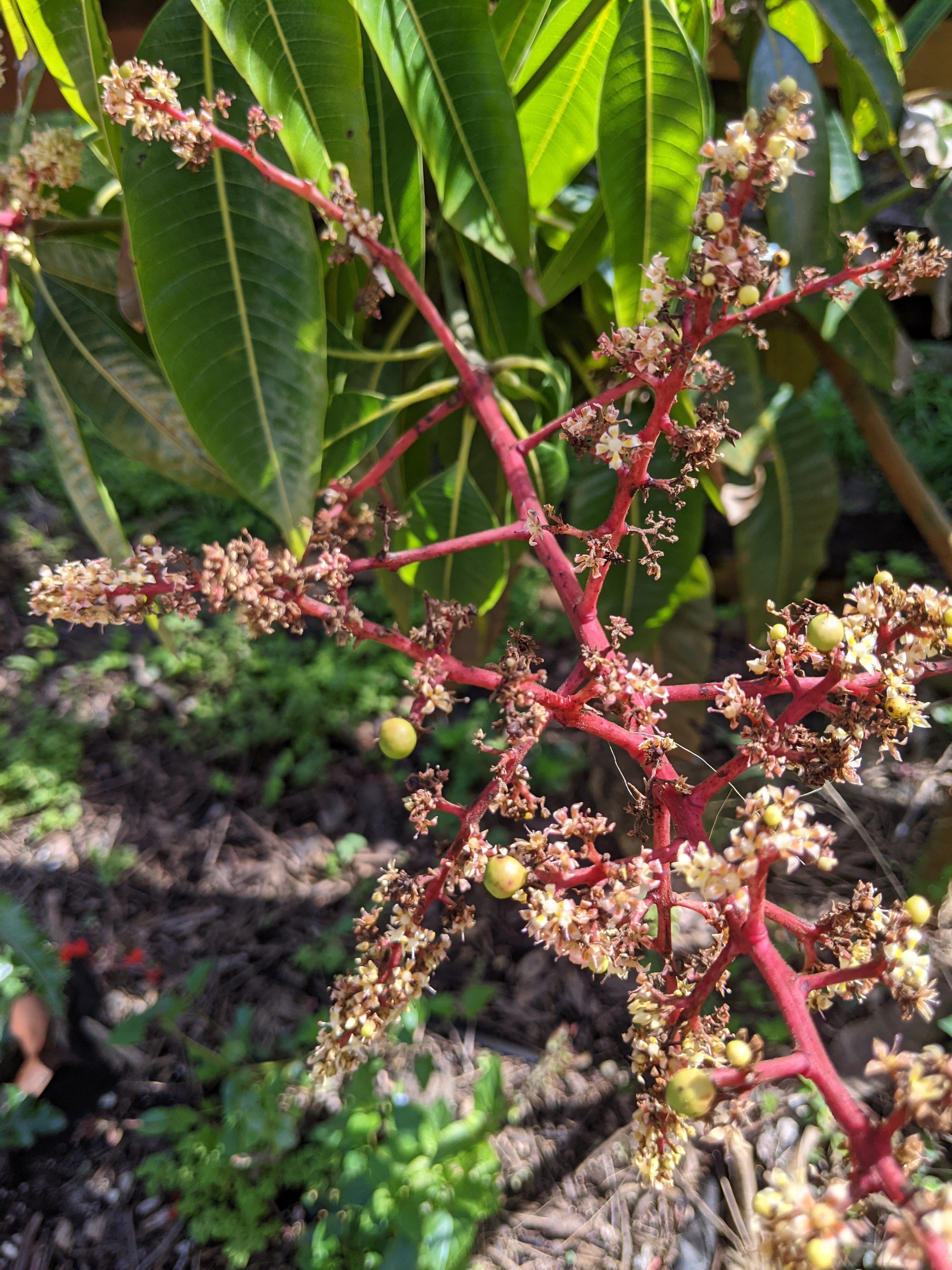 The first tiny Nam Doc Mai mangoes of the year. I was happy to see the bees at work on the flowers this week. Sometimes it is too windy for the flowers to bee pollinated and you get no mangoes. Interestingly, I have flowers on the opposite side of the tree this year. Last year all the fruit was on one side. 100 days from flower to fruit on mangoes is the mantra. I am not so sure about that!