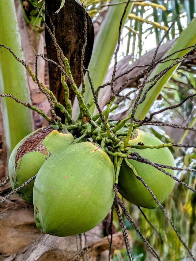 As the song goes “Put the Lime in the Coconut” here’s the coconut. These are baby coconuts on a tree in my neighbor’s yard.