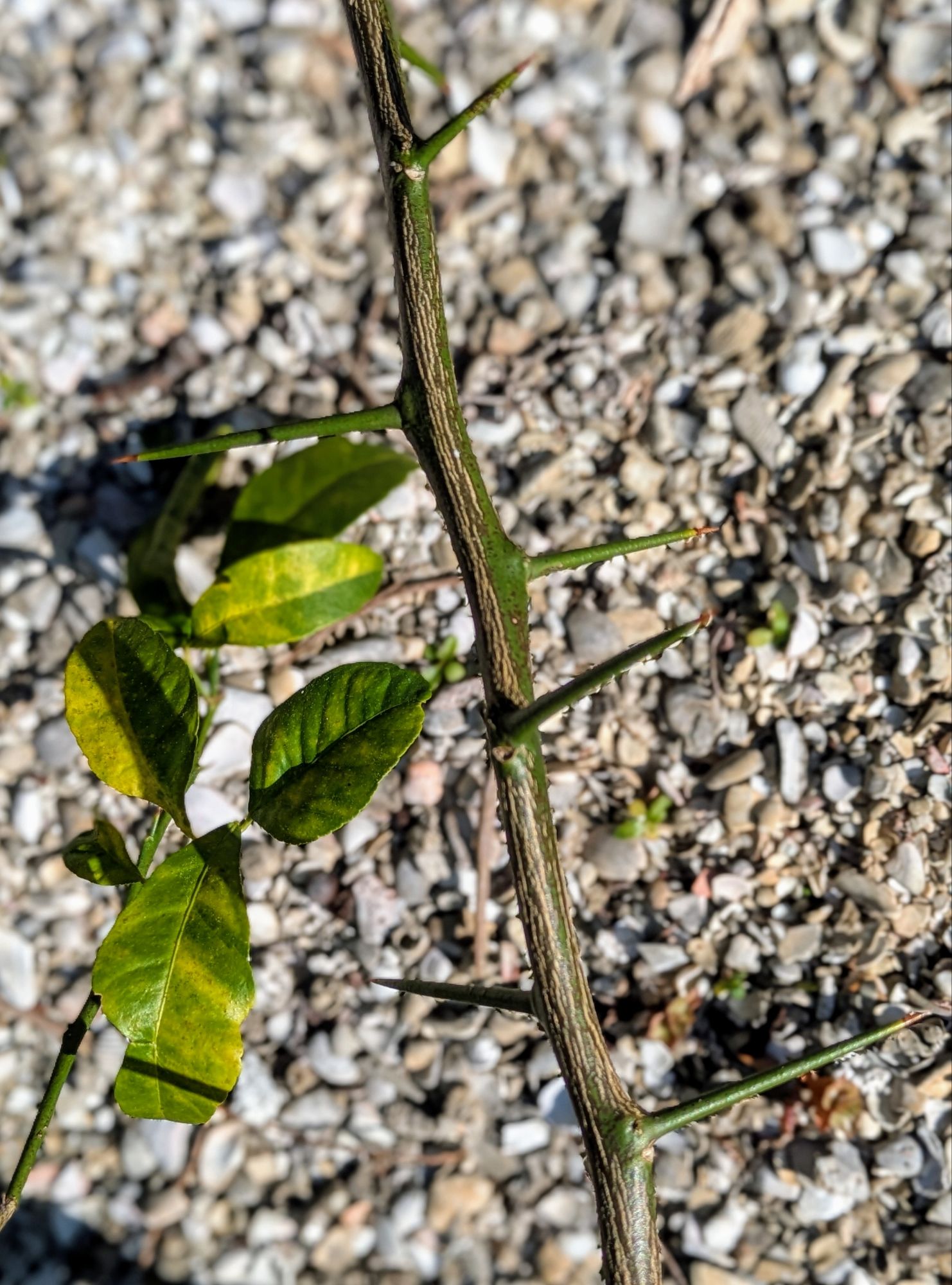 The weather this week was cool. A good time to do battle with oddly growing tropical fruit trees. I donned my leather gloves and arm covers and pruned the Rangpur limes. See why above. The branches that bear fruit have some serious thorns.