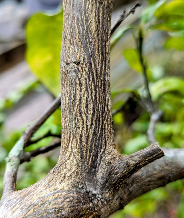 The trunks of the Rangpur lime are smooth and the fragrance is wonderful when pruning. It is a pleasant experience if the thorns on the branches can be avoided. This lime tree has taken a strange shape. I hope I have cleaned it up and made the fruit easier to pick next year.