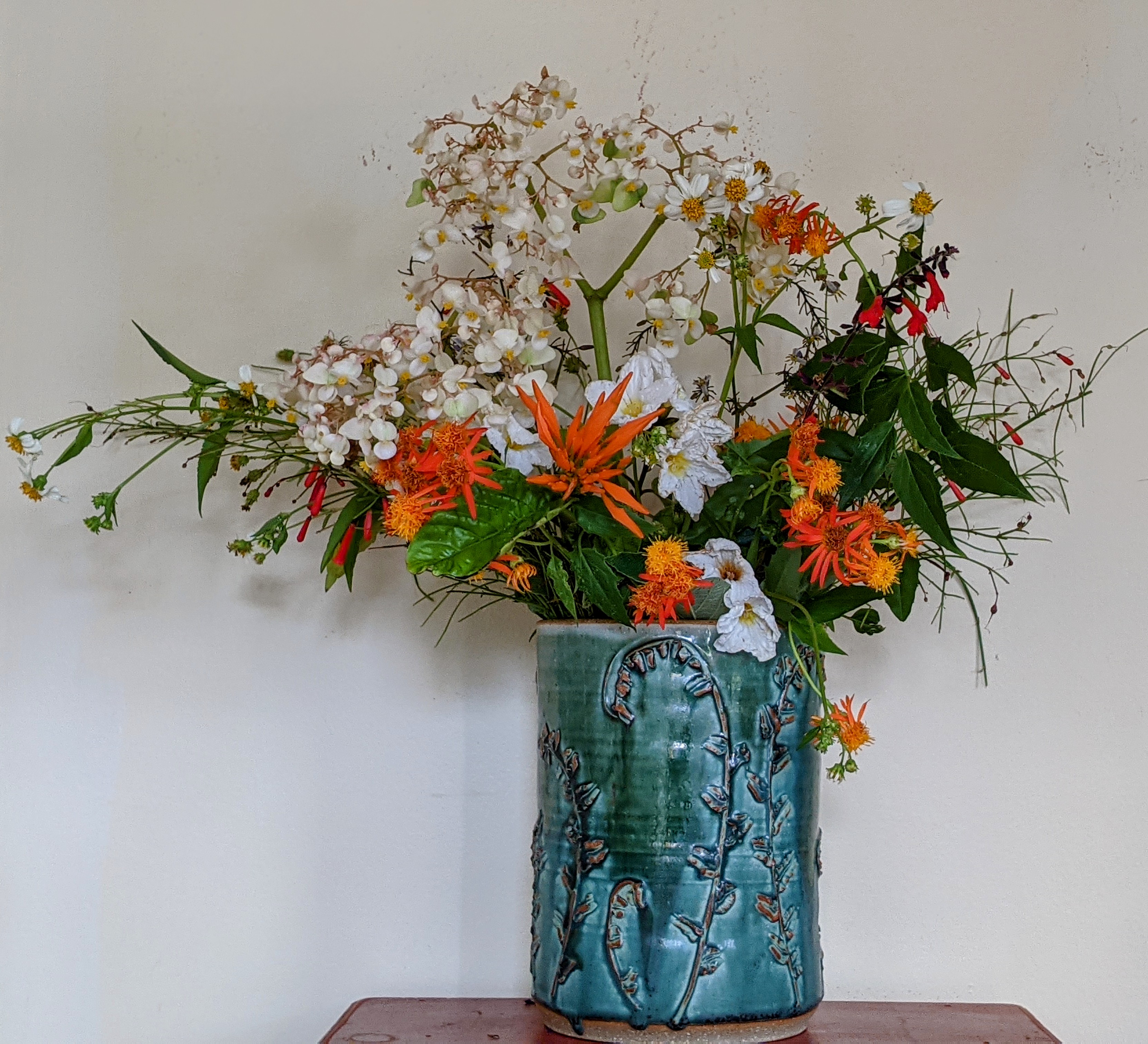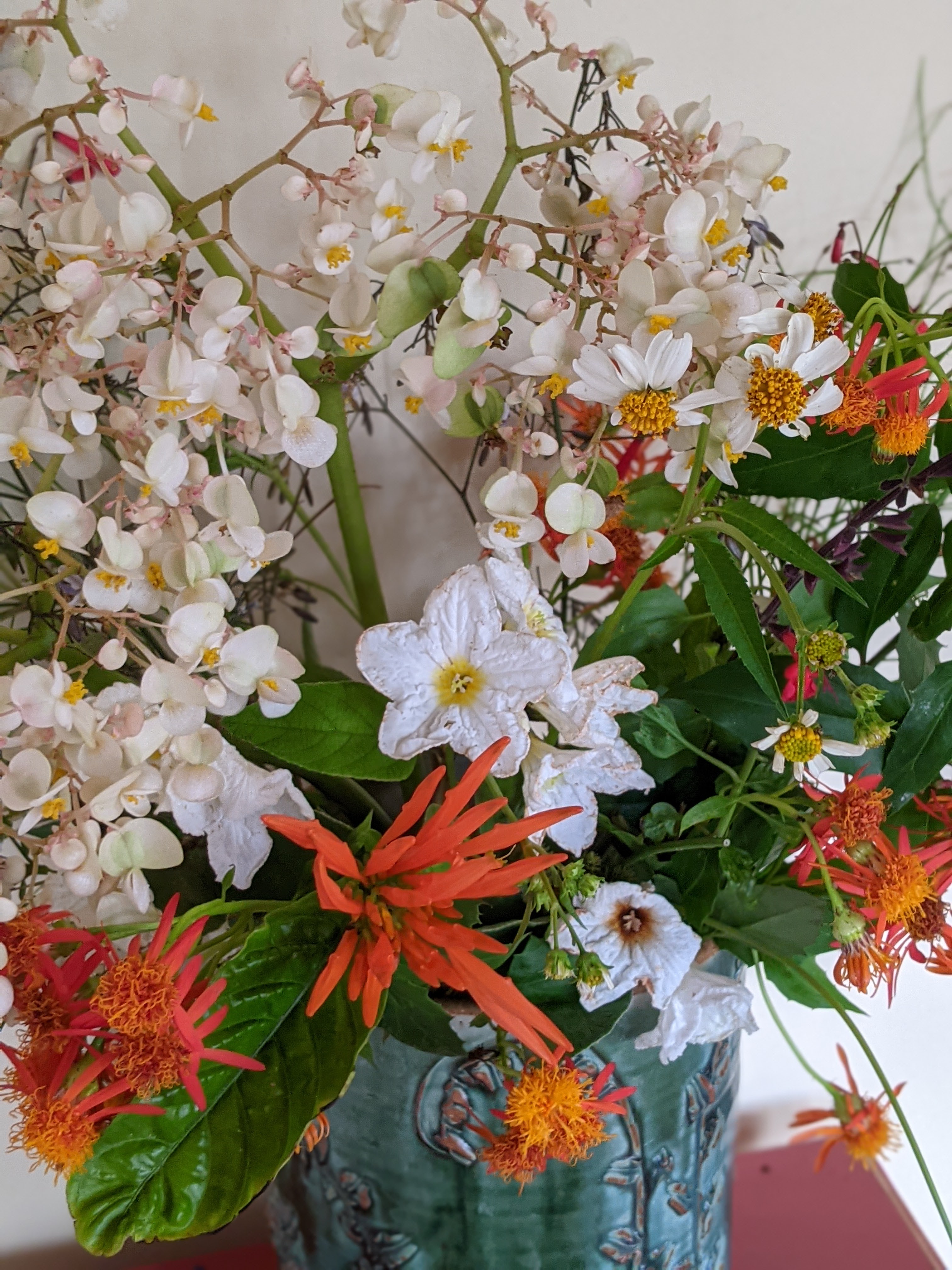 The vase is a pottery wine cooler I picked up in the North Georgia mountains a few years ago. It has been used as a vase more than to cool wine. The Mexican Flame Vine (Pseudogynoxys chenopodioides) that my neighbor has allowed to ramble through the big hedges between our gardens is in full bloom and the butterflies are going crazy for it. The smaller orange flowers are from the Mexican Flame Vine. They are quite fragrant and it is no wonder the insects love them. The larger orange flower is Mexican Honeysuckle (Justicia spicigera). White flowers near the base of the arrangement are White Geiger tree (Cordia boisseriei), another Mexican native. White daisy flowers are from Bidens alba, a Florida native. The white Begonias are another gift from Mexico; Lotusleaf Begonia (Begonia nelumbifolia). There is a bit of Red Firecracker Plant around the edges (Russelia equisetiformis) – yet another Mexican native.