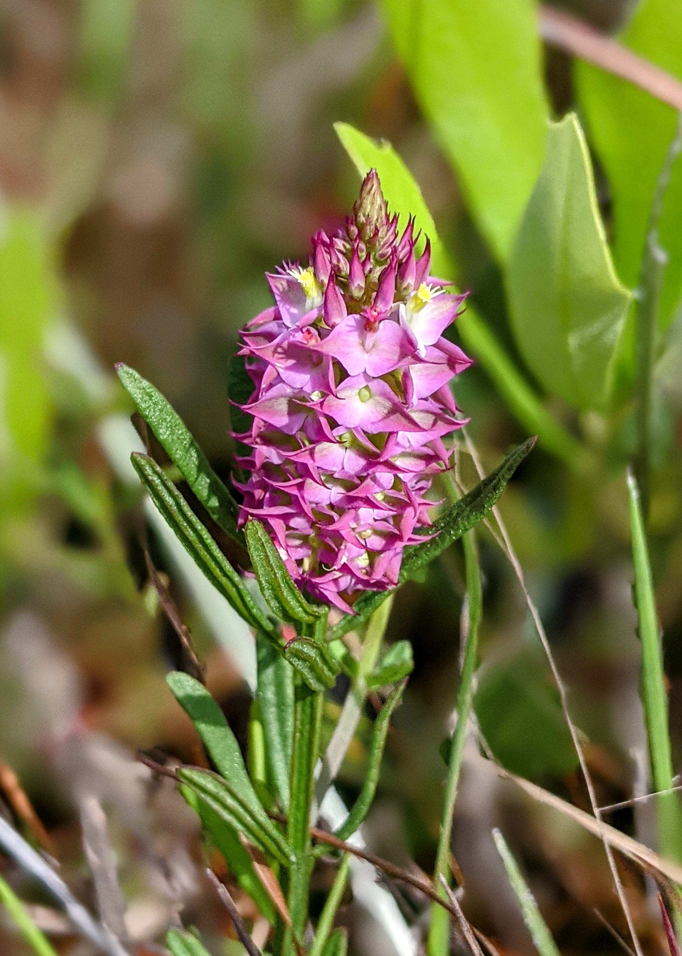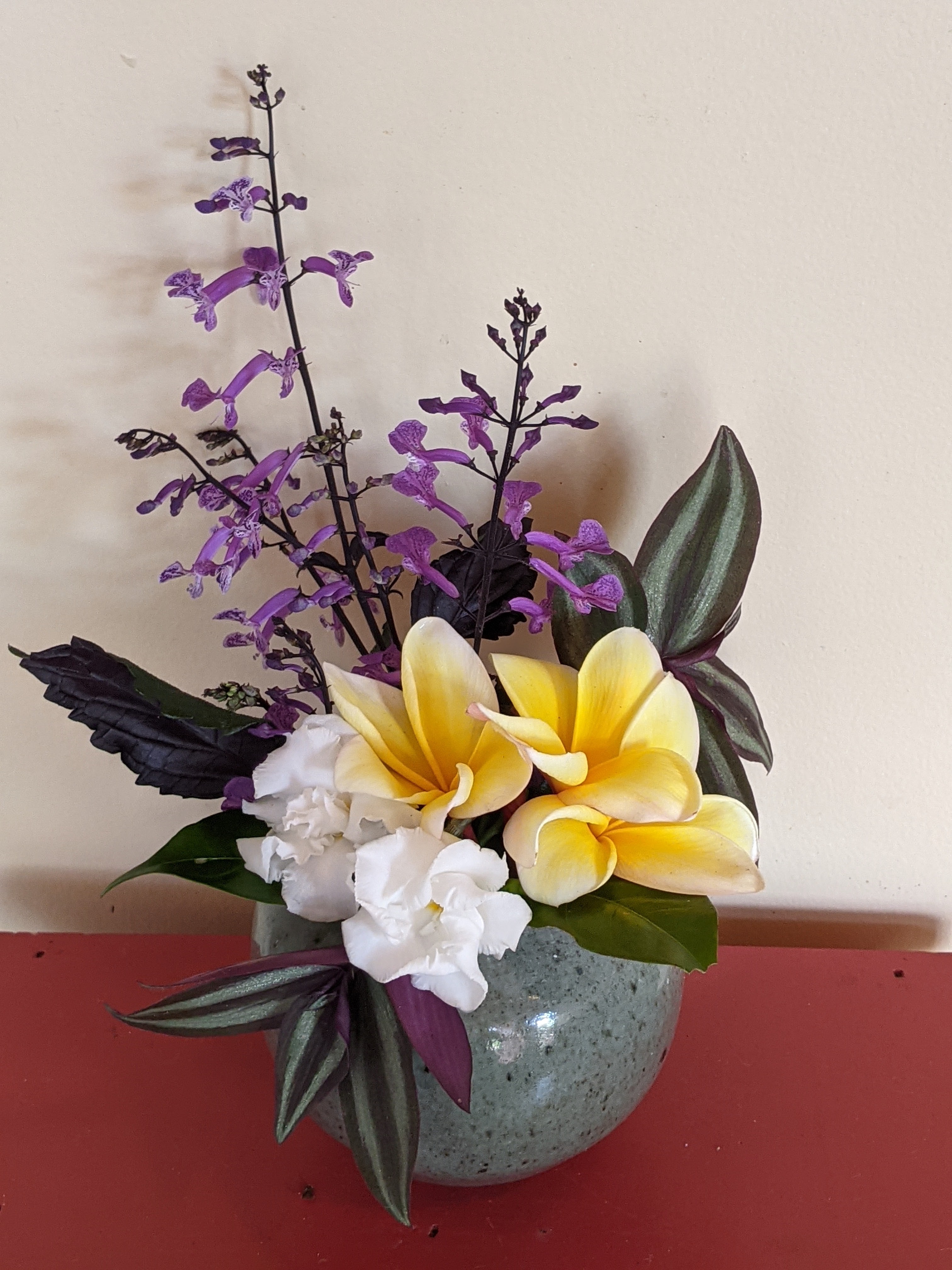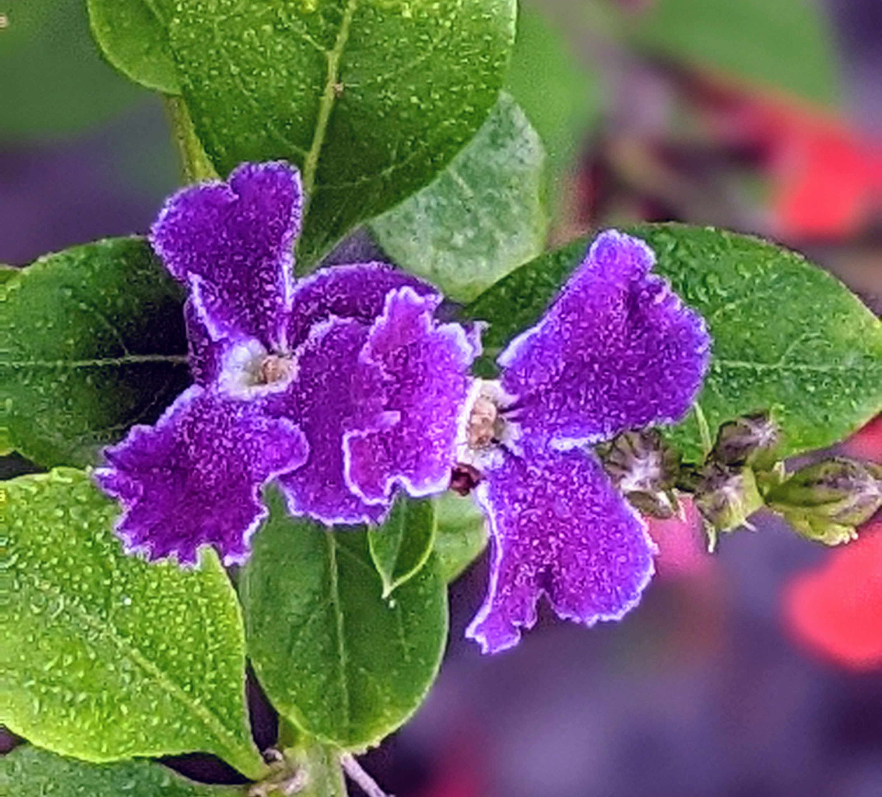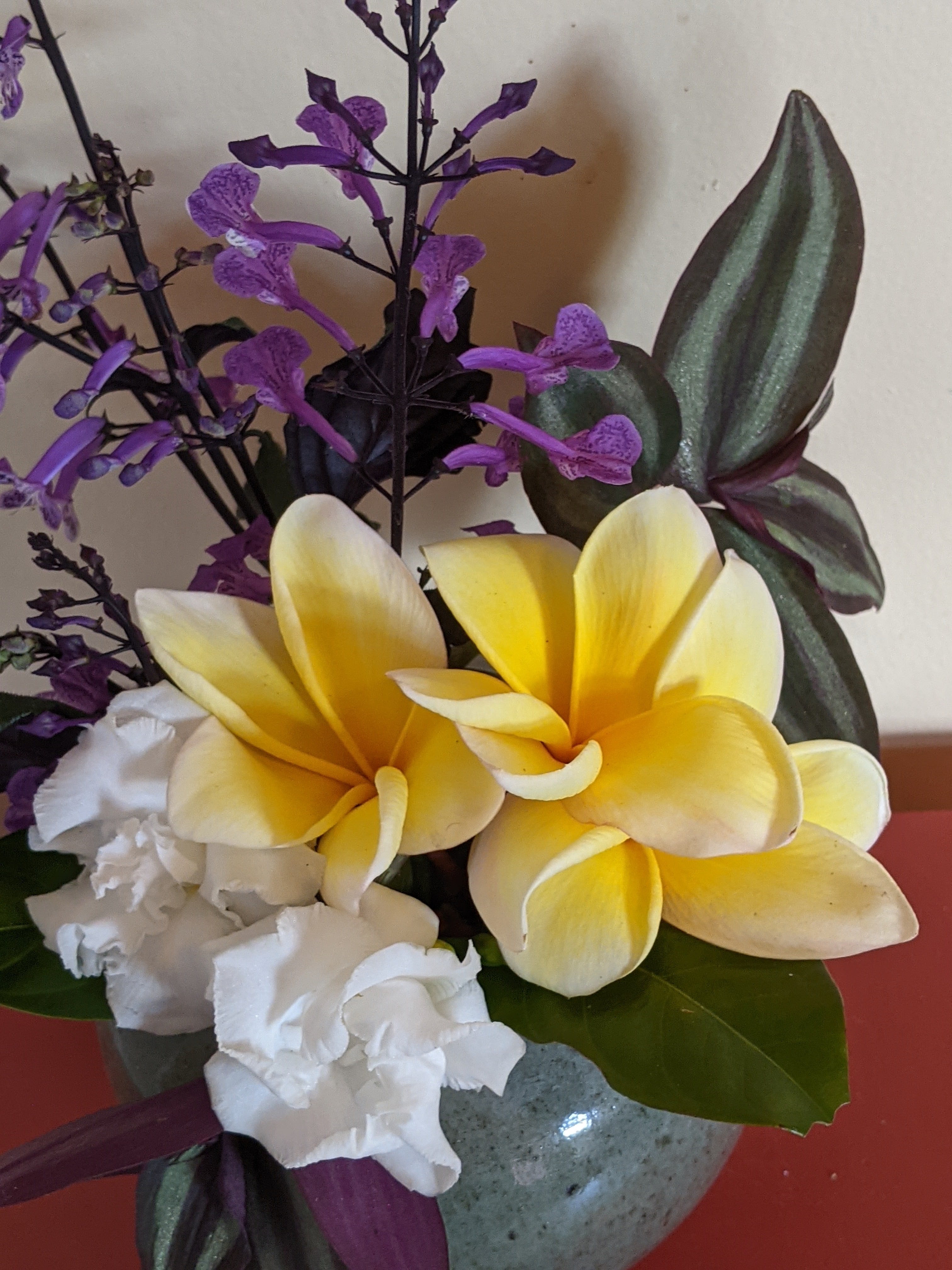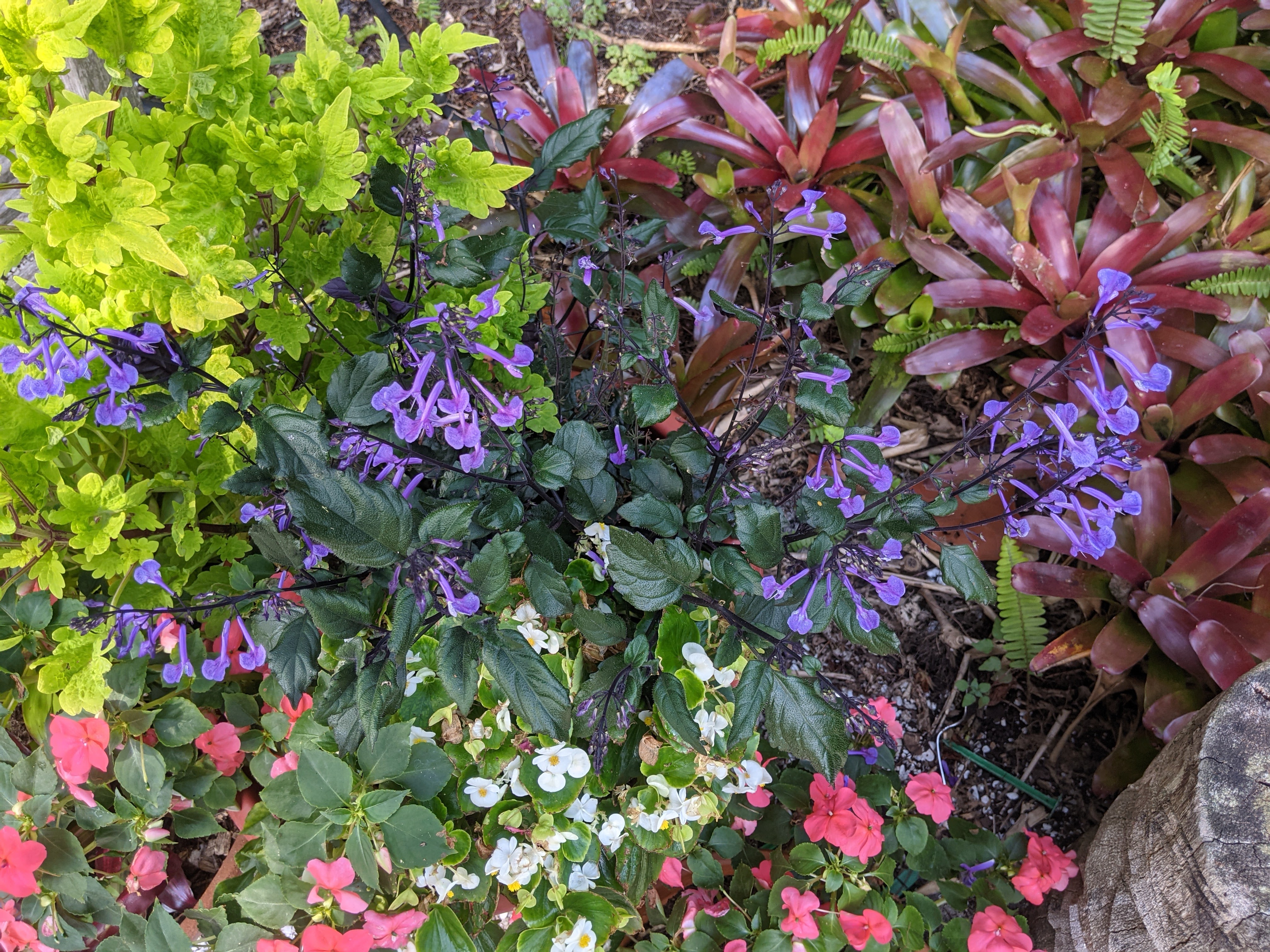 The cast: Two types of white Salvia in spikes. The greyish one is ‘White Flame’ Salvia, a long serving perennial. The other is the white version of Tropical Red Salvia (Salvia coccinea) it is a reliable, reseeding annual. Pink stars are the Perennial Penta (Penta lanceolata), they are much bigger than the annuals and hang around for a few years. The butterflies love them. Pink zinnias are from seeds I grew last year that reappeared in a pot, not exactly sure what they are. In purple, the big flowers are an annual Petunia and the viney stuff is Purple Heart (Transcandentia pallida). Fern is Autumn Fern (Dryopteris erythrosora), something that probably shouldn’t live here, but is perversely happy on the front porch in a pot. I am, too.