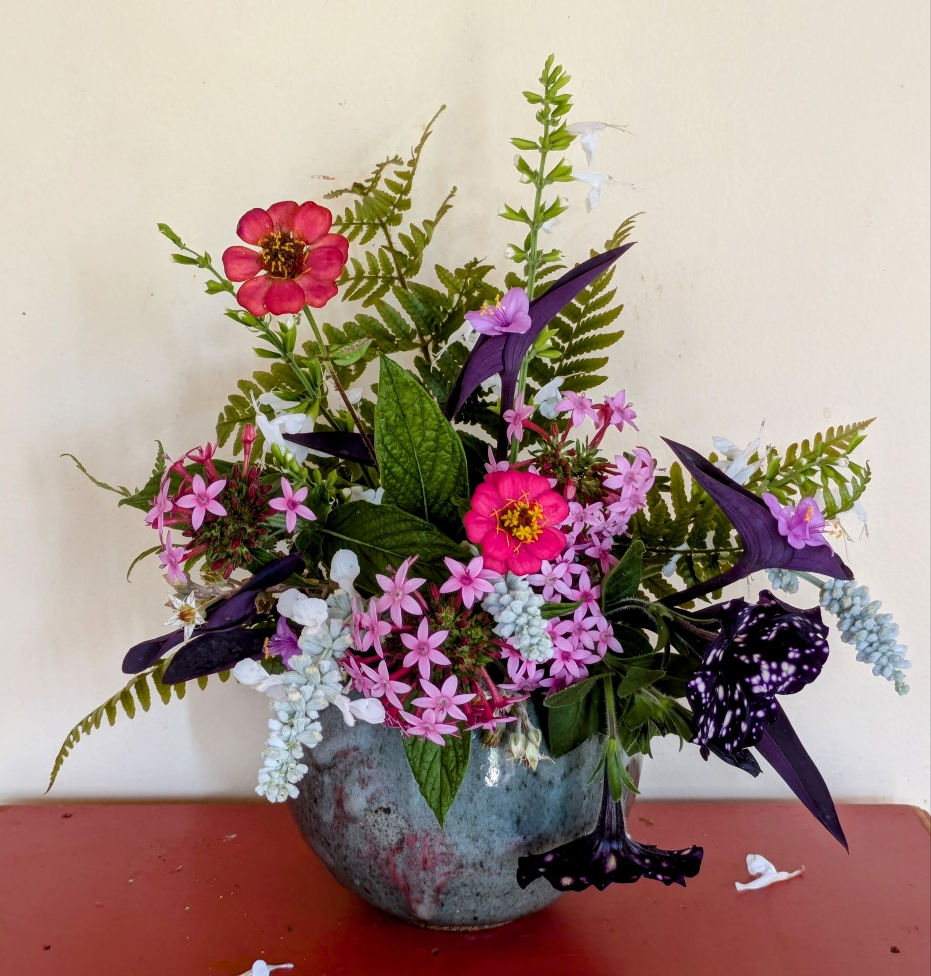 The cast: Two types of white Salvia in spikes. The greyish one is ‘White Flame’ Salvia, a long serving perennial. The other is the white version of Tropical Red Salvia (Salvia coccinea) it is a reliable, reseeding annual. Pink stars are the Perennial Penta (Penta lanceolata), they are much bigger than the annuals and hang around for a few years. The butterflies love them. Pink zinnias are from seeds I grew last year that reappeared in a pot, not exactly sure what they are. In purple, the big flowers are an annual Petunia and the viney stuff is Purple Heart (Transcandentia pallida). Fern is Autumn Fern (Dryopteris erythrosora), something that probably shouldn’t live here, but is perversely happy on the front porch in a pot. I am, too.