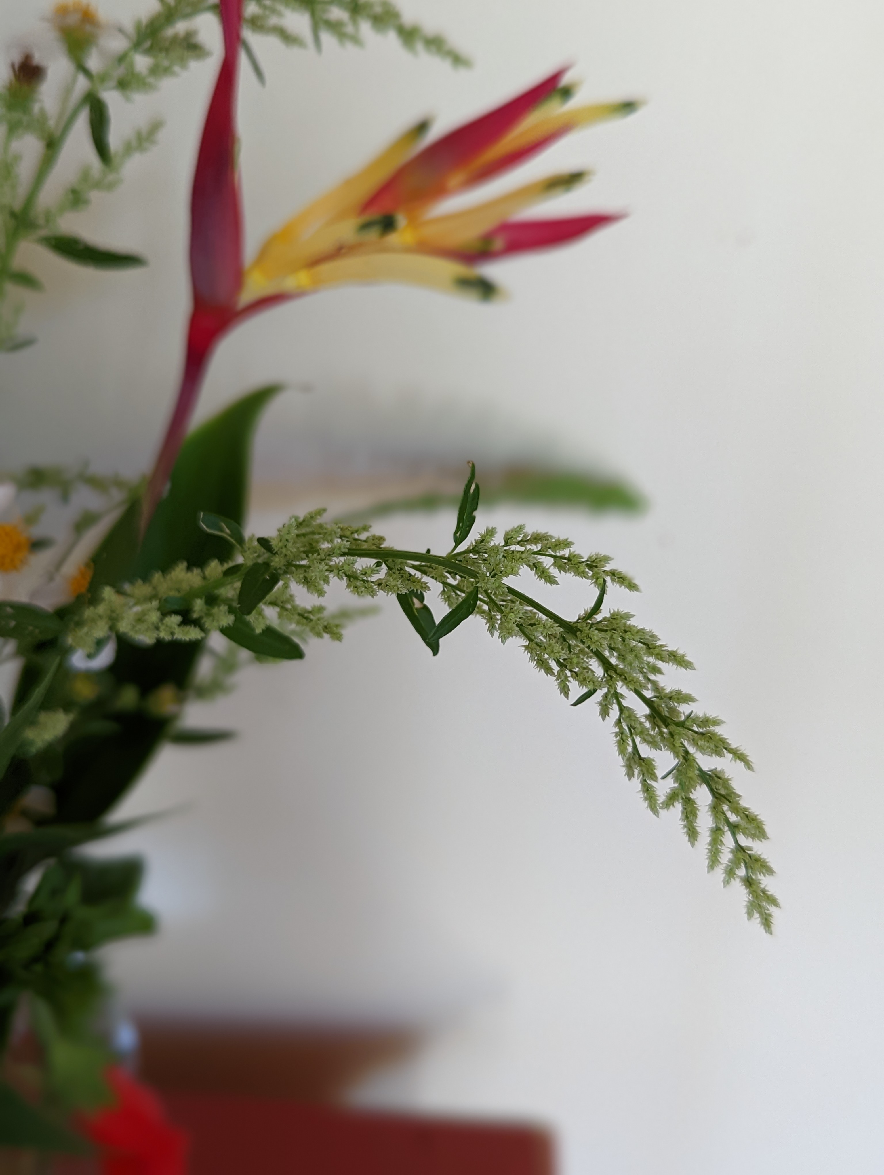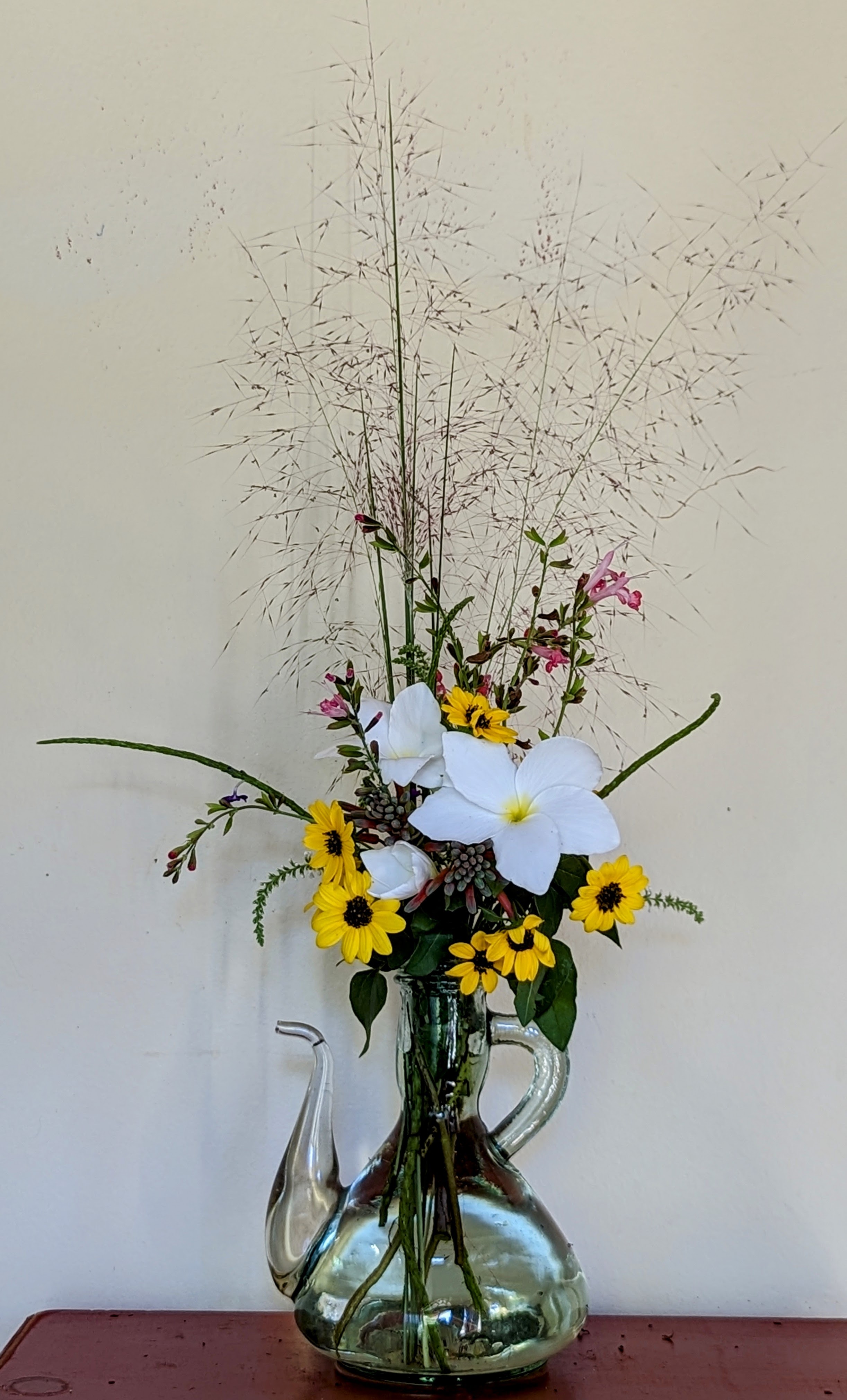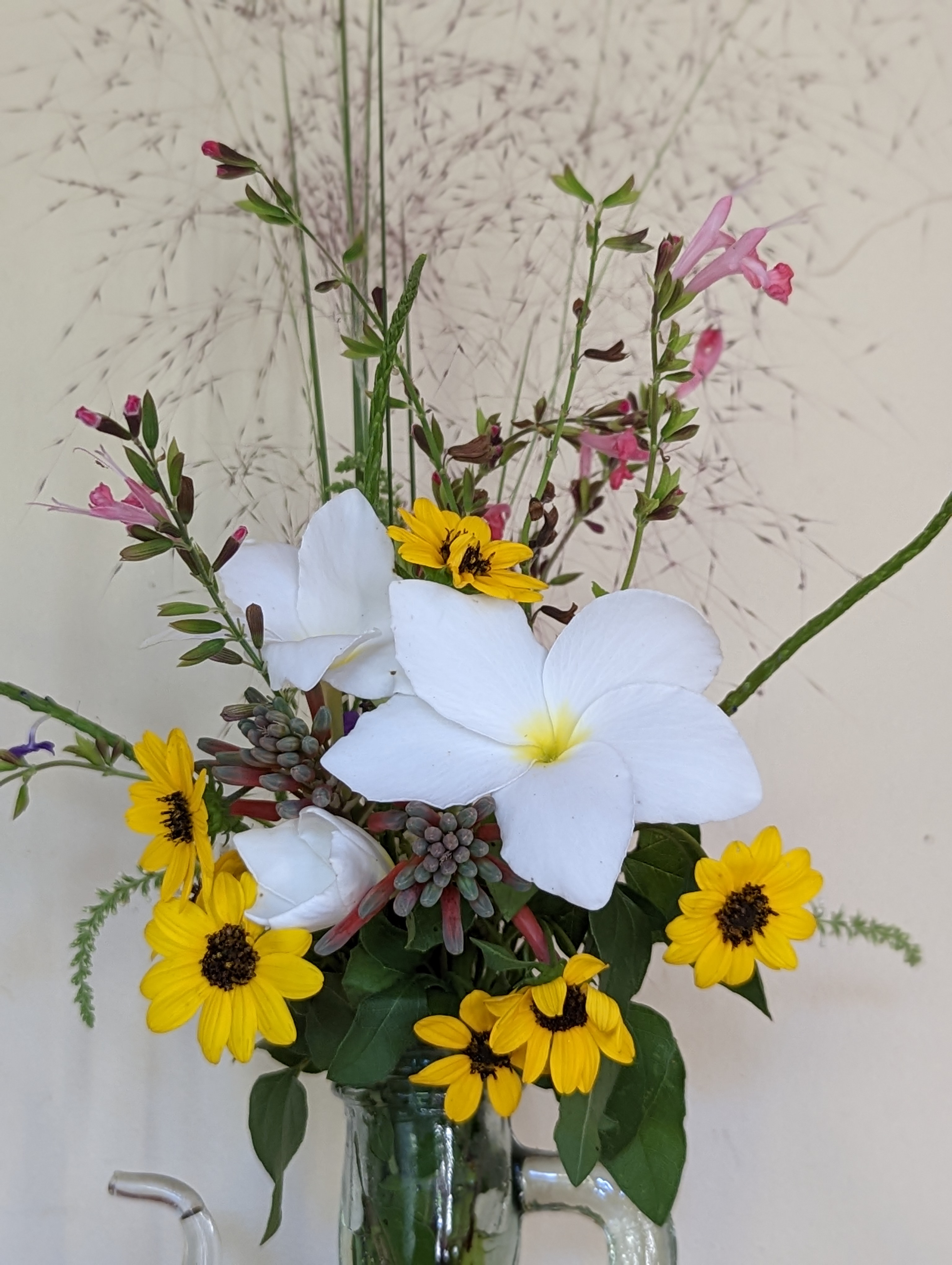 Yellow flowers are Thyrallis (Galpinia glauca). The inspiration plant, hanging over the side, is Coral Vine (Antigogon leptopus). The vase was made by the Ute people in the Southwestern US.