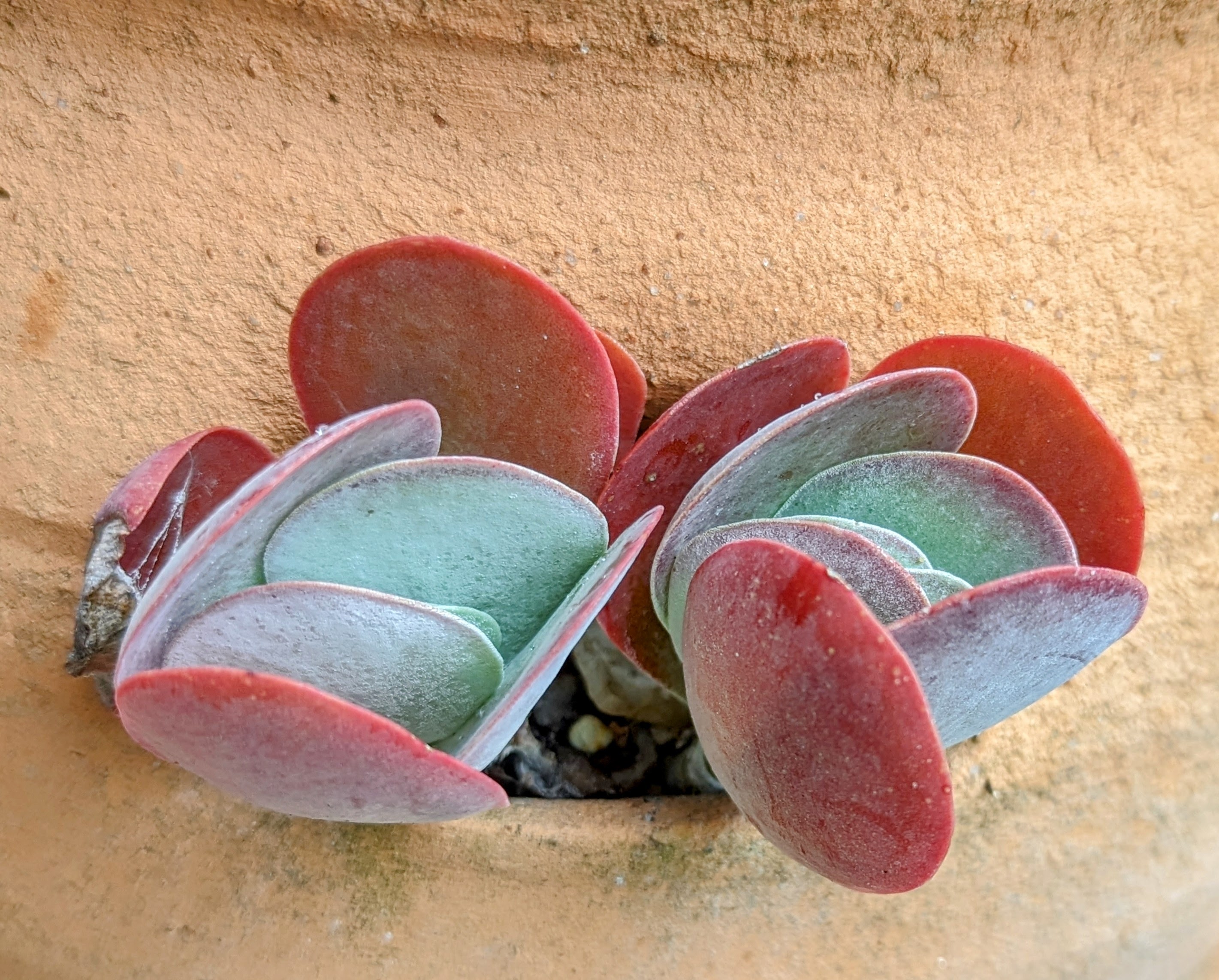 The indestructible Graptosedum. I dropped a leaf in my bookcase and it sprouted. I use these as pseudoroses in flower arrangements. This one lives in a pot with Fireball Neoregelia Bromeliads and a Desert Rose. Never watered and rarely fertilized.