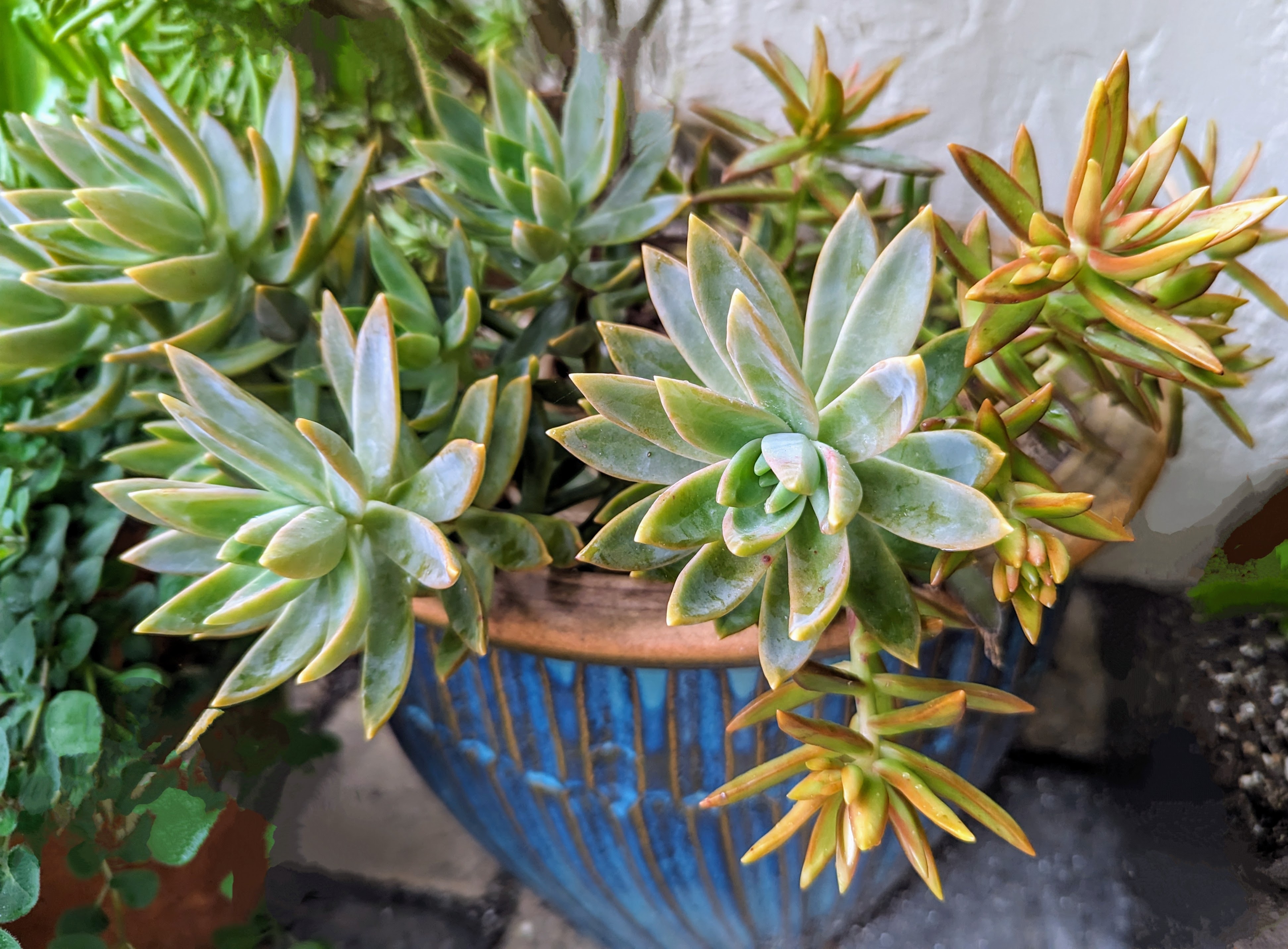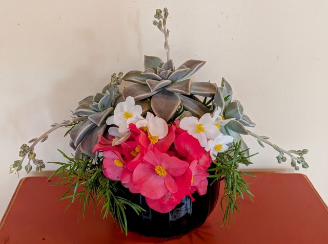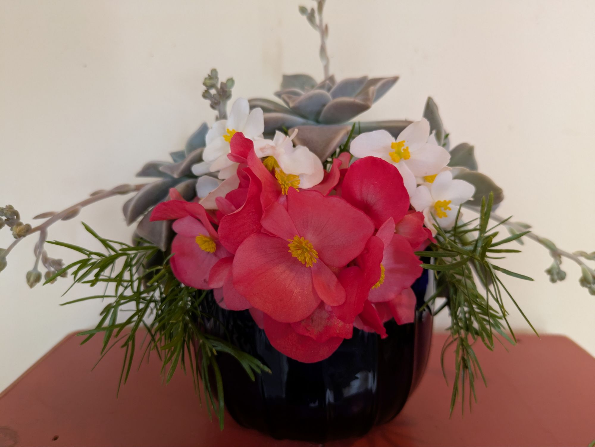 Oddly and unintentionally, this vase turned out red, white and blue. The blue vase, a long ago Christmas gift from my brother. Big Pink and Big White Begonias provide focal points and color. Graptosedum succulents add structure and color. Green accents are from invasive Asparagus fern I can’t quite bring myself to get rid of.