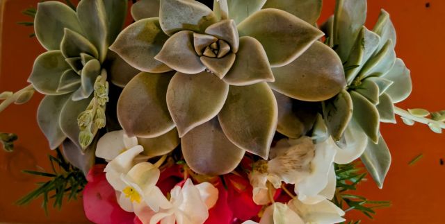 The grey “flowers” are the succulent Graptosedum and I added a few sprigs of another type of sedum, I am not sure which one. Burgundy foliage is a ‘Fireball’ Neoregelia Bromeliad pup; orange and red flowers are the dried flowers of Aechmea rubens Bromeliad. There are a few sprigs of Muscadine grapevine in the back of the arrangement.