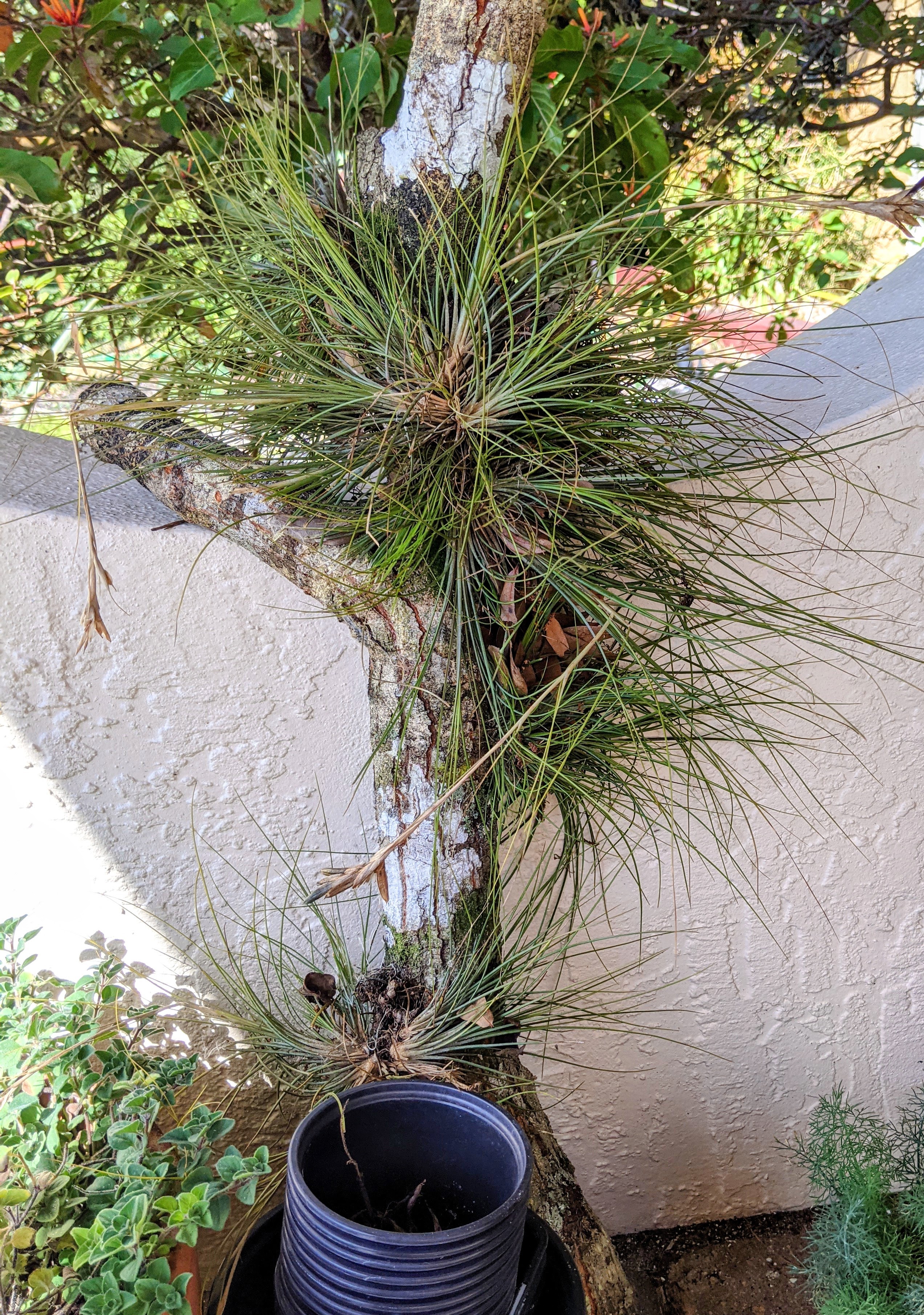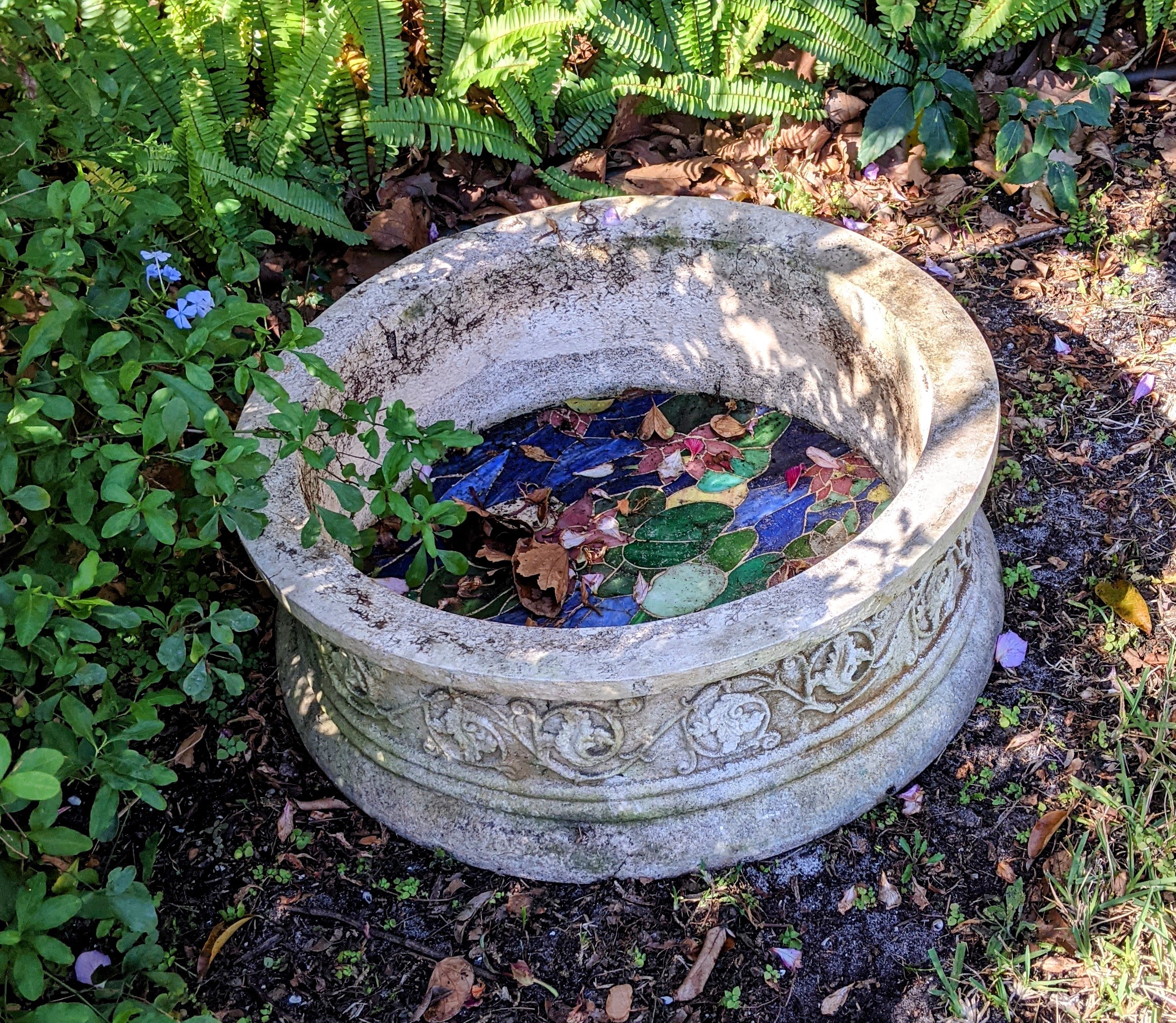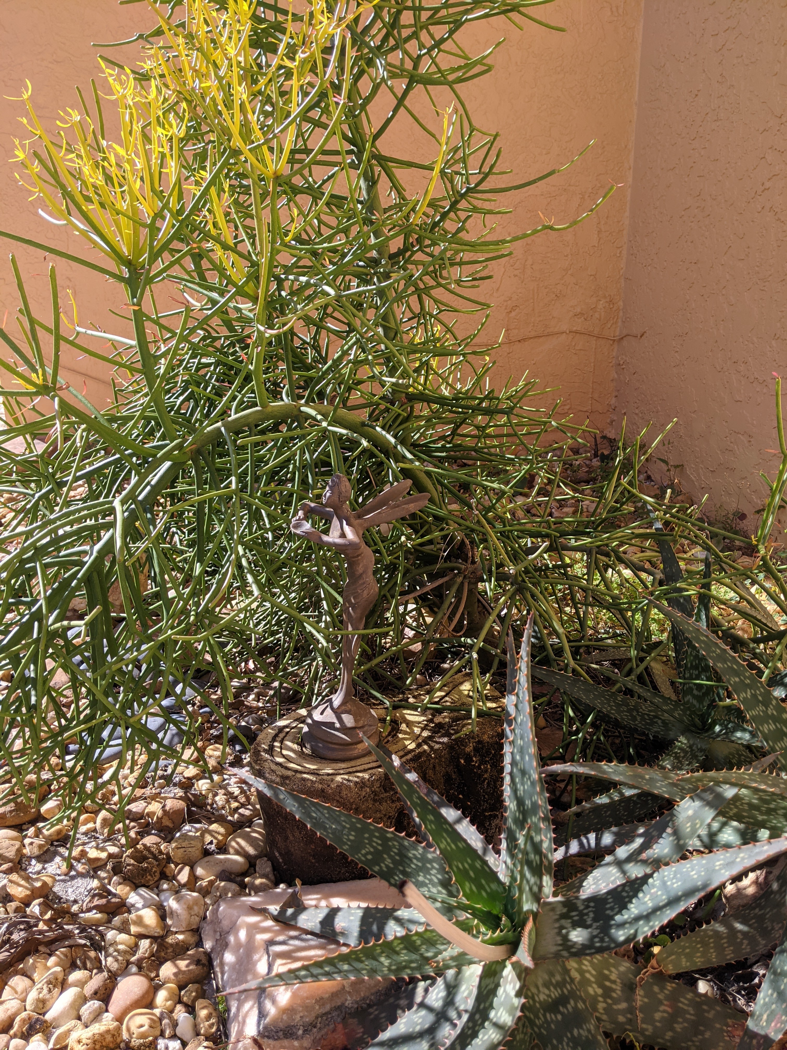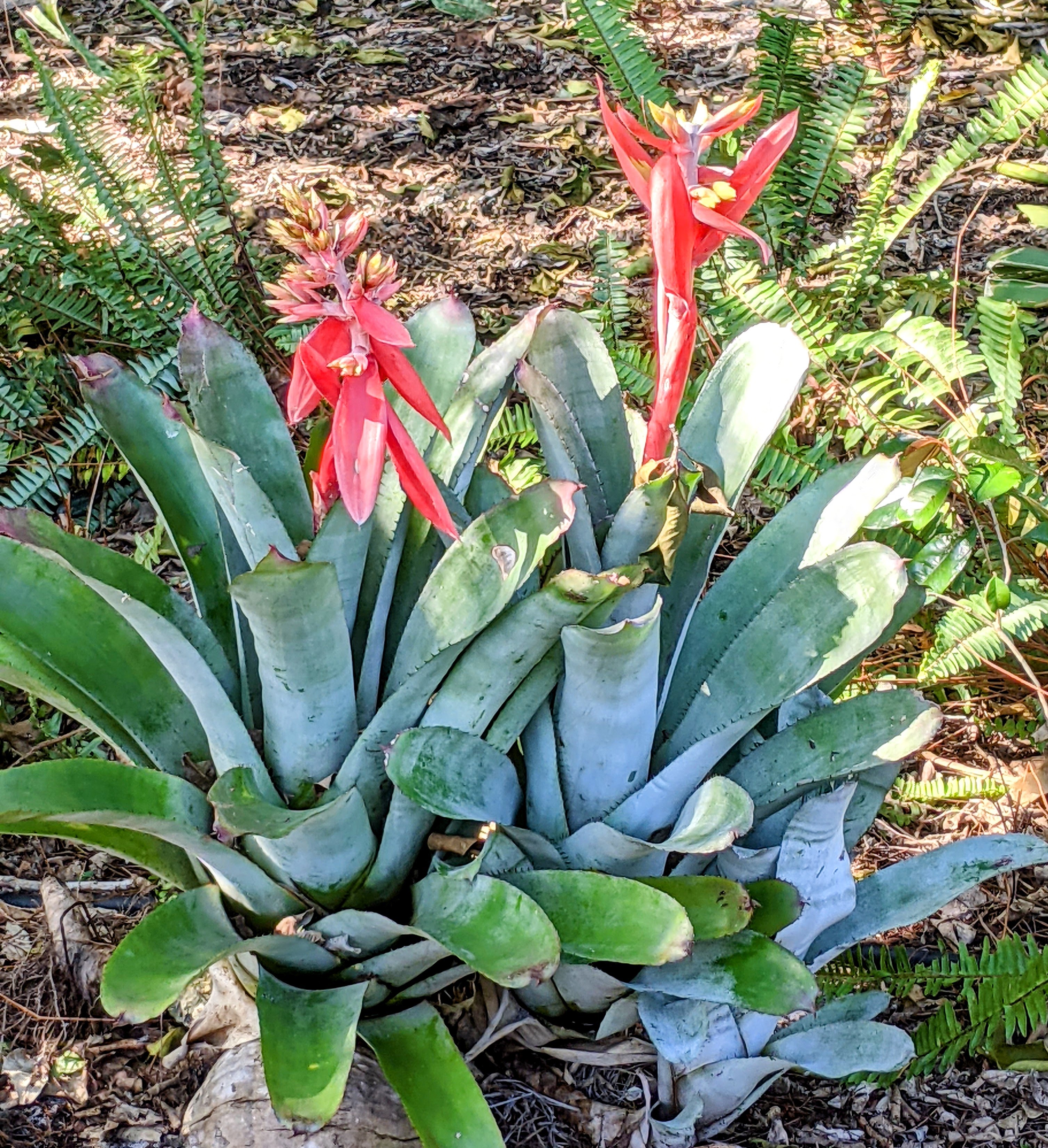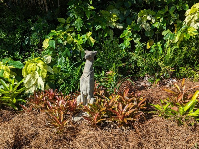 Mulching the bromeliad beds with the leaning greyhound standing guard. Straightening the statuary is next on the list. The bromeliads were moved last spring and have been established over the summer.