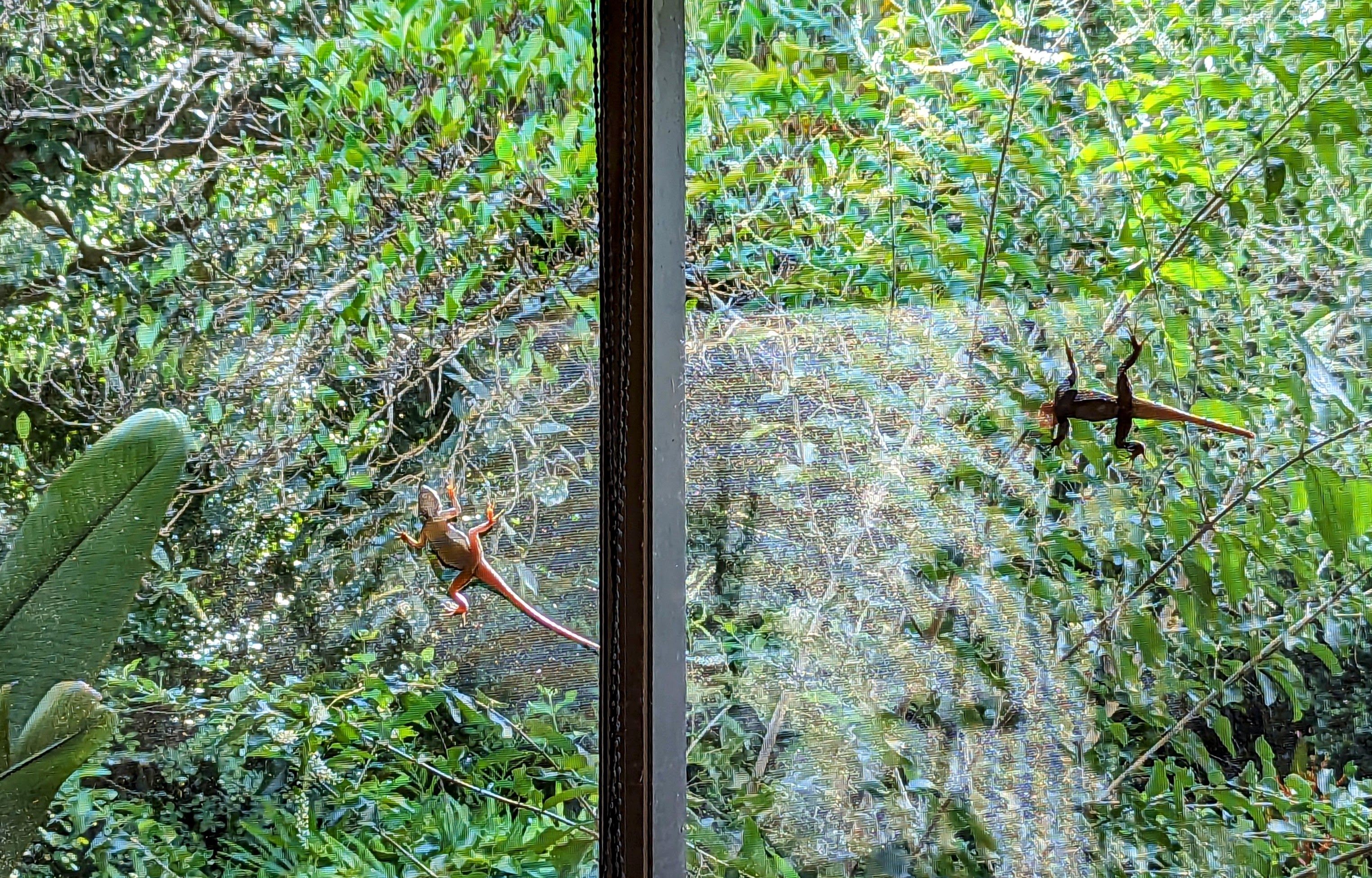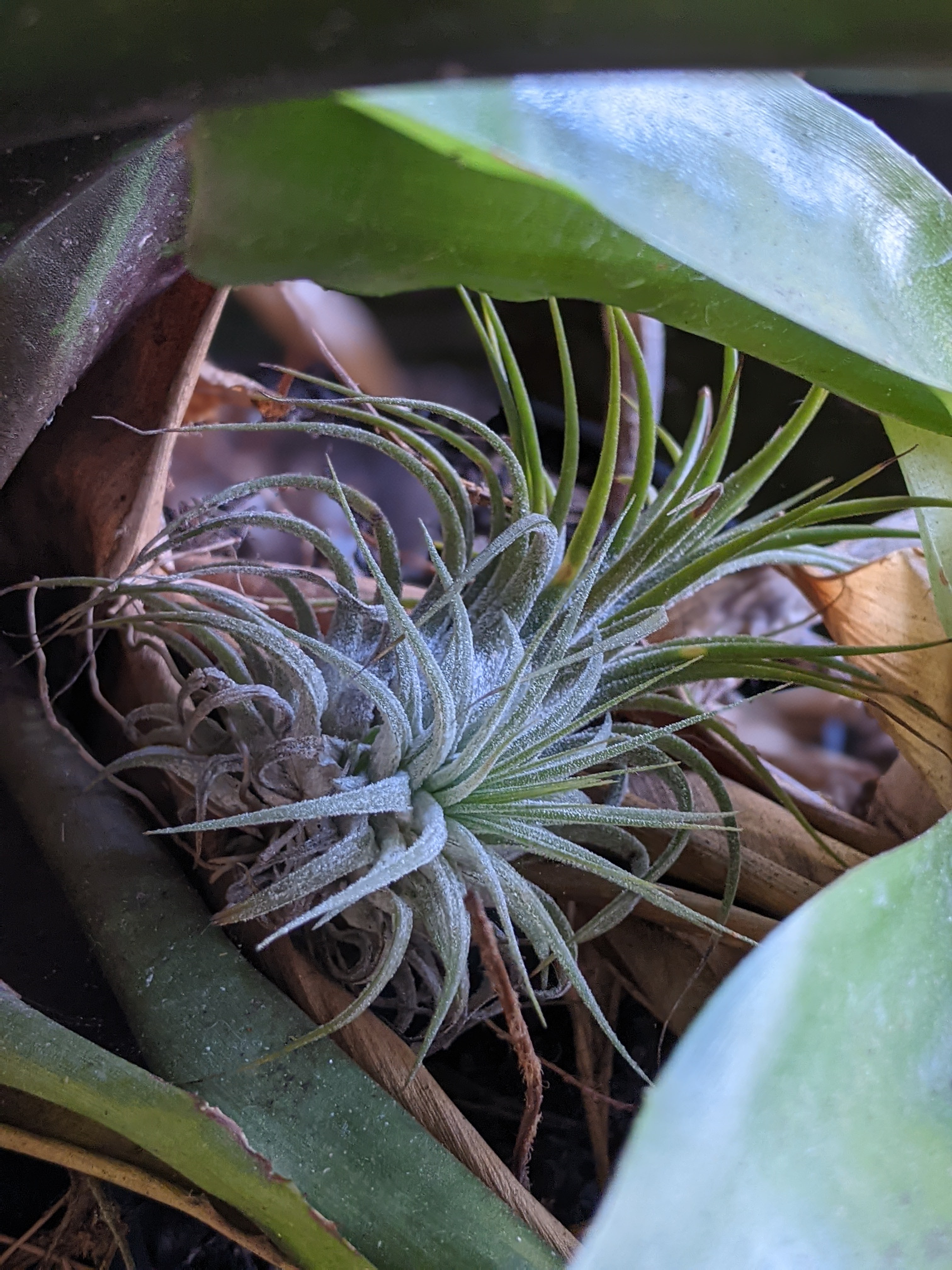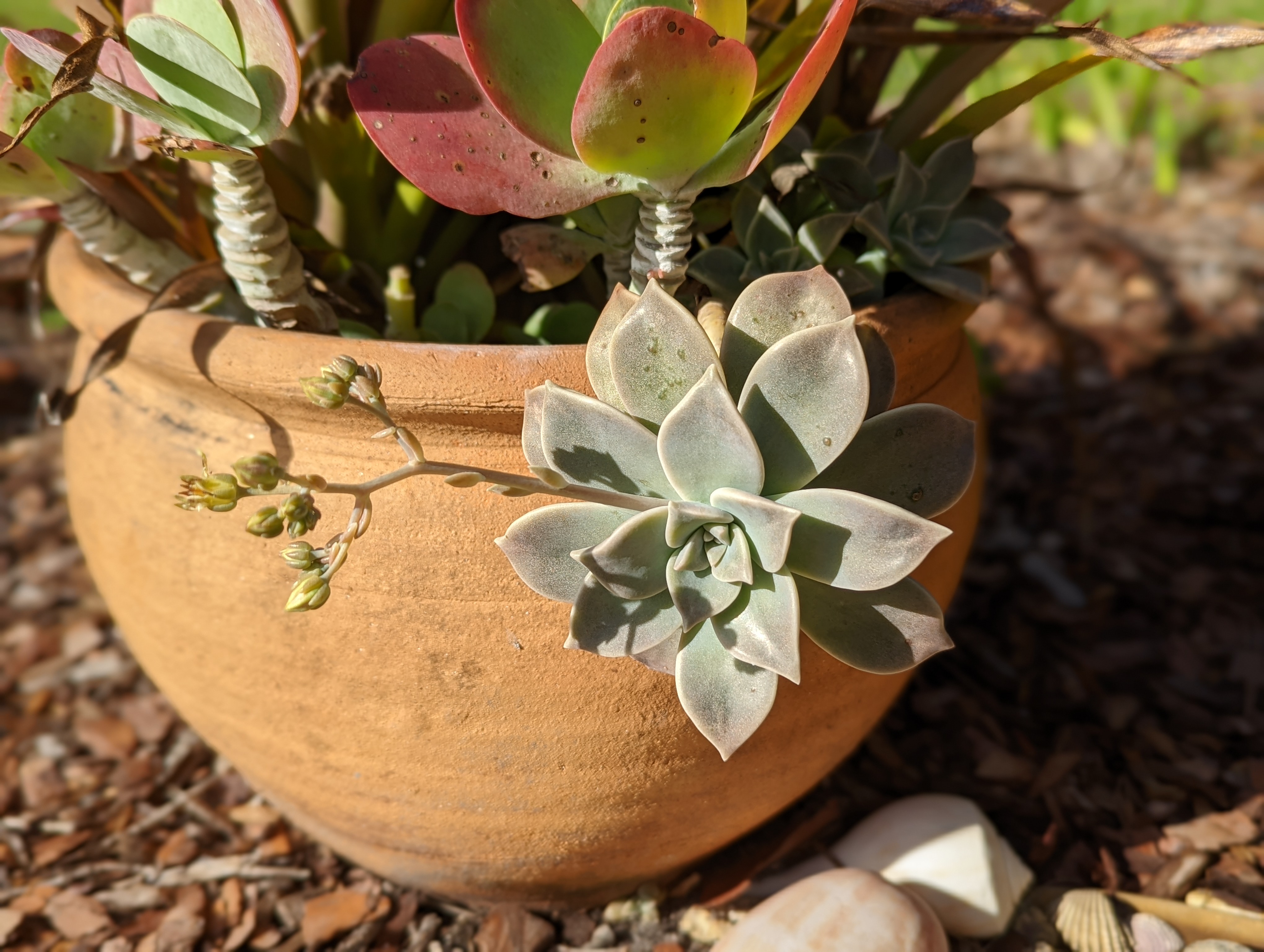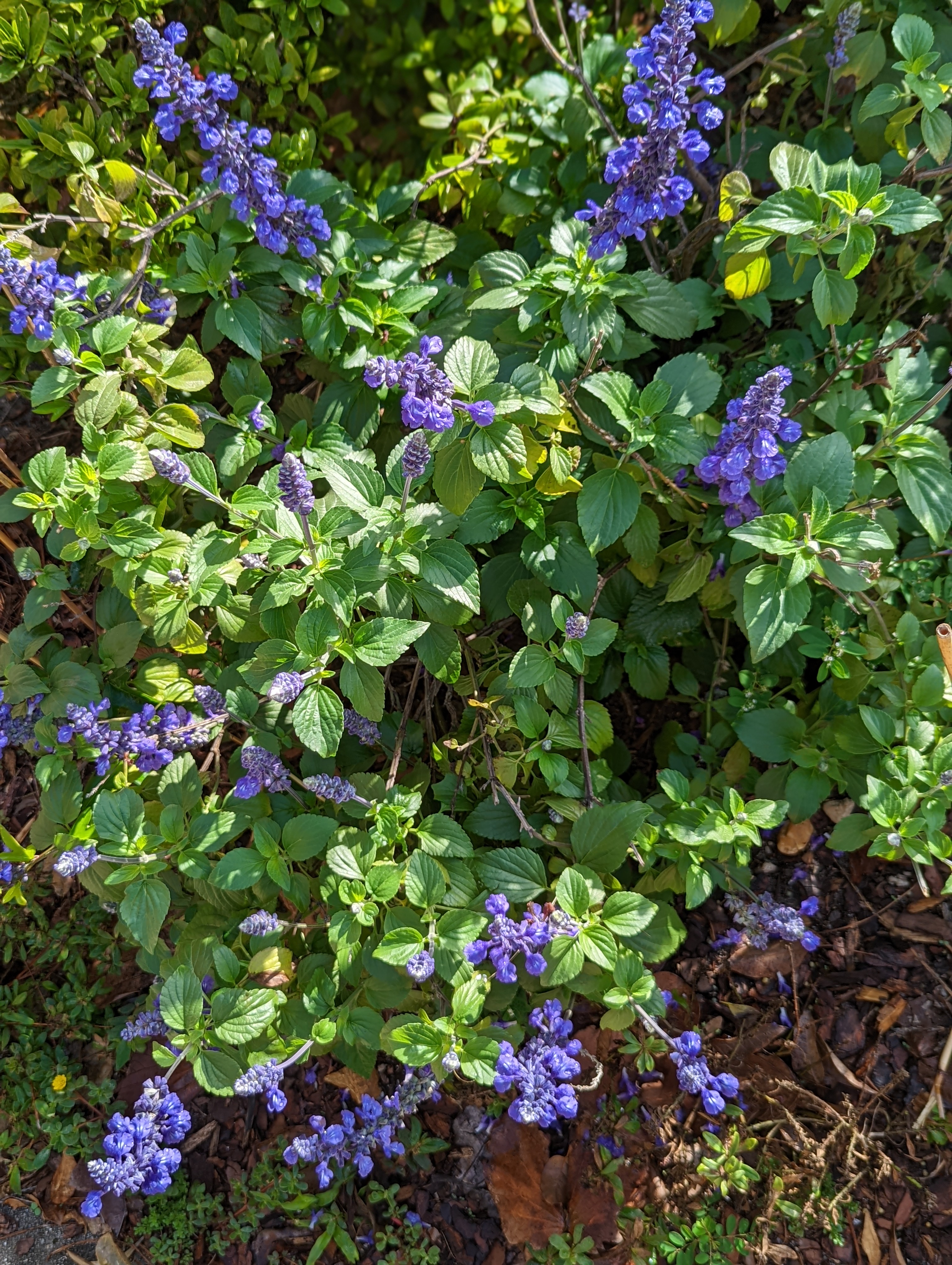 Mulching the bromeliad beds with the leaning greyhound standing guard. Straightening the statuary is next on the list. The bromeliads were moved last spring and have been established over the summer.