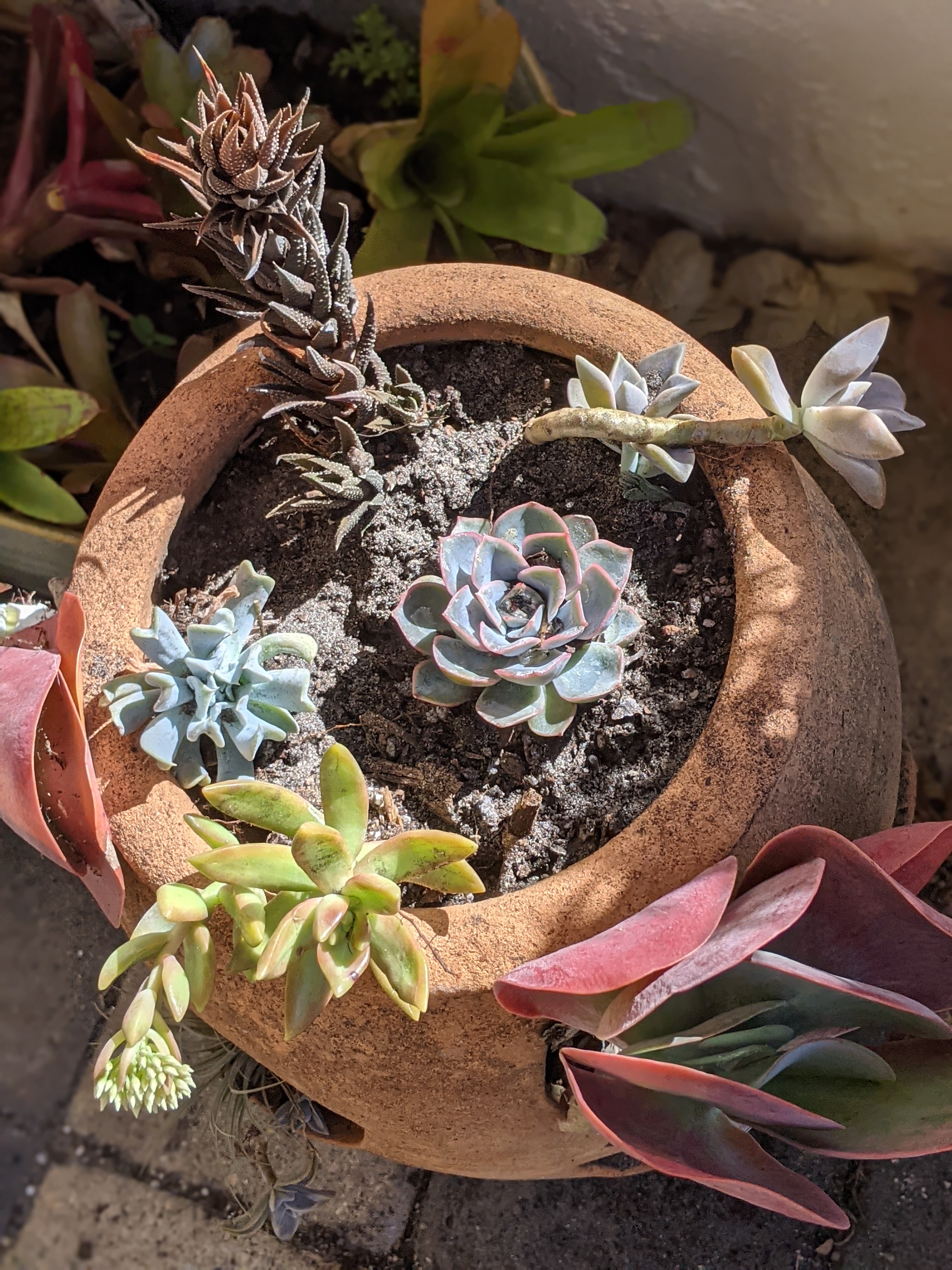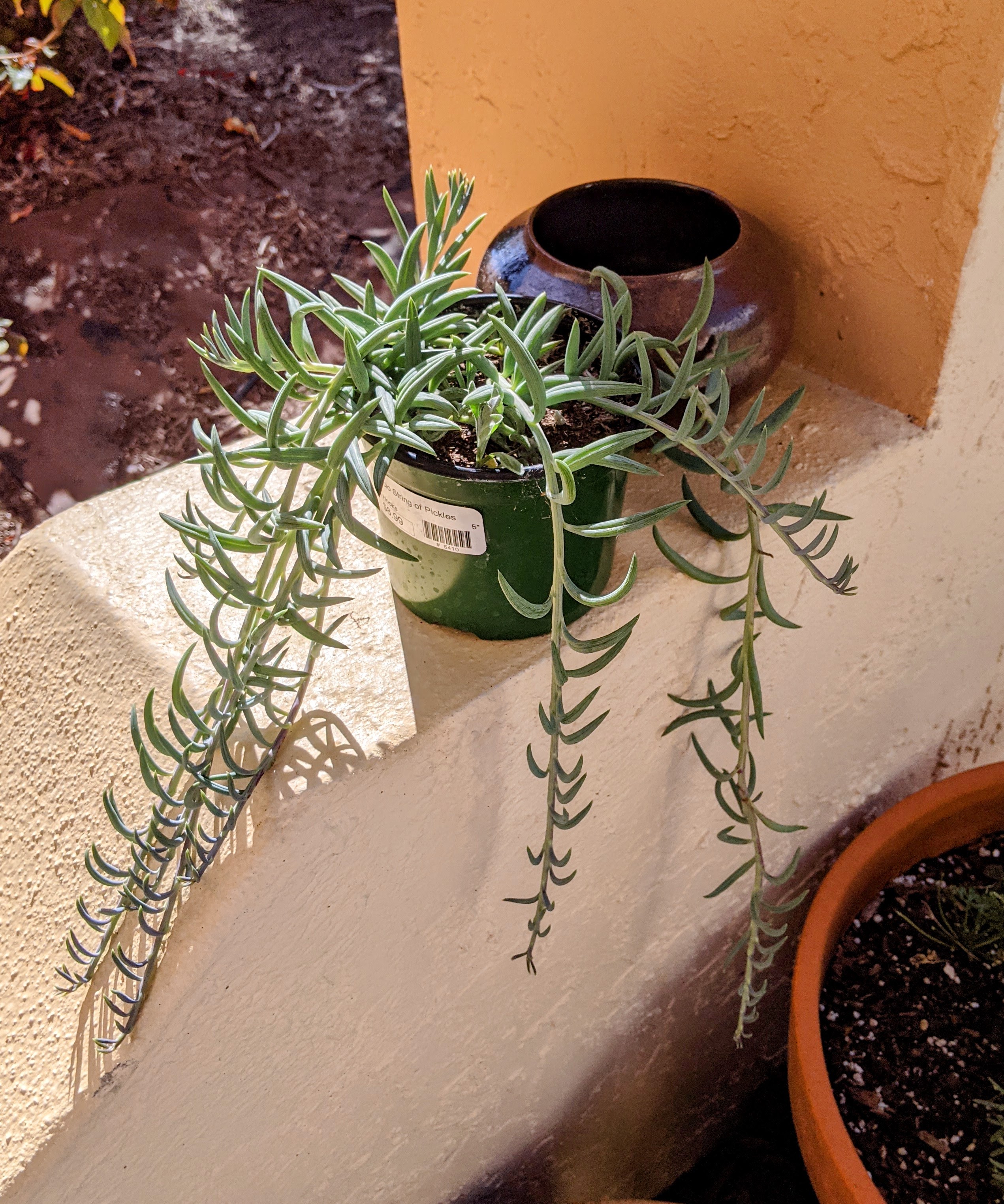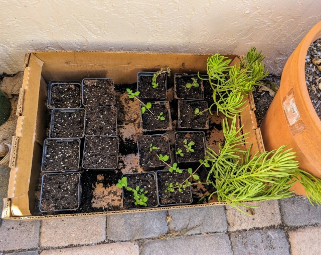 The box of perennials I planted last week has been refilled with fresh soil and planted with Senecio and Turkeytangle Frogfruit cuttings. Senecio is the succulent. The Frogfruit is to fill in my slowly growing lawn replacement. Seeds for dill, basil and tomatoes were planted. I bought some thyme seed, but did not realize how long it takes to germinate (28 days) and decided to buy a plant.