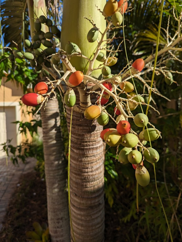 The berries. These are the fruits of the Christmas Palm (Adonidia merrilli) By Christmas they will be completely red and resemble ornaments for the tree.