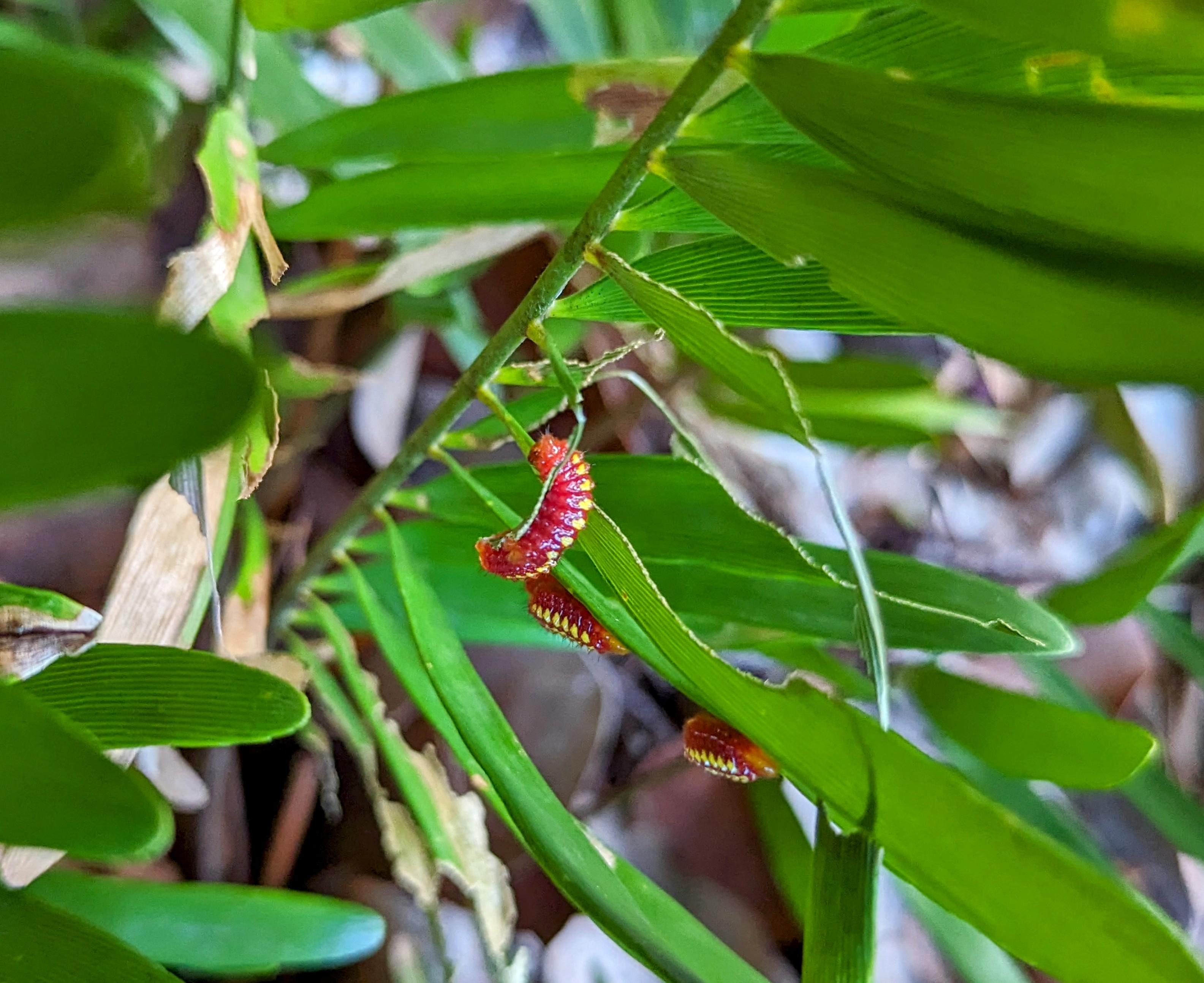 Atala butterflies are back in garden. These are the caterpillars consuming their only host plant, the Coontie cycad (Zamia integrifolia). I hope to get some butterfly pictures, Atalas have a fluorescent orange body with black wings streaked with turquoise.