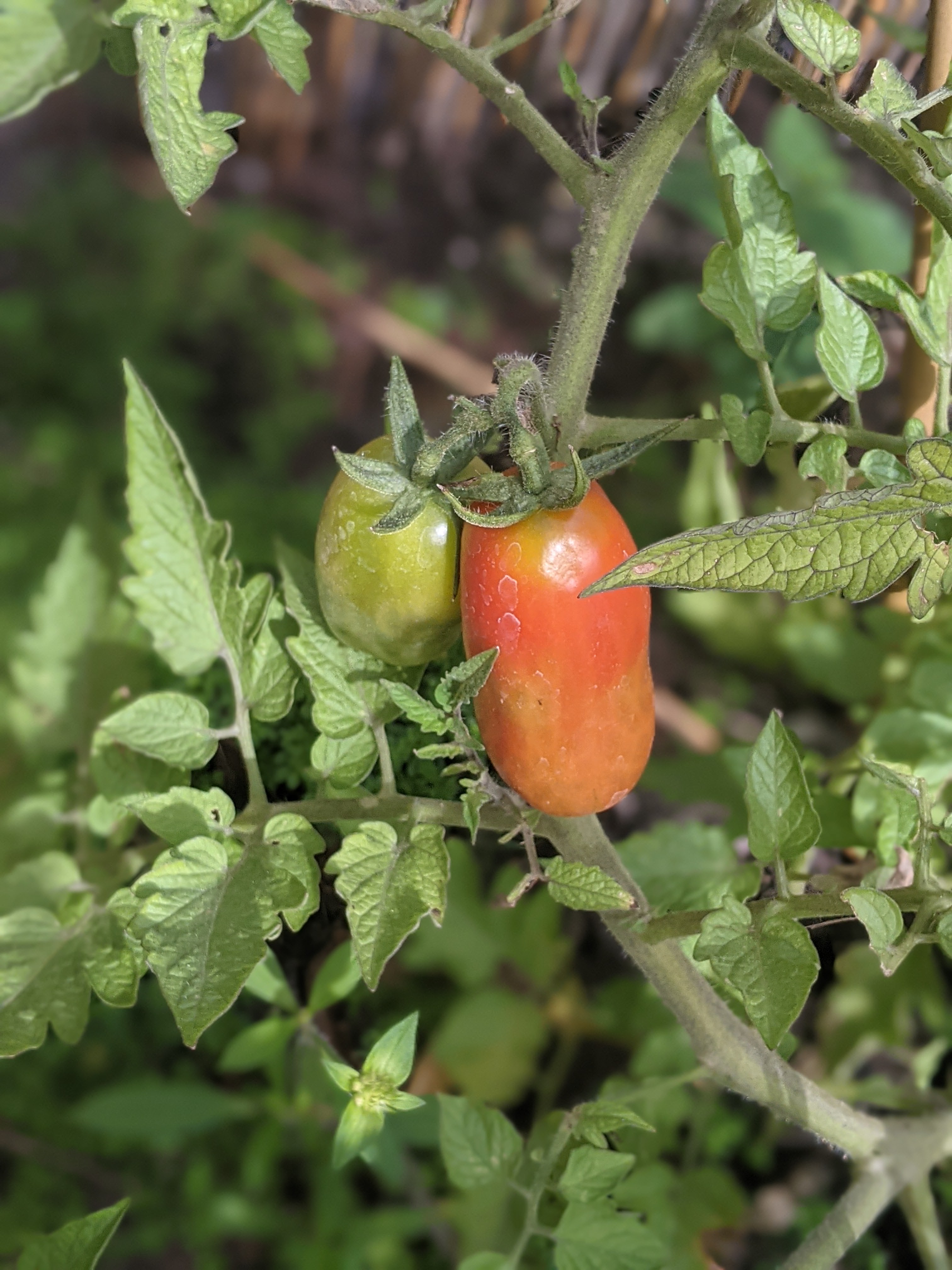 My first tomatoes are ripening, this is a San Marzano, I am looking forward to tasting it. Yellow Pears have been good.