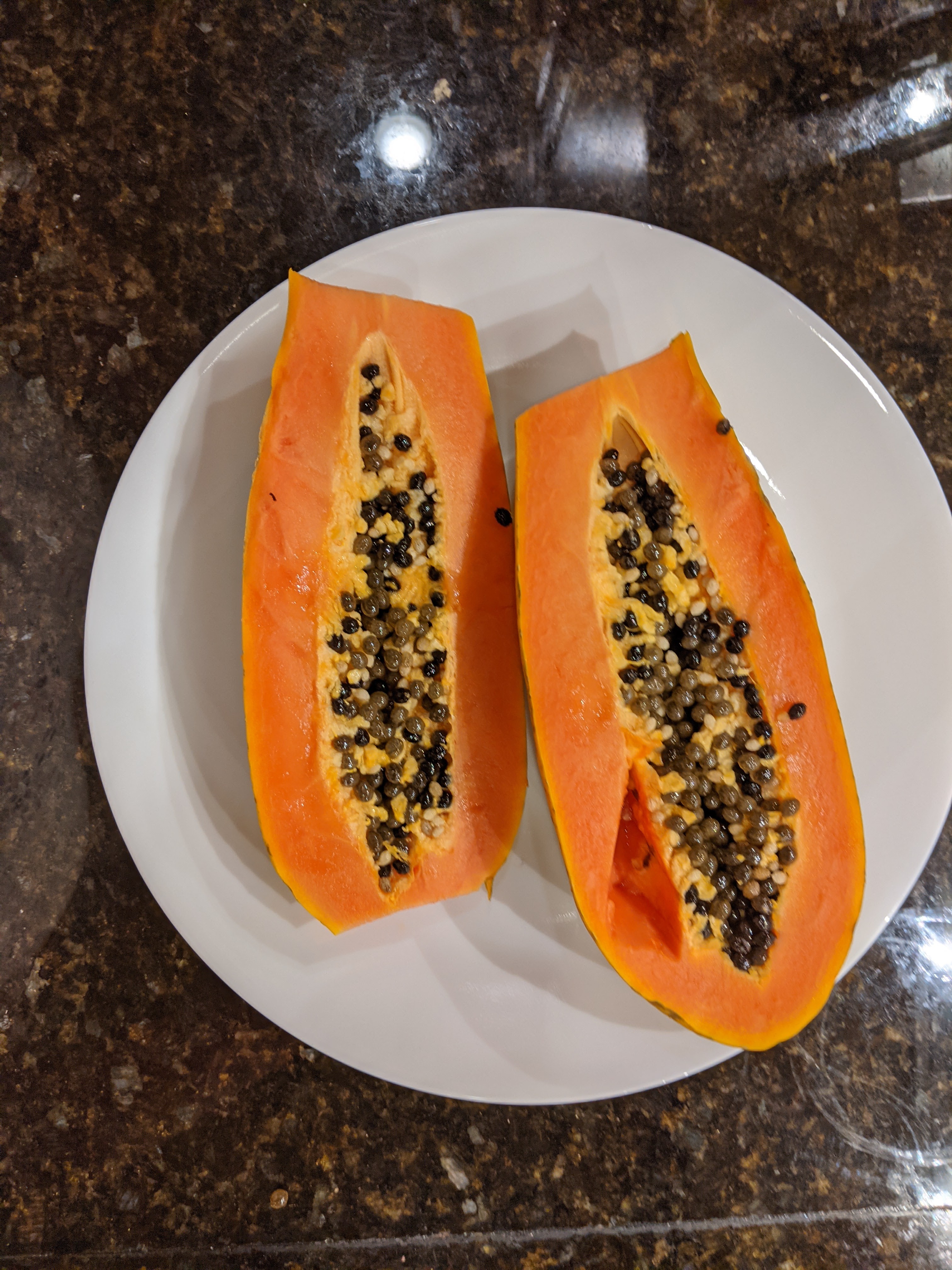 It’s Papaya time in South Florida. I usually have two crops, the Summer crop inevitably is eaten by the dreadful Papaya Hornworms and I eat the winter crop. This is an unknown variety grown from seed from a fruit a neighbor gave me. I planted the seed in 2016, the tree is probably 18 feet tall now and I had to use a pole saw to pick the fruit. The first fruit I picked with a leaf rake, poking holes in the side. That one rotted before it ripened – another neighbor took it to plant seeds for tree. Interestingly, Papayas have three sexes, male, female and hermaphodite. You hope for a hermaphrodite tree as the others are not self pollinating. Named cultivars self pollinate, growing them from seed is a gamble. Another neighbor planted a male tree soon after I planted mine, so I am not sure what it is.
