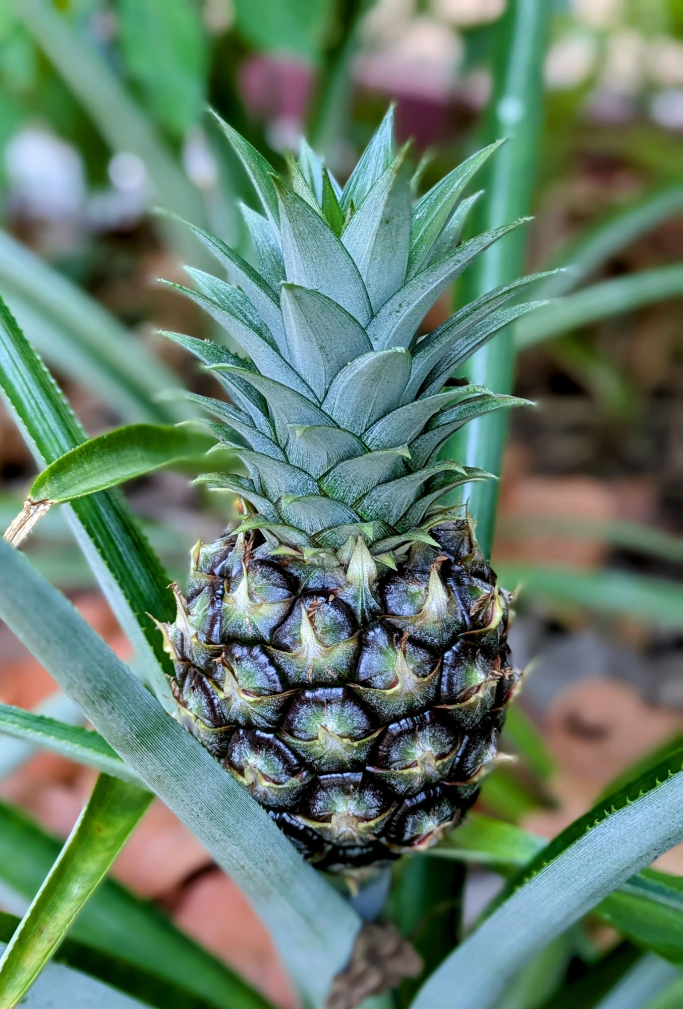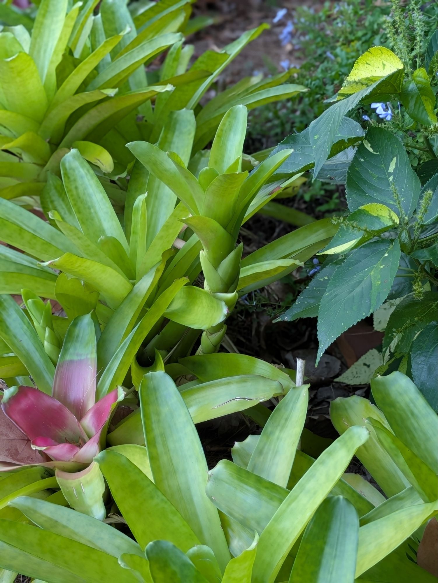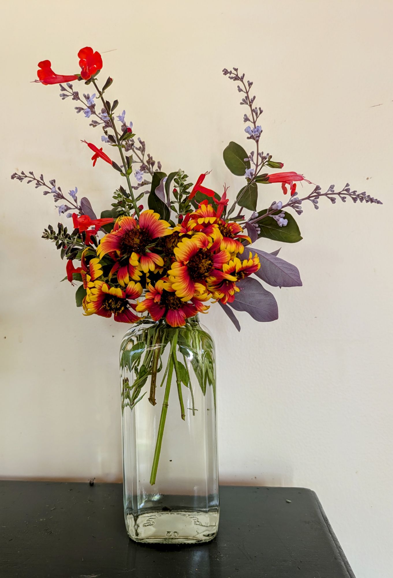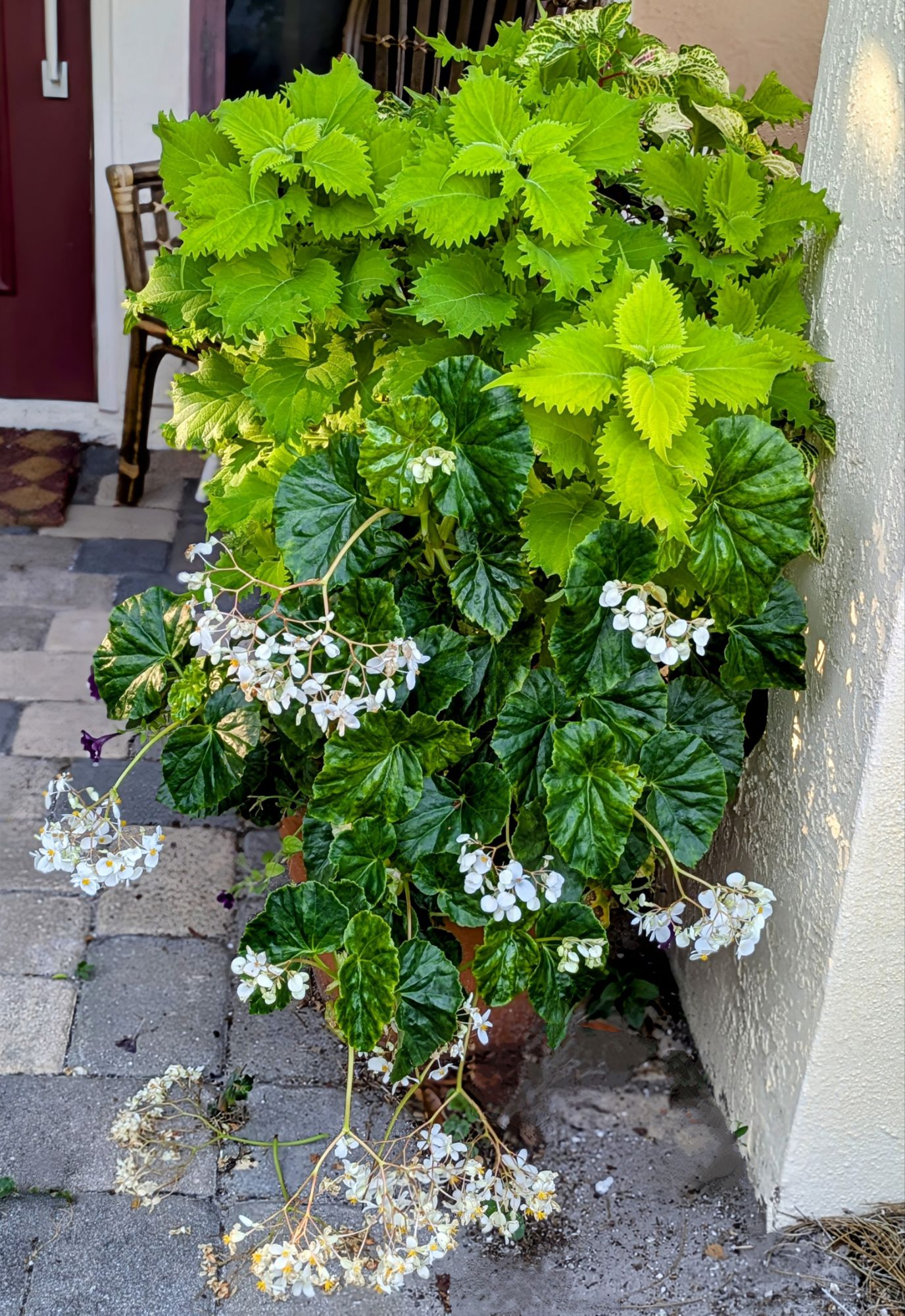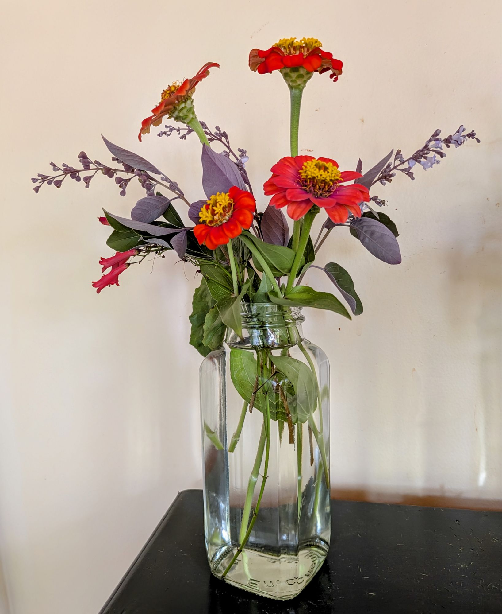 The red berries are Brazilian Pepper (Schinus terebinthifolia) – a dreadful invasive plant in my garden. I am certain these were planted for their lovely berries and frighteningly quick growth habit. There are now untold zillions of these growing wild while we try to get rid of them. I may have saved the planet from 60 with this vase. Sigh. The purple foliage is ‘Purple Prince’ Alternanthera – planted as an annual color some years ago these appear intermittently growing from crevices in paving stones. Red flowers are Shrimp Plants (Justicia brandegeana) – my neighbor gave me one about ten years ago and it keeps going on. The trimmed palm frond, another seedling Cabbage Palm (Palmetto Sabal). Cream colored flower spikes are Juba Bush (Iresine diffusa), a gift from an unknown benefactor I have been diligently trying to propagate (no results). Long grey foliage at the neck of the bottle is a native air plant (Tillandsia spp). This is a relative of Spanish Moss and just appears. No idea why.