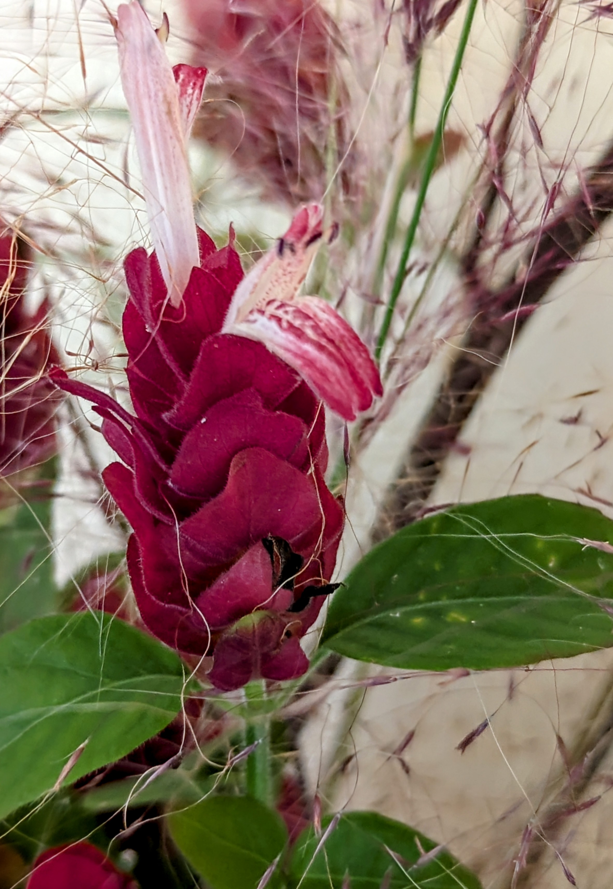 The Red Shrimp Plant (Justicia brandegeana) in all its glory. The fluffy grasses behind are Muhly Grass (Muhlenbergia capillaris). The Muhly Grass has reseeded here and there in the garden. I would have never planted it where it landed, but have come to enjoy the randomness of the placement. It also has the benefit of thriving in the driest, sandiest part of the garden.