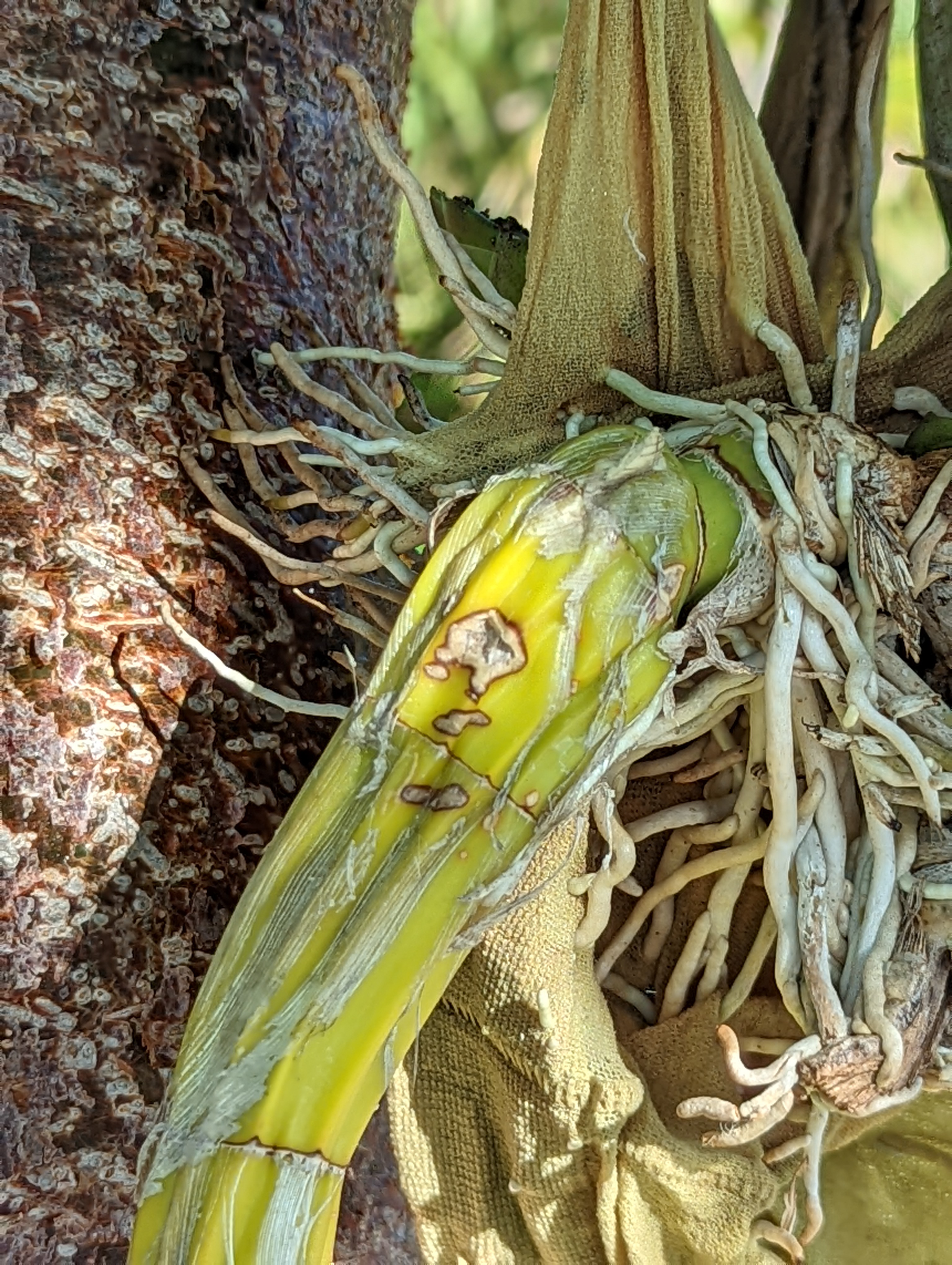 A very nice surprise. The yellow dragonfruit actually set fruit! I have had this for years and many flowers but this is the first fruit. Fingers crossed again.