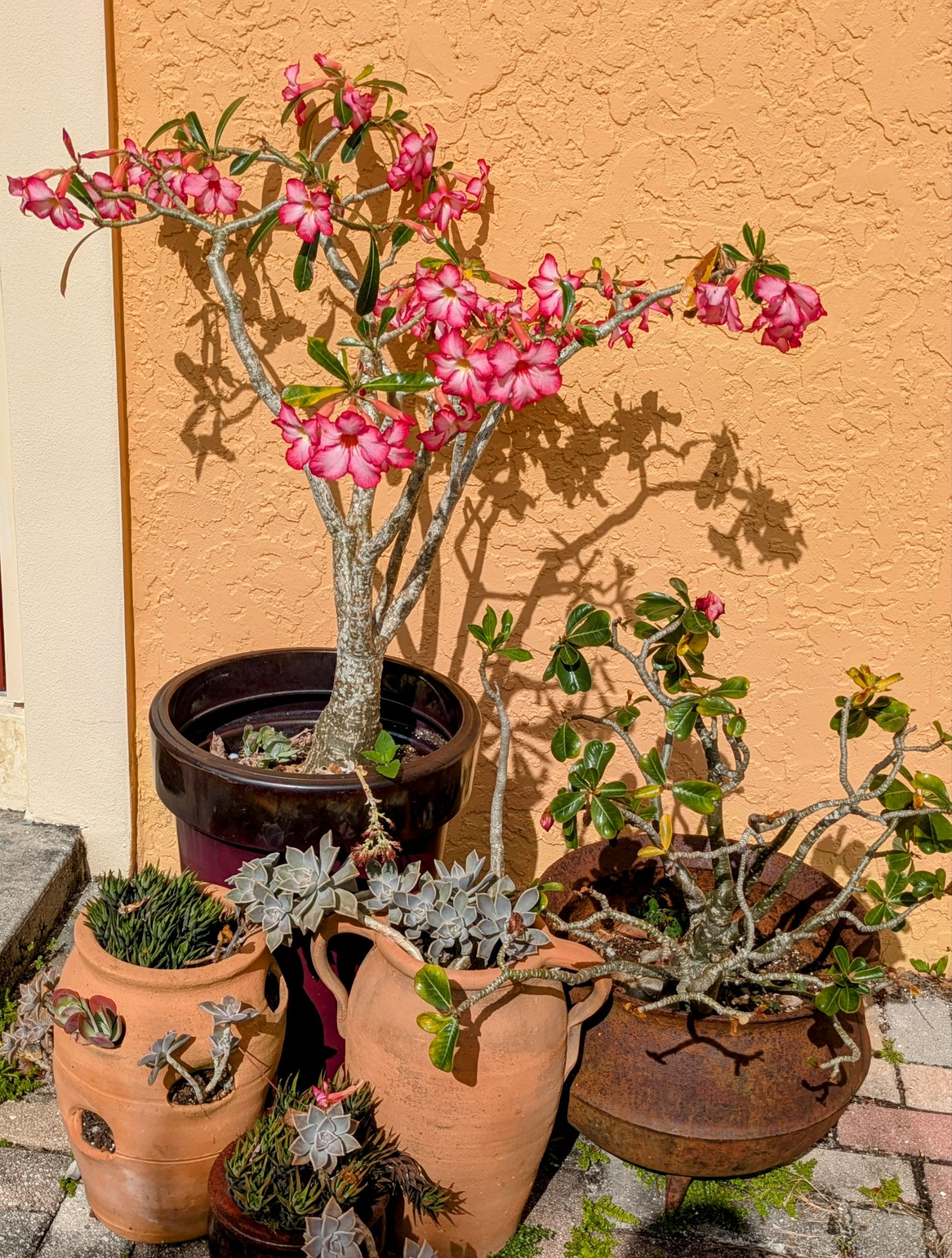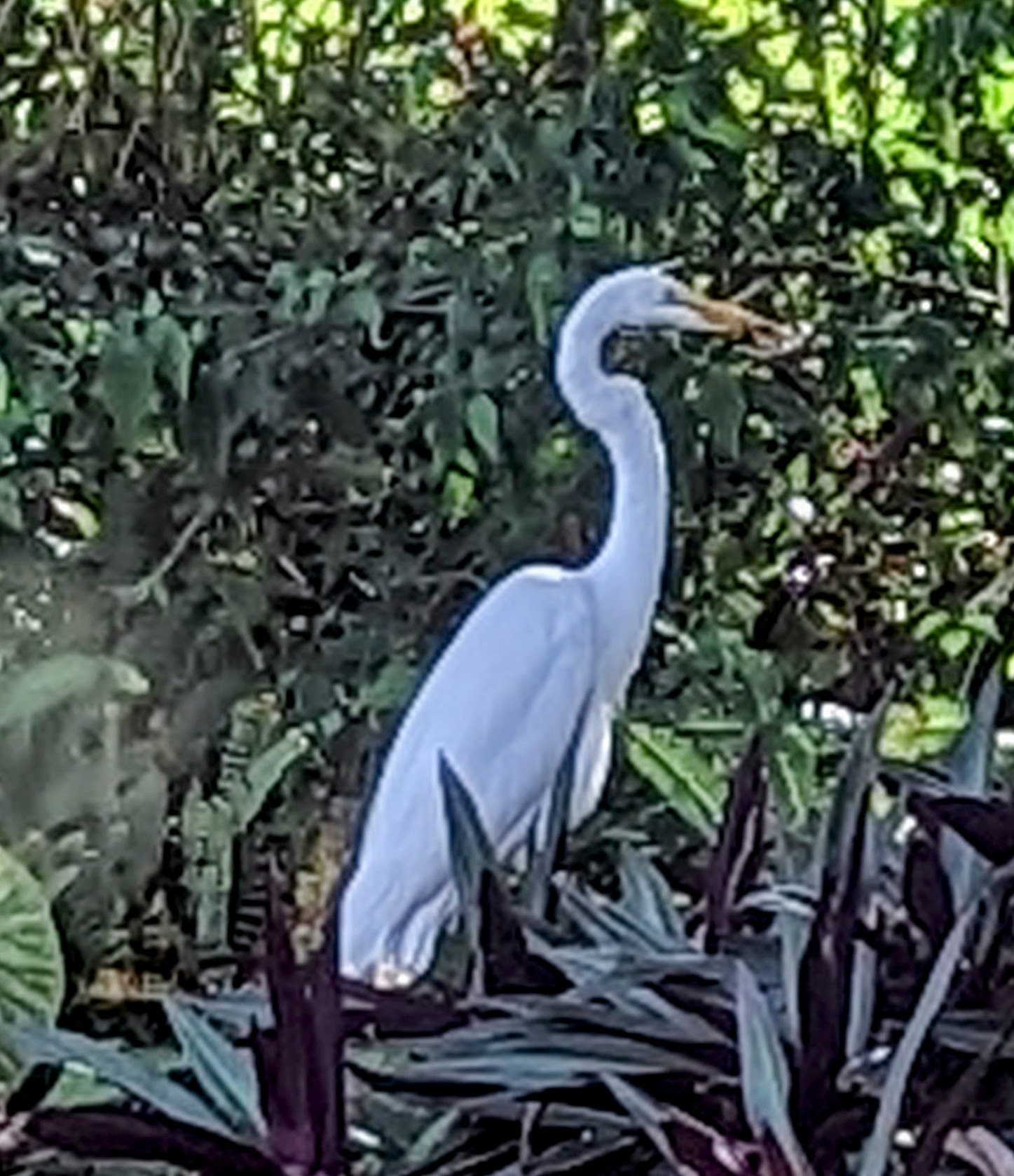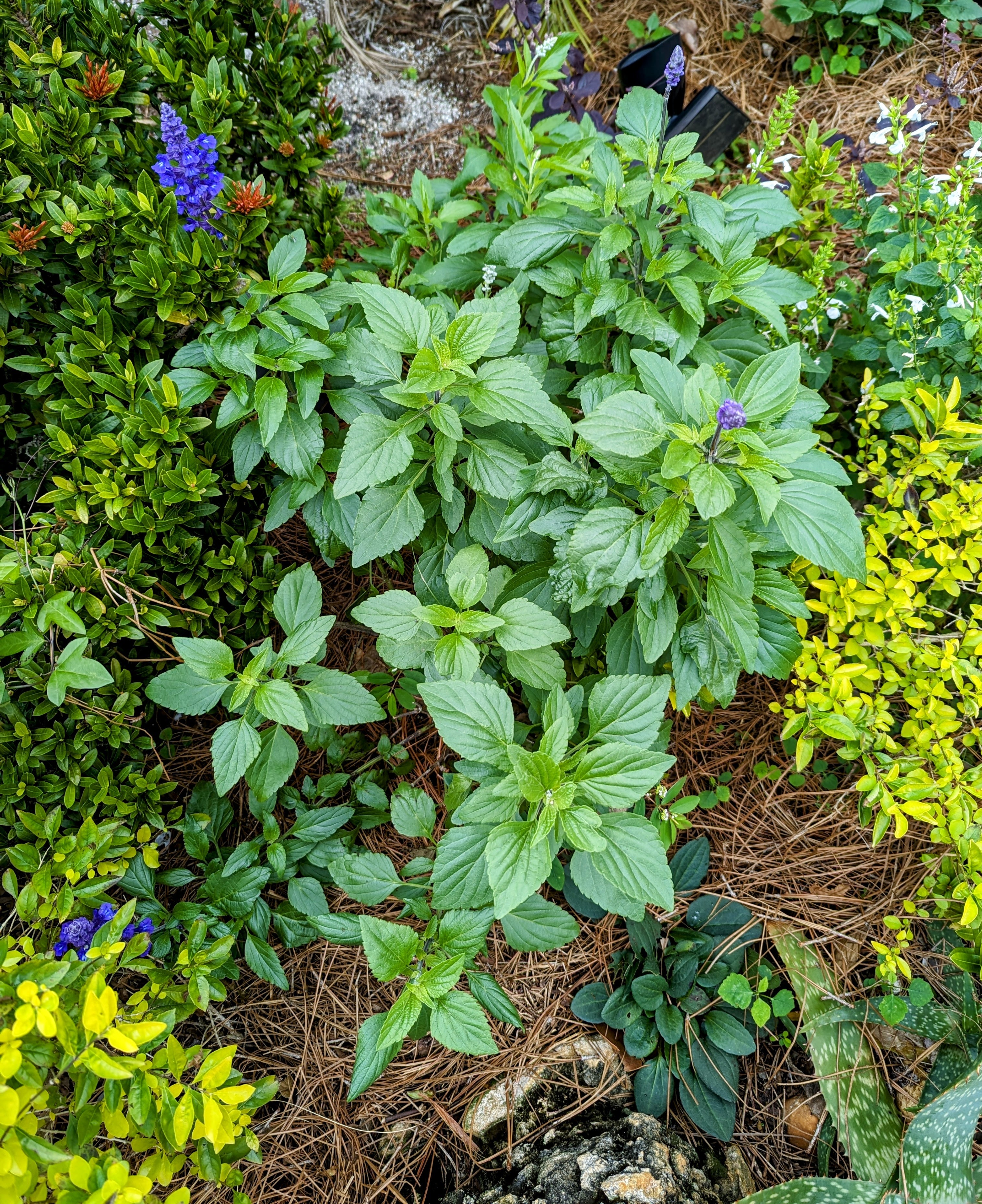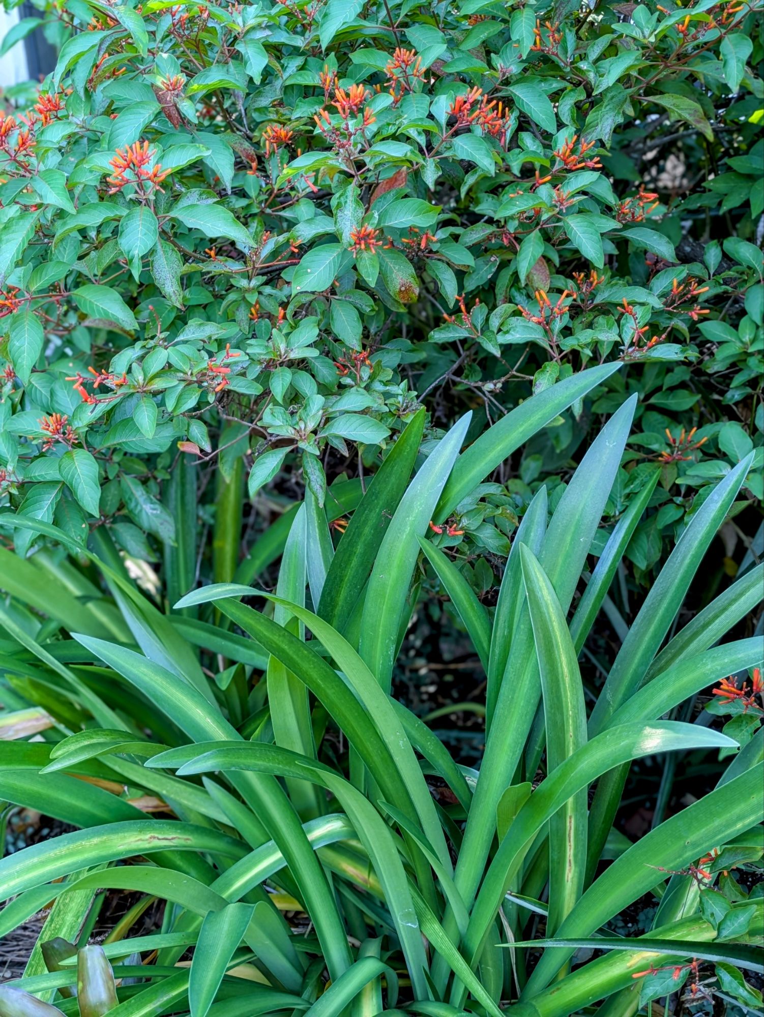 The Firebush (Hamelia patens) is underplanted with lush Alligator Lilies (Hymenocallis latifolia). The Firebush is a major pollinator nectar source, so I have masses of butterflies. This is the best Alligator Lily foliage I have had – these are shy about flowering and seem to enjoy being crowded. Fingers crossed for fragrant, white lilies that open at dusk later this summer.