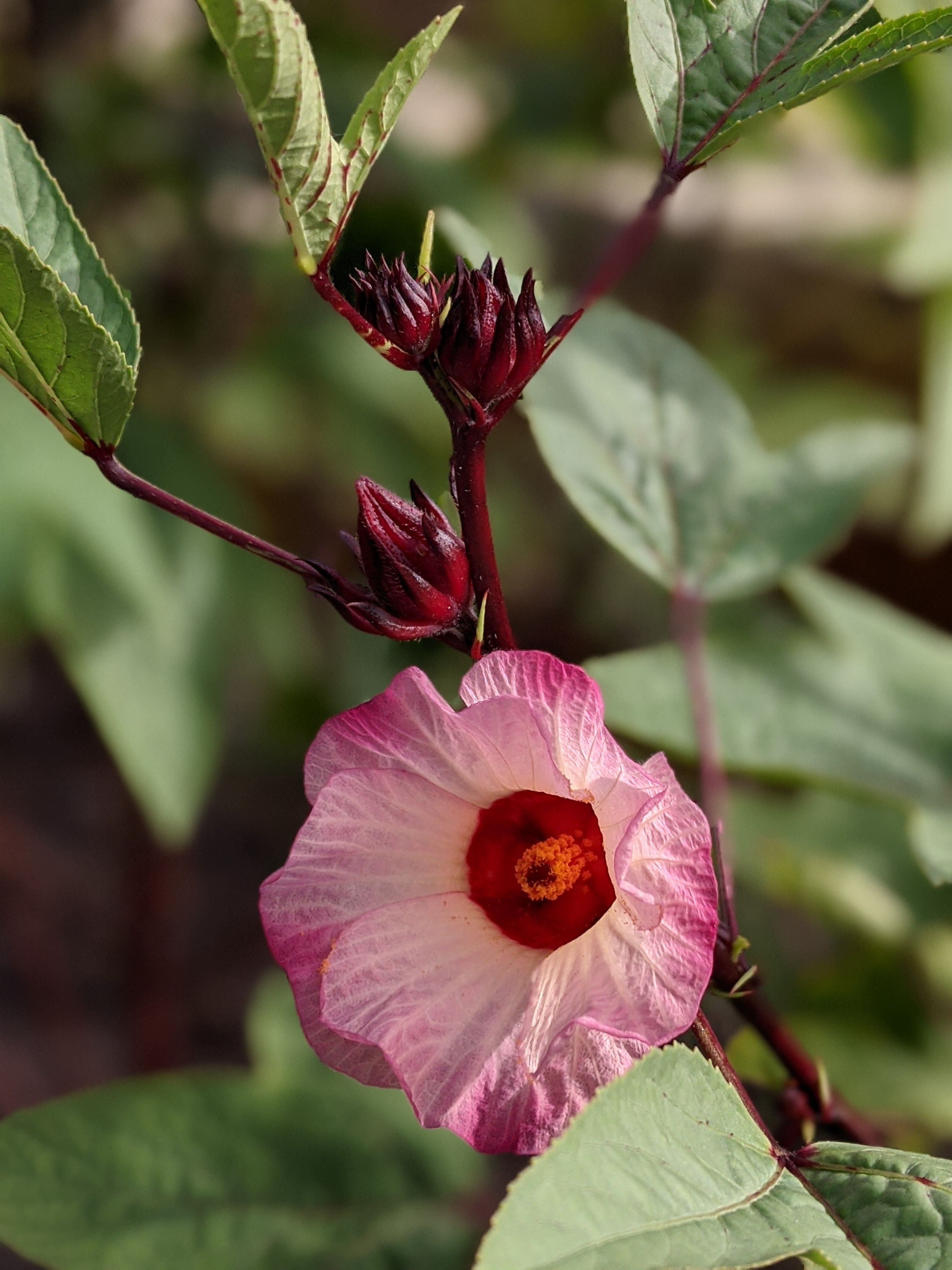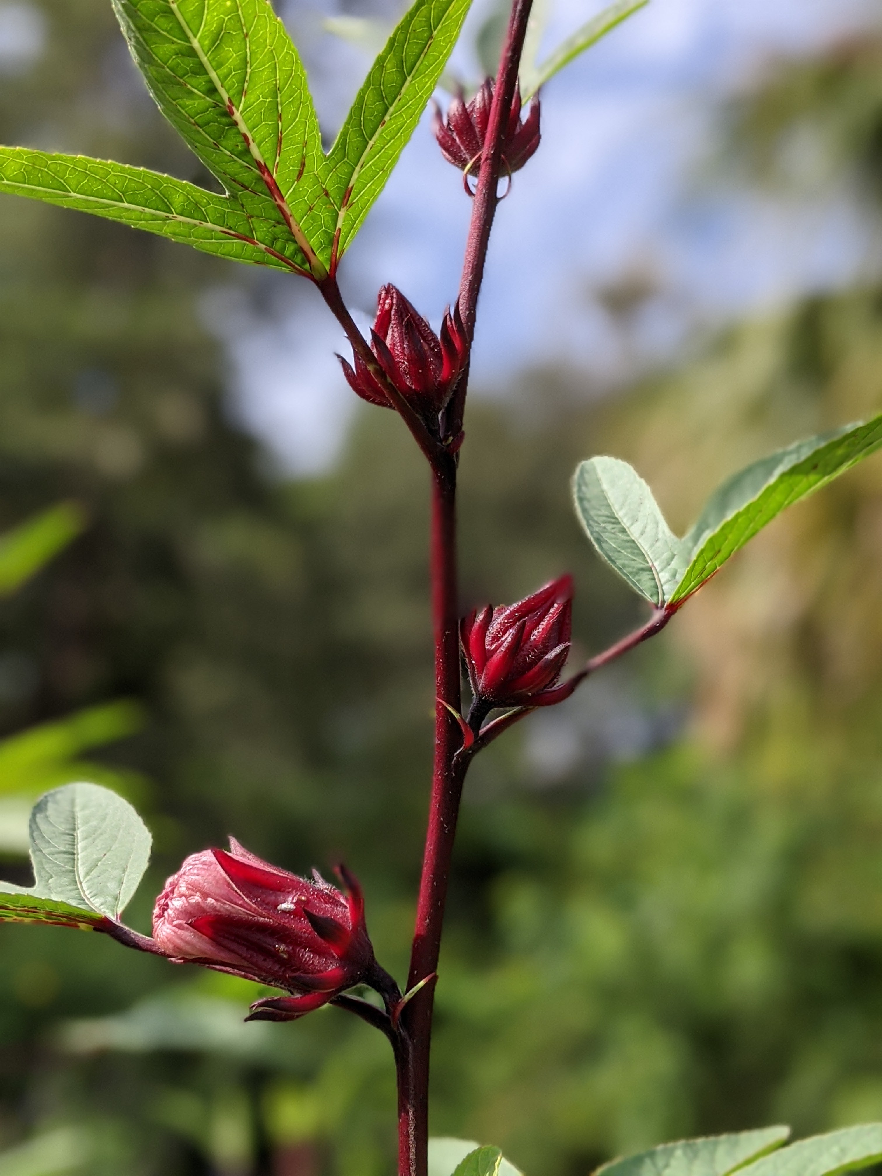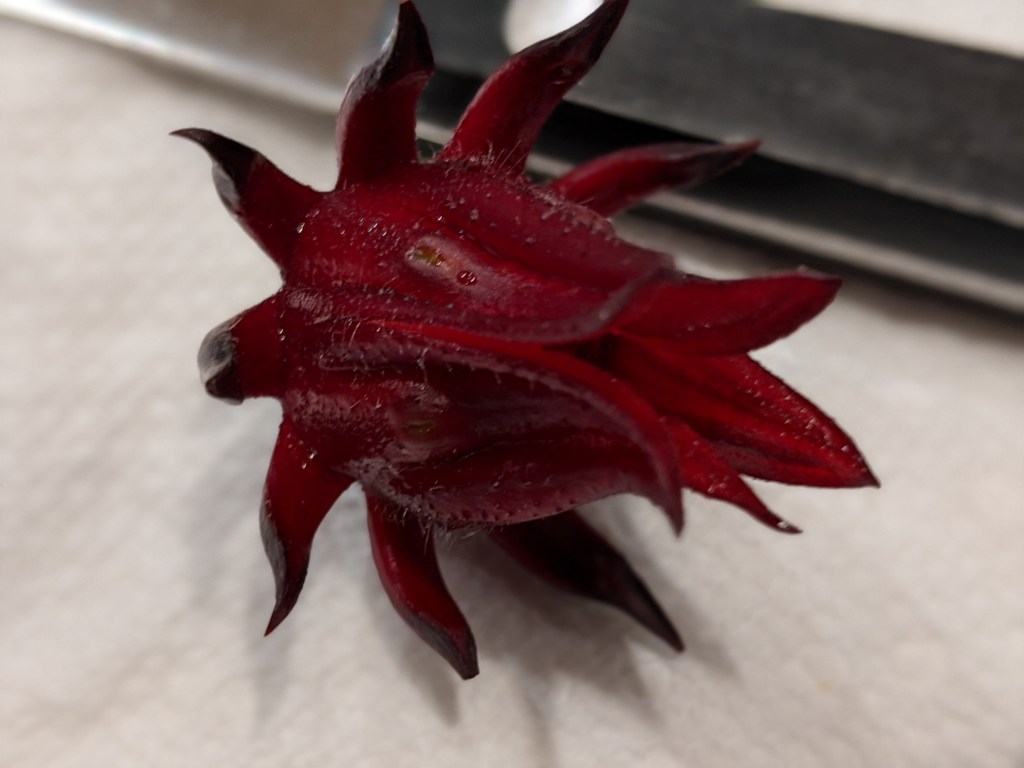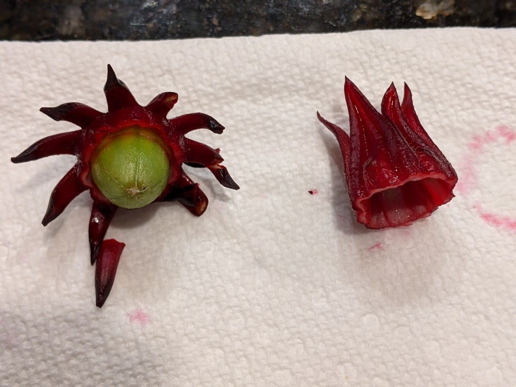 Seedheads forming on the Roselle (Hibiscus sabdariffa). I left several on the plant as someone always want to try these for fun. The seedhead eventually turns brown and may be ground and used as a coffee substitute. Not trying that, but will collect seed for next year. I cut most of the flowers and am getting a second crop of smaller flowers on some of the plants.