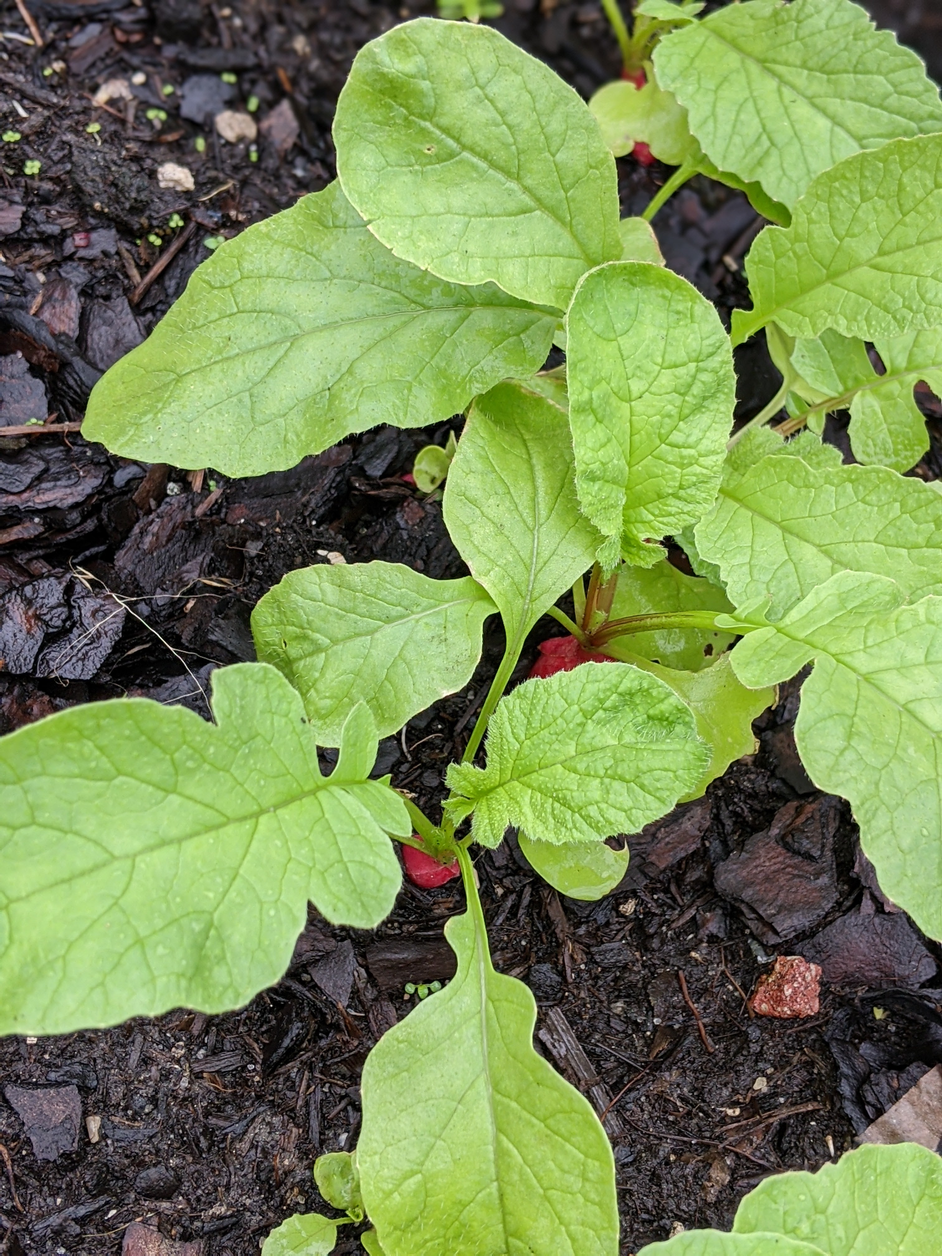 Snow Peas (mangetout in Britspeak, a new name to me) and spinach emerging in grow bag.