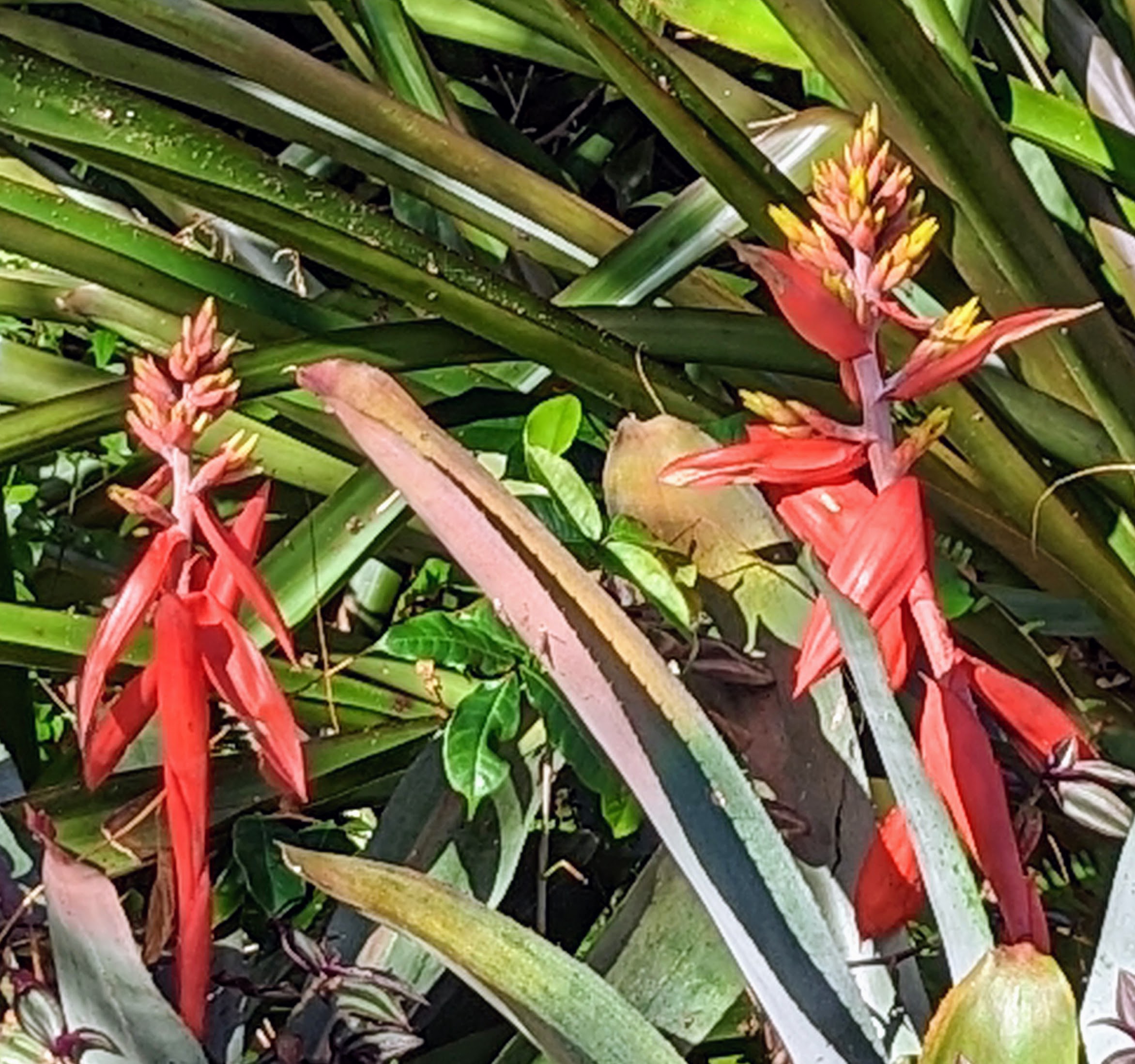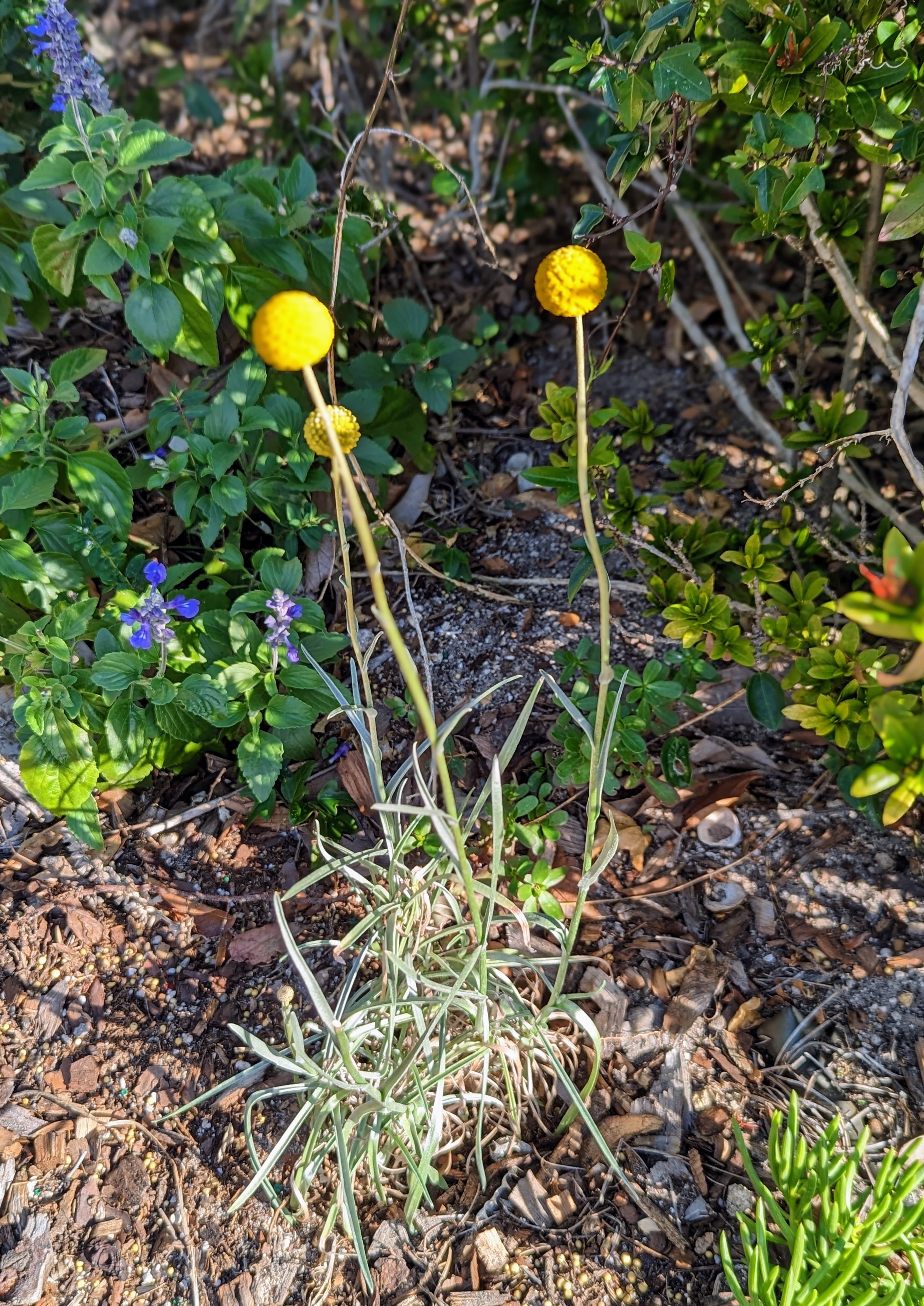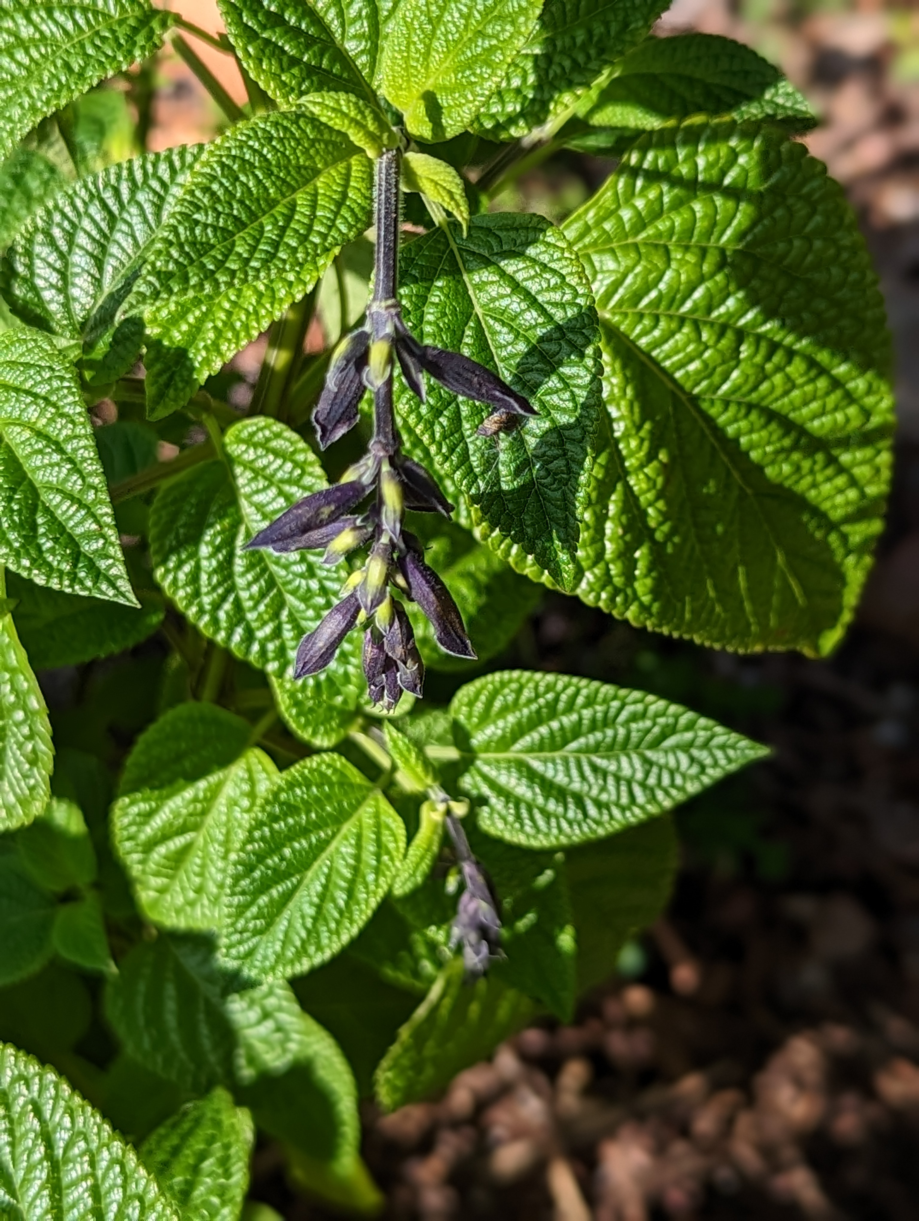 The vase is a crystal rose bowl that belonged to my mother. Gracing the rose bowl front and center are the BEG Sunflowers in yellow; salmon flowers with green tips are from Soap Aloe (Aloe saponaria); blue flowers are Black and Bloom Salvia.