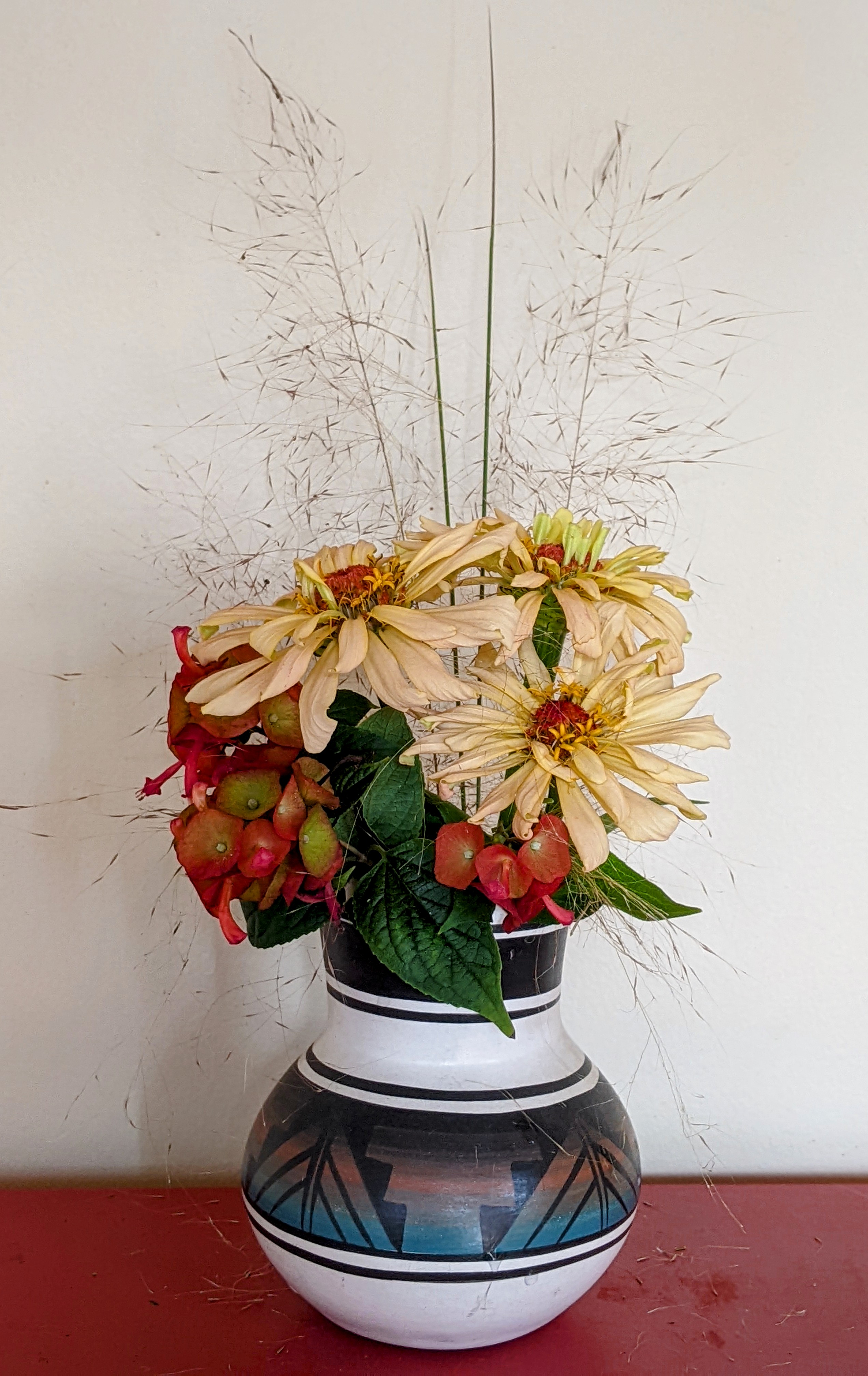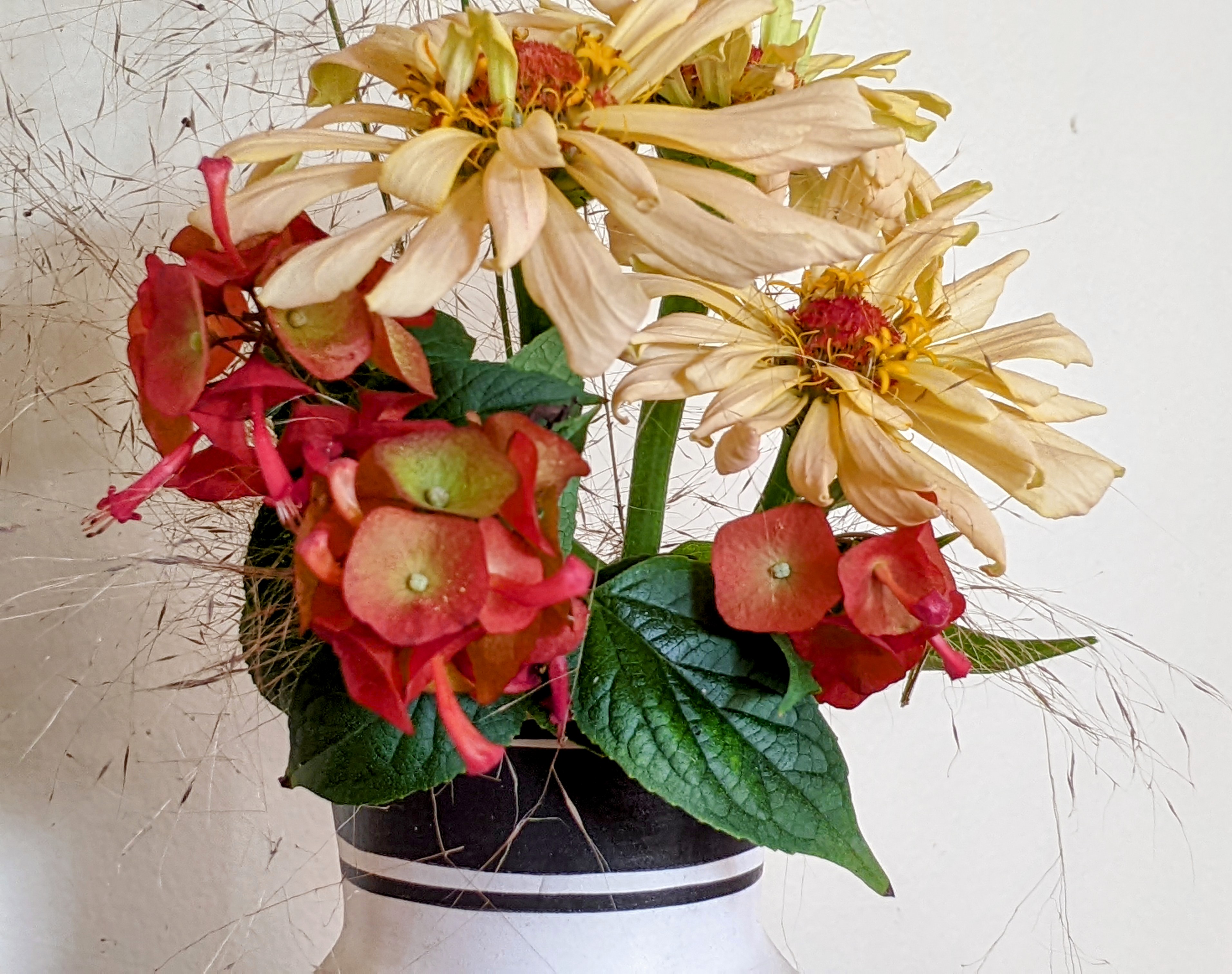 The red flowers are from the China Hat shrub (Holmskioldia sanguinea) – another native of India; white flowers are White Flame Salvia; a few stems of Boston Fern (Nephrolepis exaltata) complete the vase.