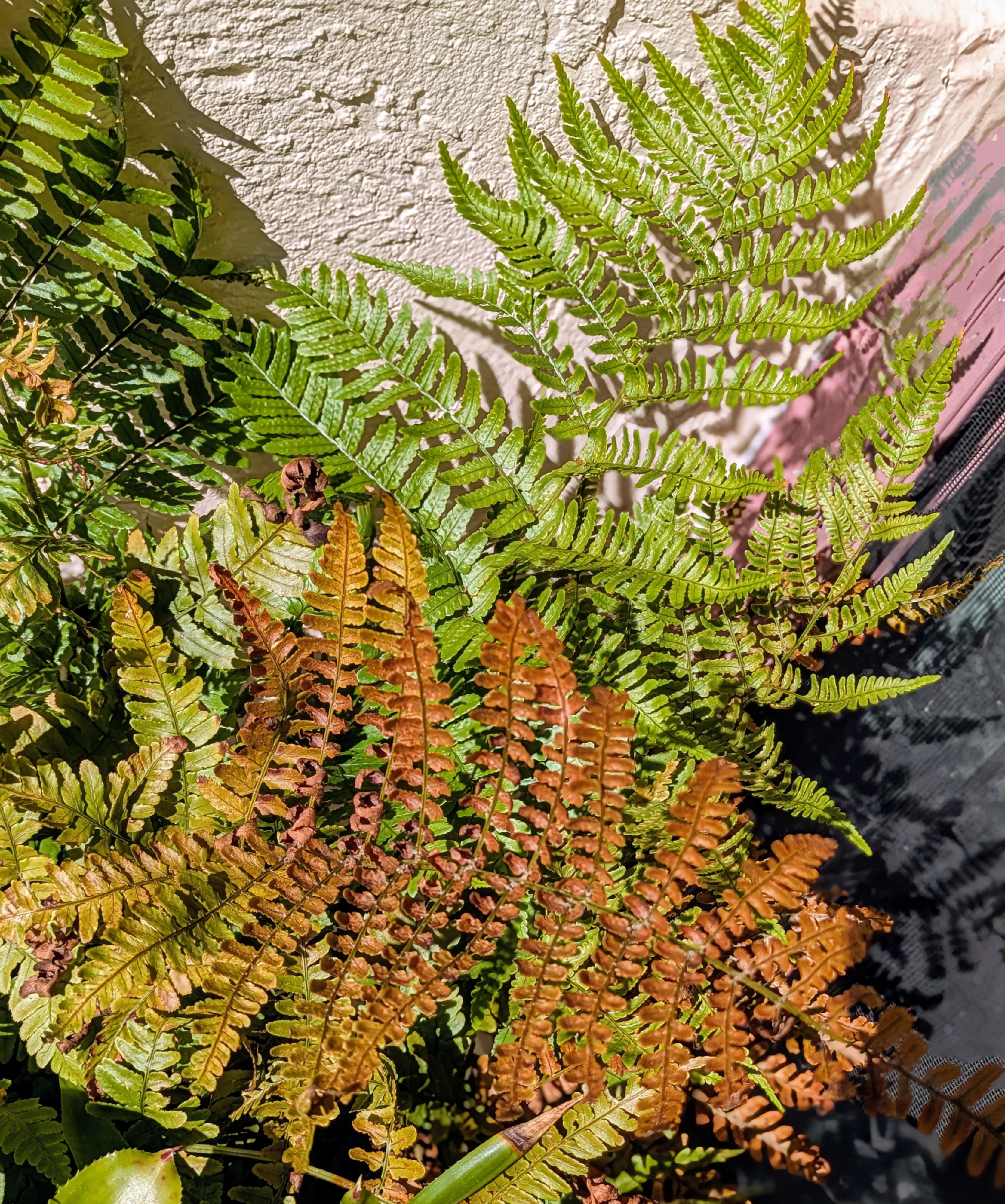 Autumn Fern (Dryopteris erythrosa) in full color. These are my favorites from my garden further north. I am surprised I have managed to get it to grow here. A very pampered pot on my front porch. Doused twice daily with dog bowl water.