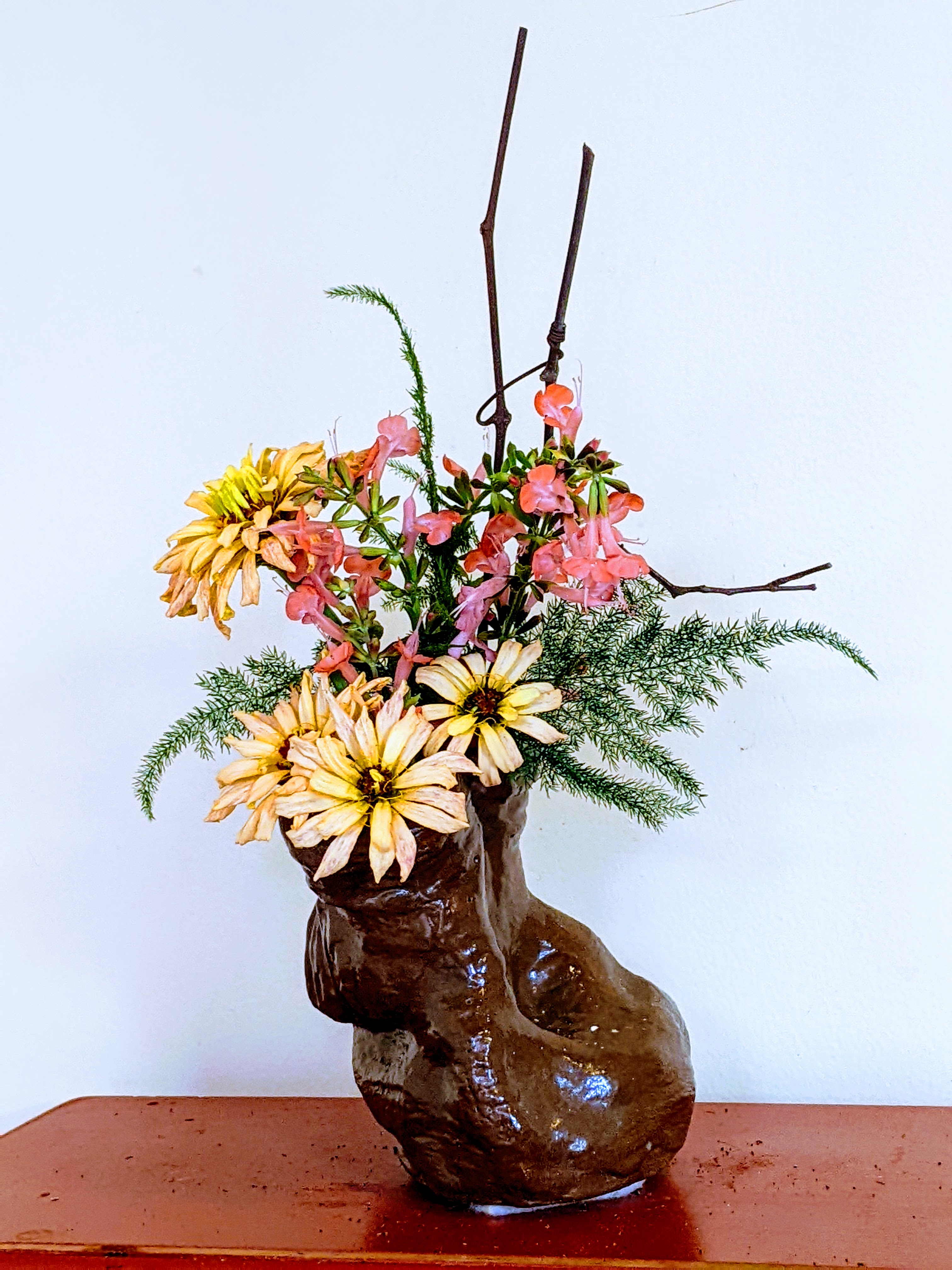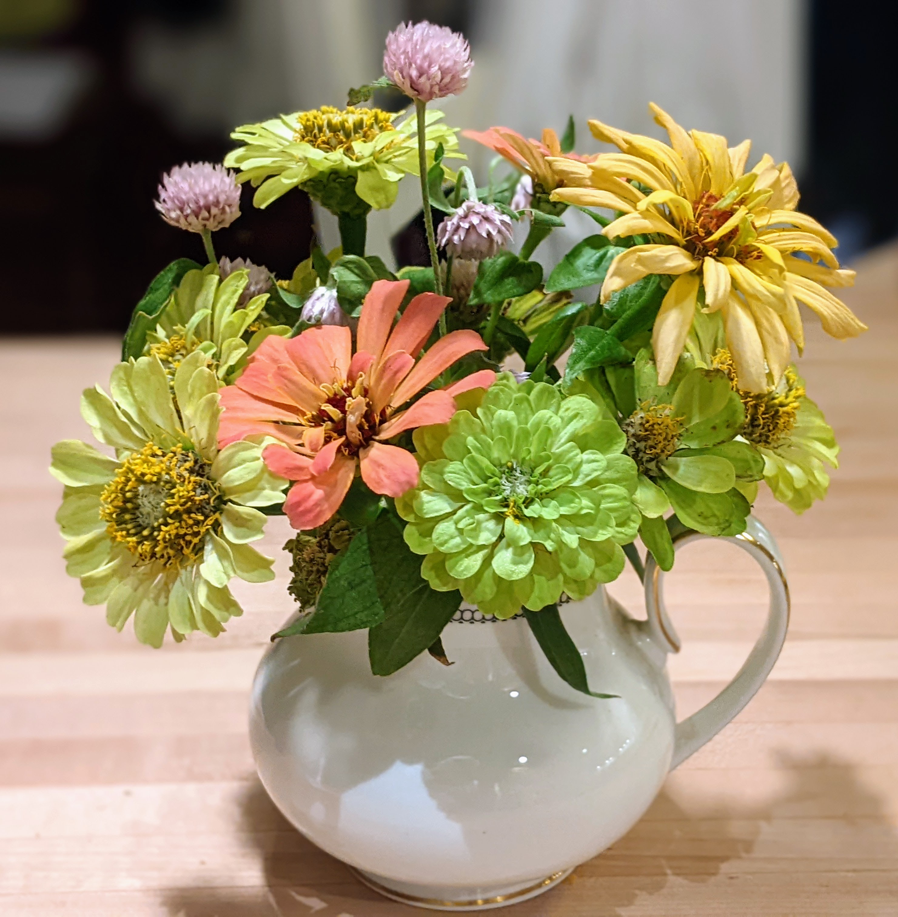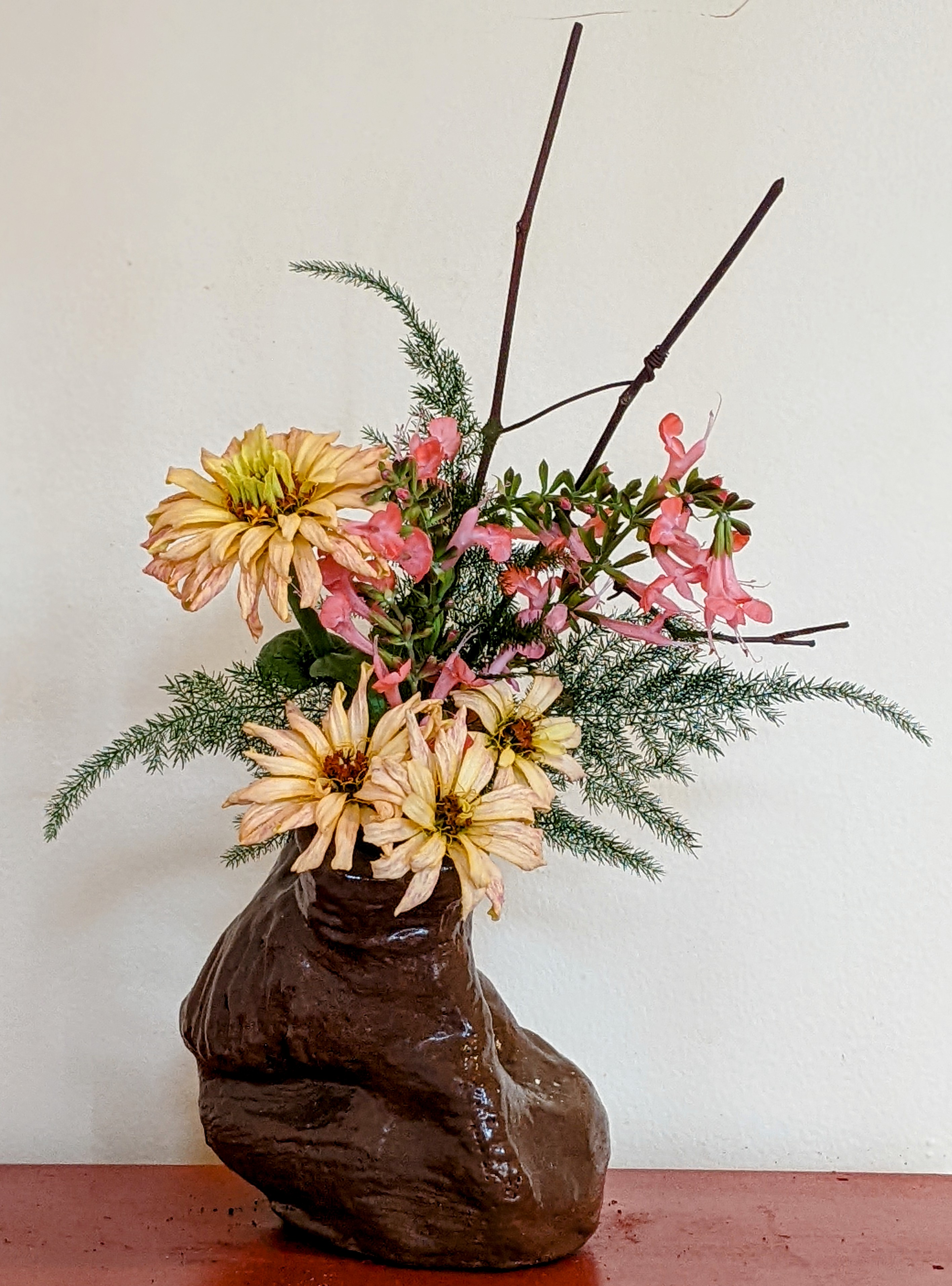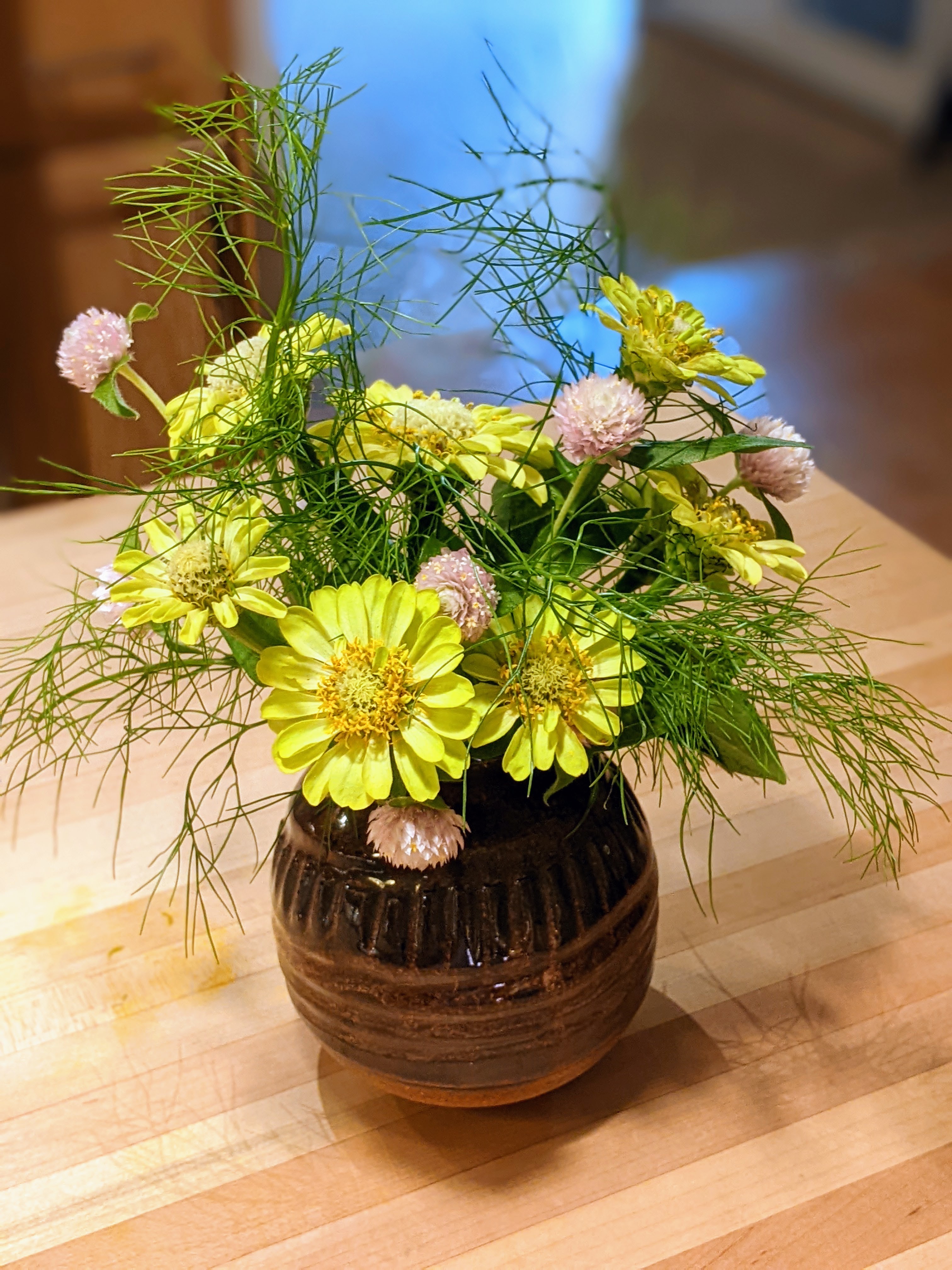 The arrangement has an Ikebana feel to me. I did not start out with that in mind – as my vases usually go, this one evolved from ‘looking for a brown vase to put the cafe au lait zinnias in’ to ‘needs brown twigs for zen balance’. I found an old brass trivet to put under the vase and it is not sweating too badly.
