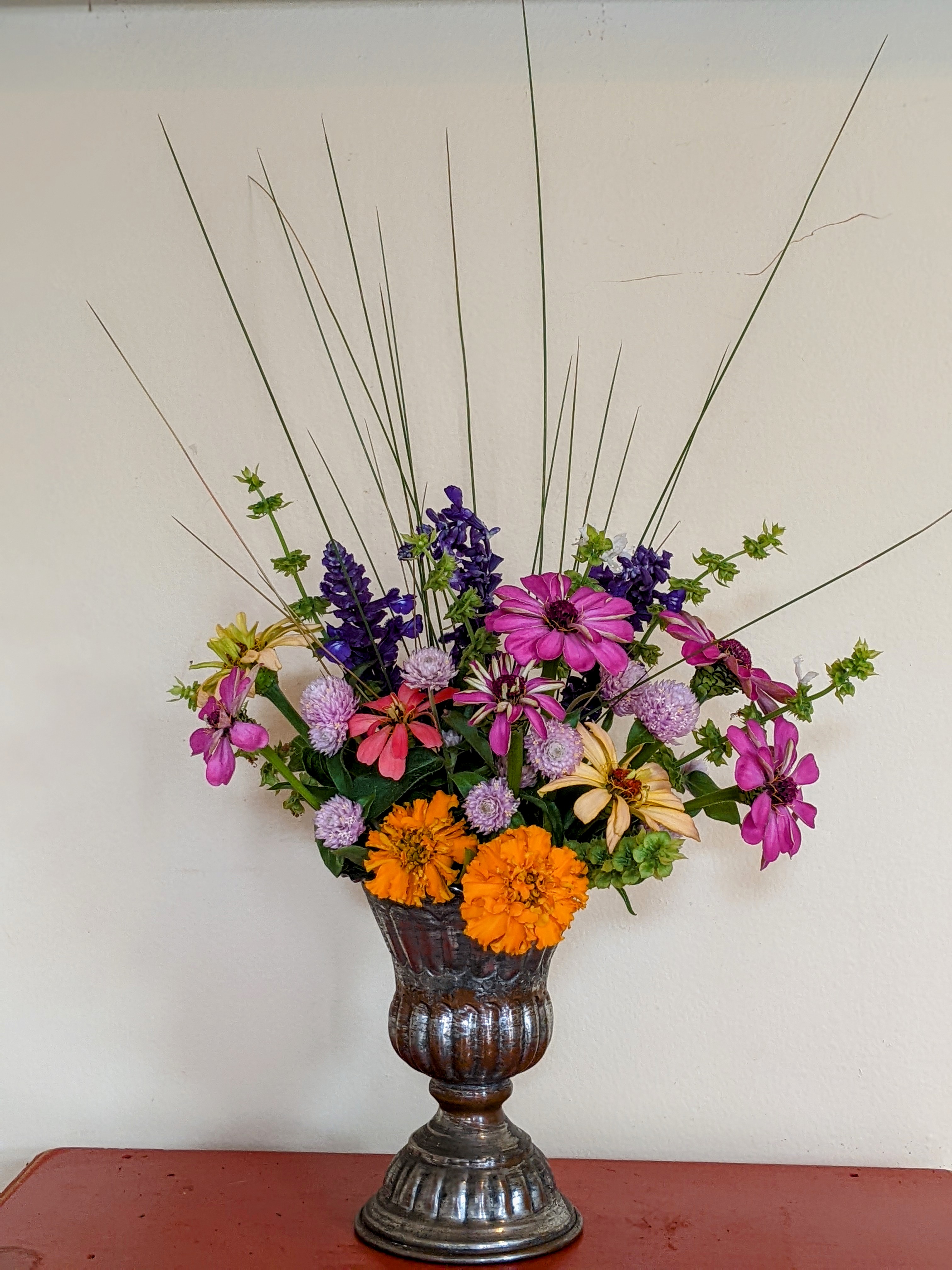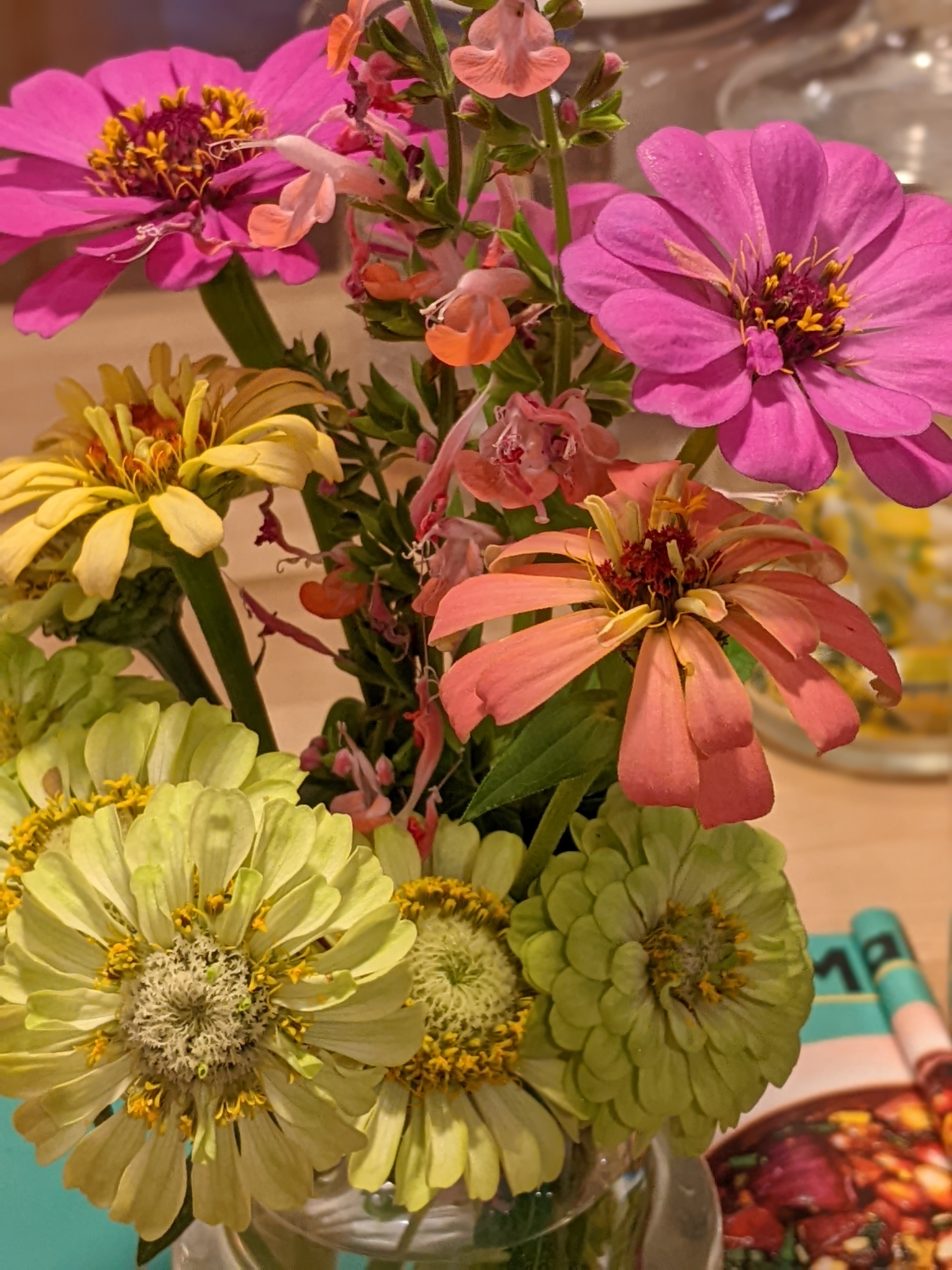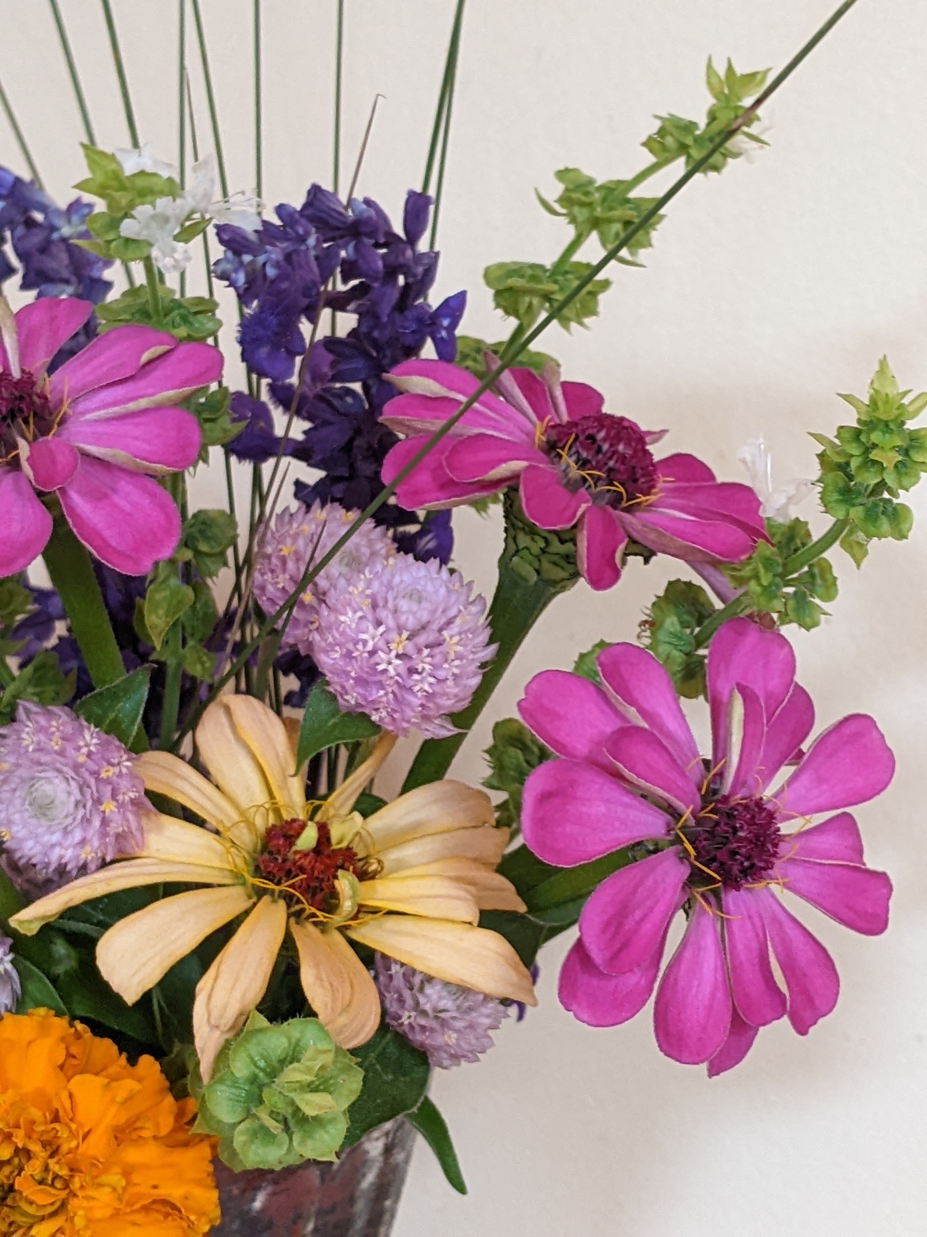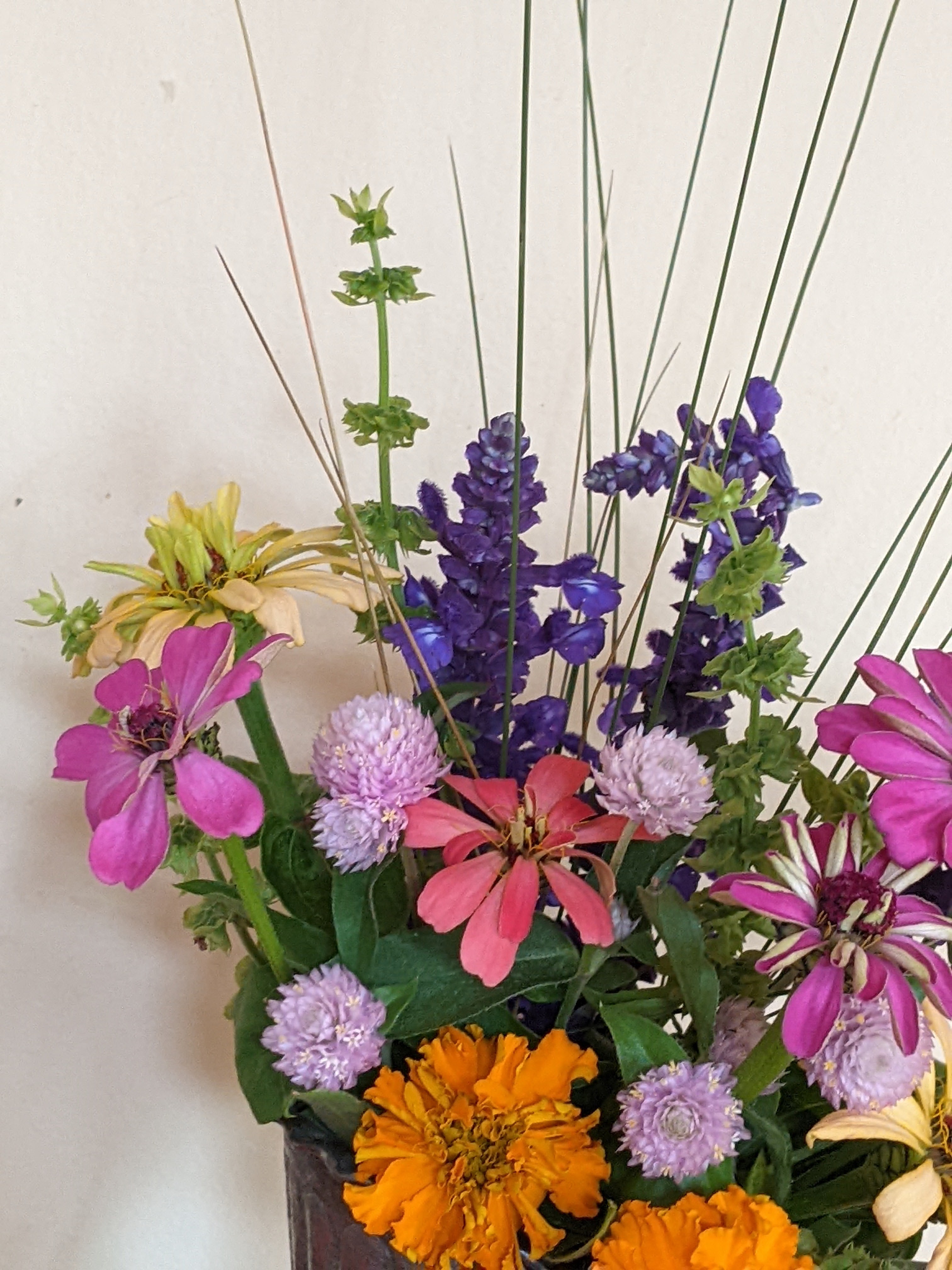 The arrangement has an Ikebana feel to me. I did not start out with that in mind – as my vases usually go, this one evolved from ‘looking for a brown vase to put the cafe au lait zinnias in’ to ‘needs brown twigs for zen balance’. I found an old brass trivet to put under the vase and it is not sweating too badly.
