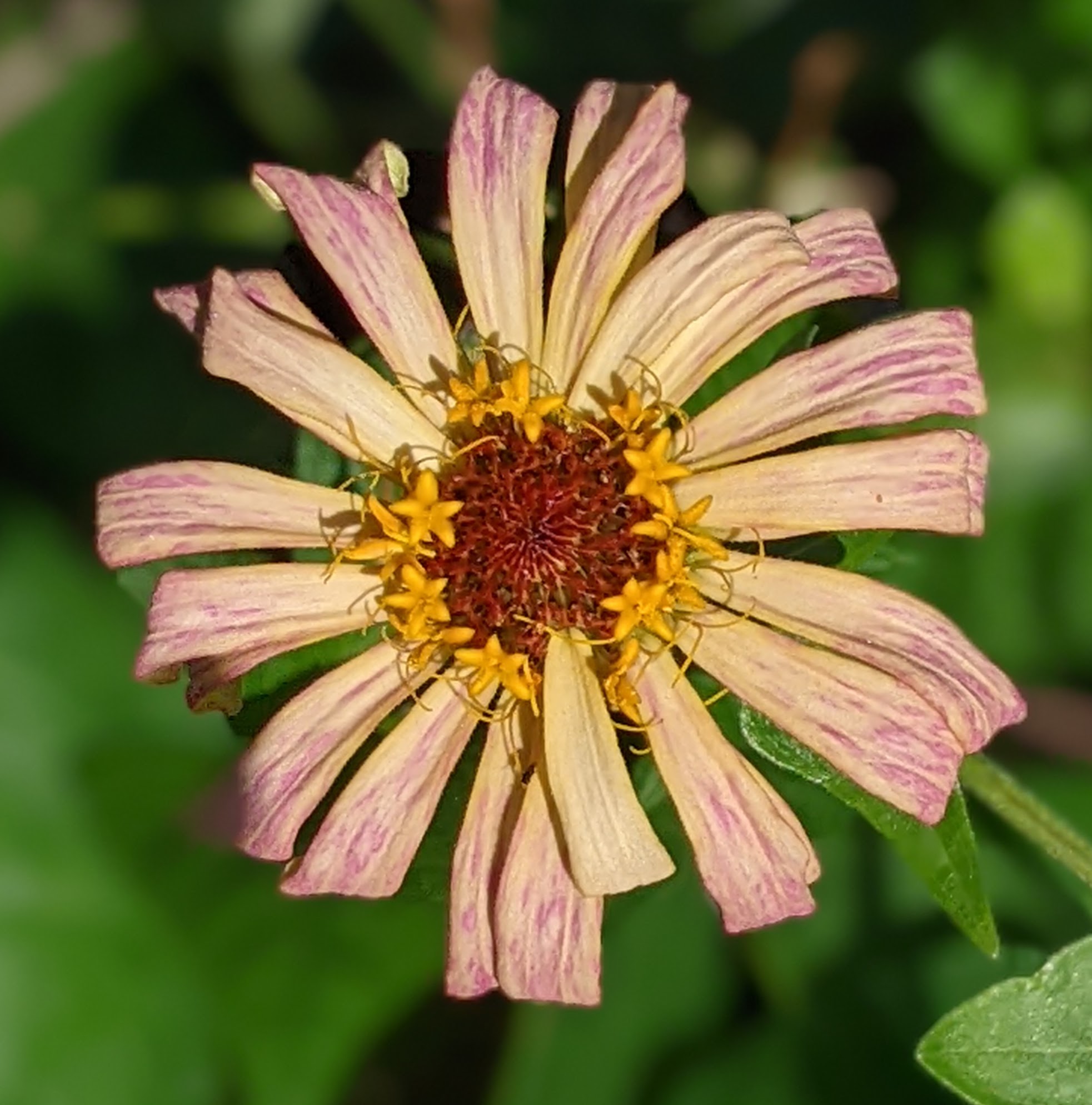 Cafe au lait Zinnias from a Cactus seed mix are the stars of this show. The peachy flowers are non red Tropical Red Salvia (Salvia coccinea). This Salvia is a perennial (reseeding) favorite in my garden and I love the color surprises left by pollinating bees.