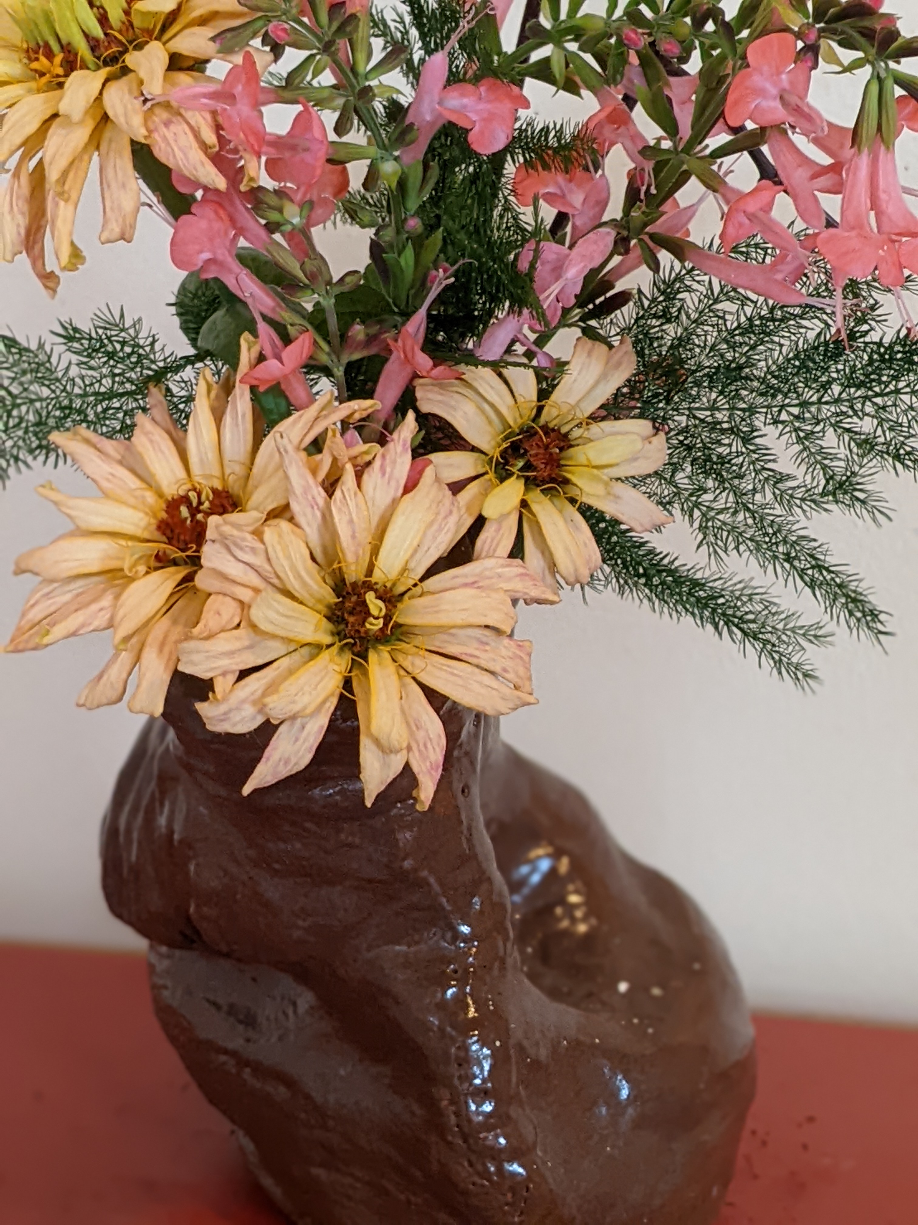 The art? The vase – built by me in high school art class, many years ago. The dark ages when Aerosmith first appeared on the rock scene, something much discussed over making coils for clay pots. I think this was called hand building and is the last surviving artifact of my foray into clay. The bottom of the vase is not glazed, it doesn’t leak or hold water – it sort of sweats.