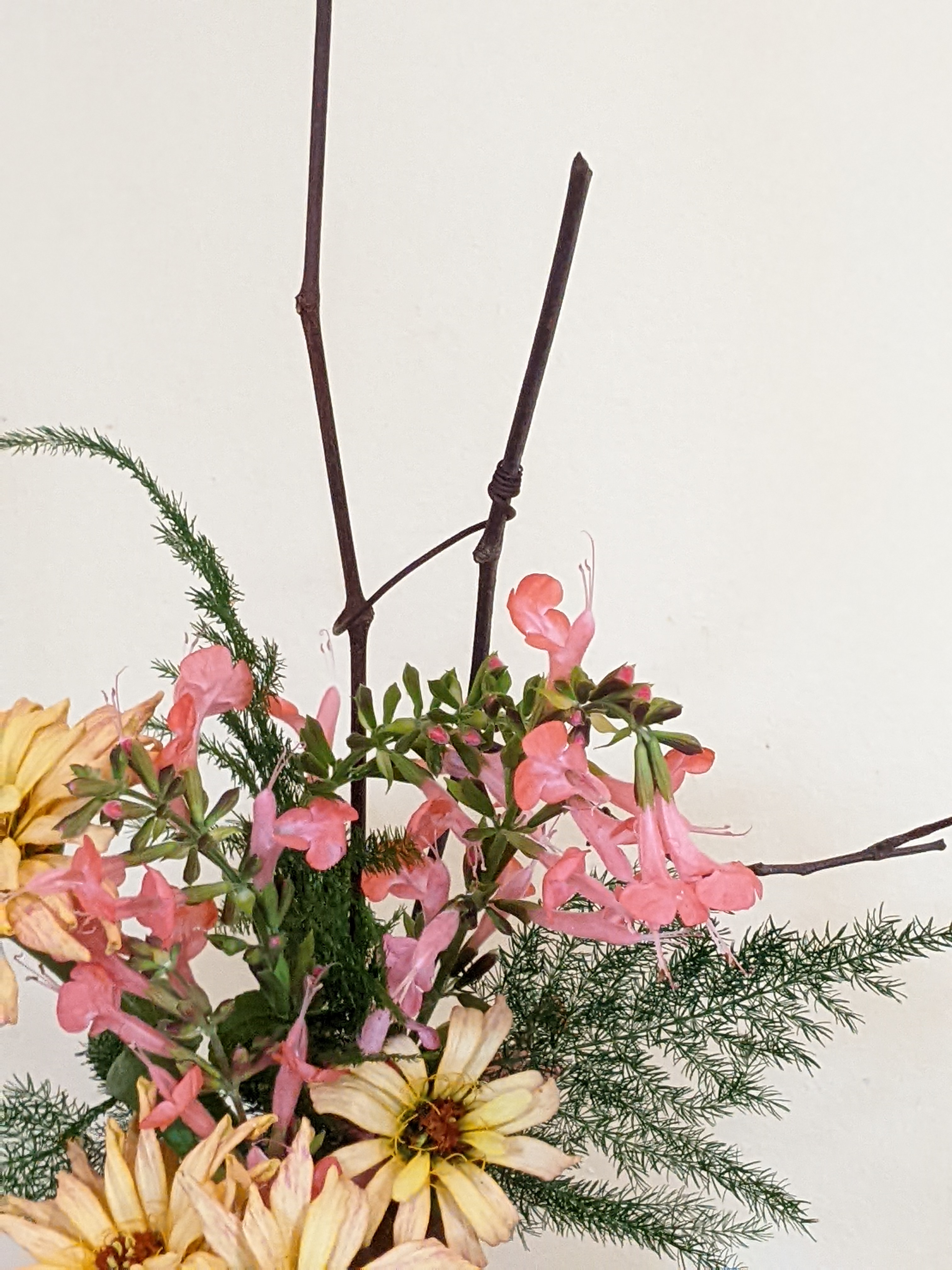The ‘zen’ brown sticks are from the native Muscadines (Vitis rotundafolia) that run rampant through the wilder parts of my garden. The greenery, Asparagus Ferns, run the same course with the Muscadines, with a much smaller stature.