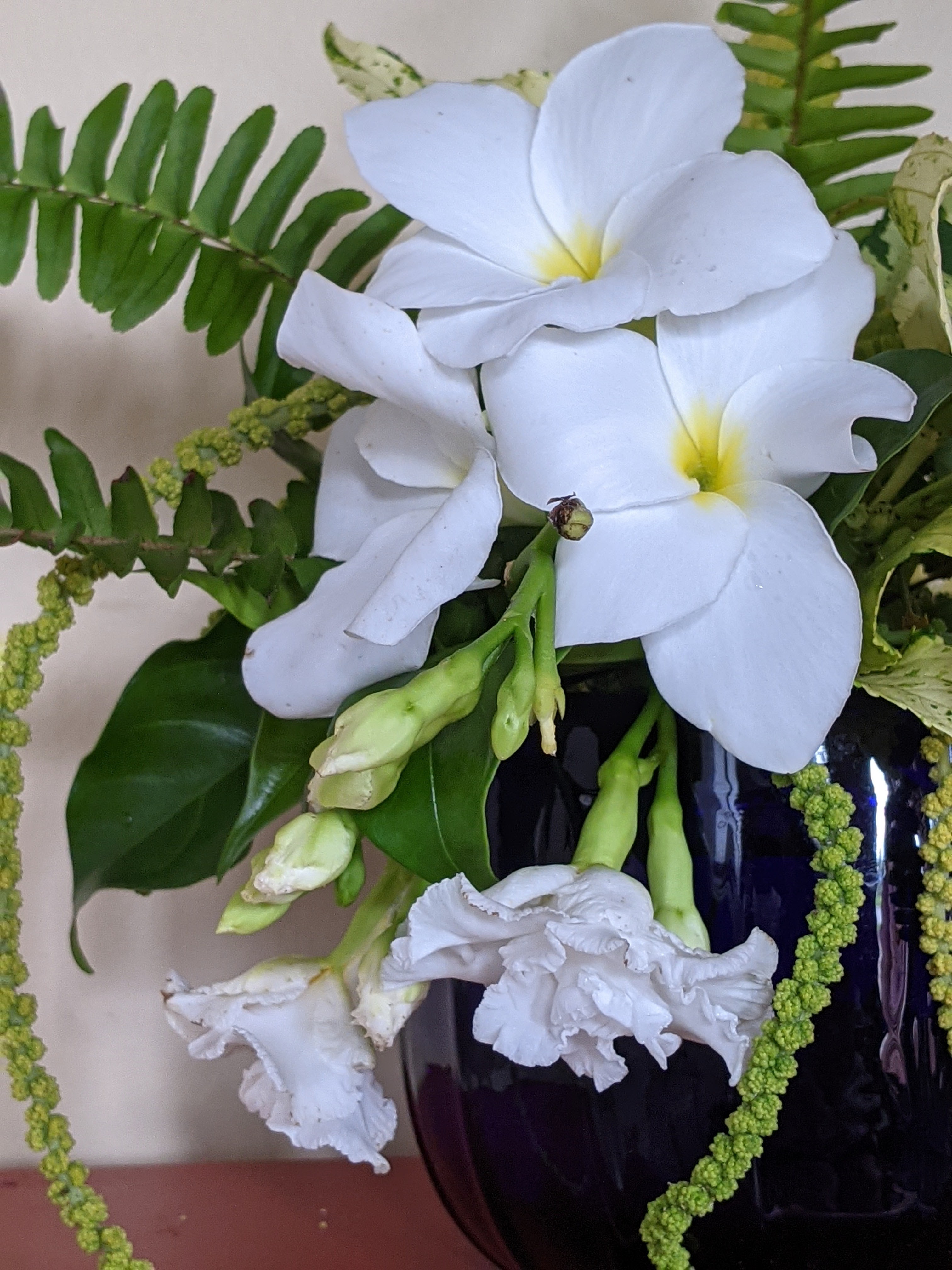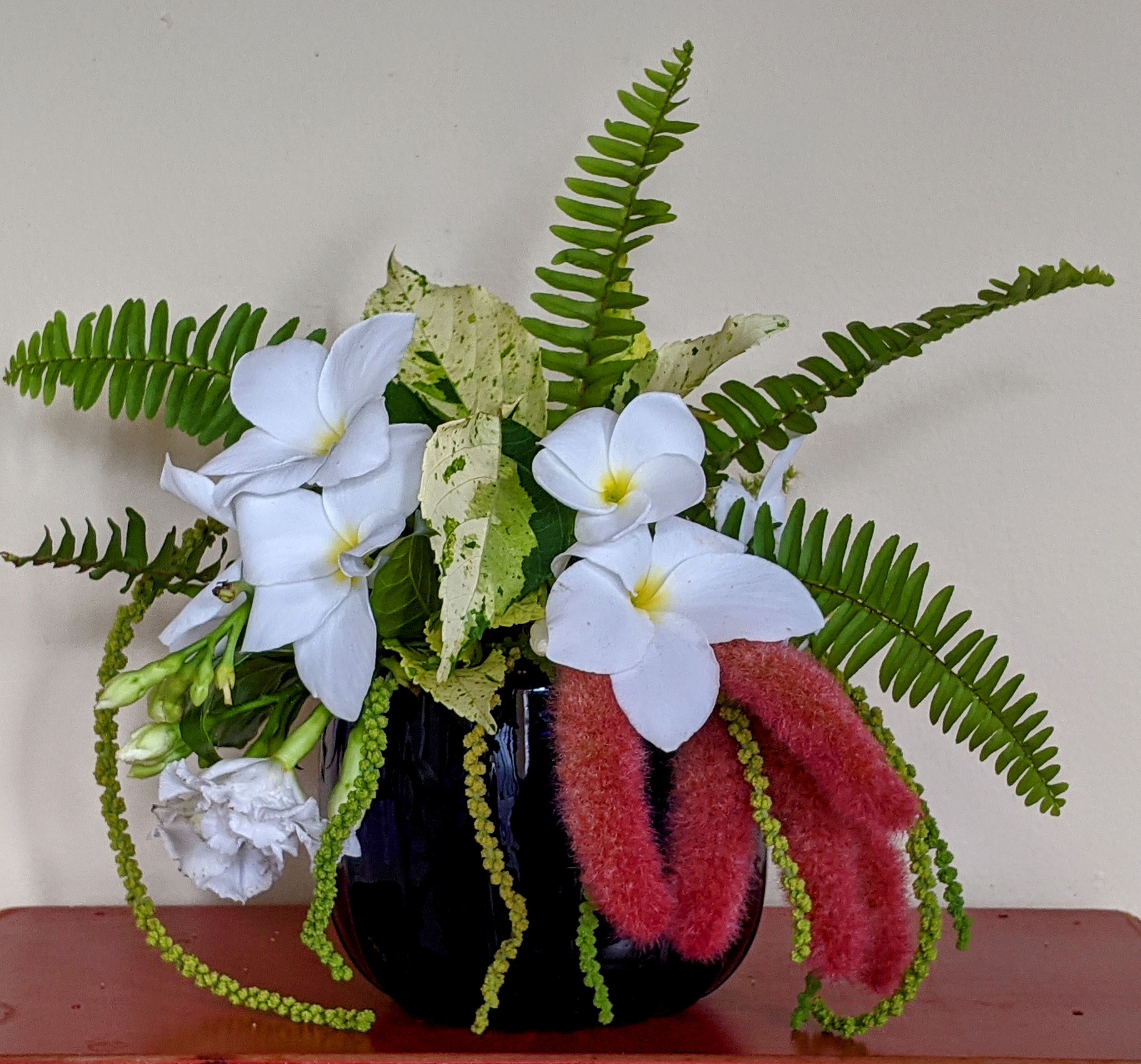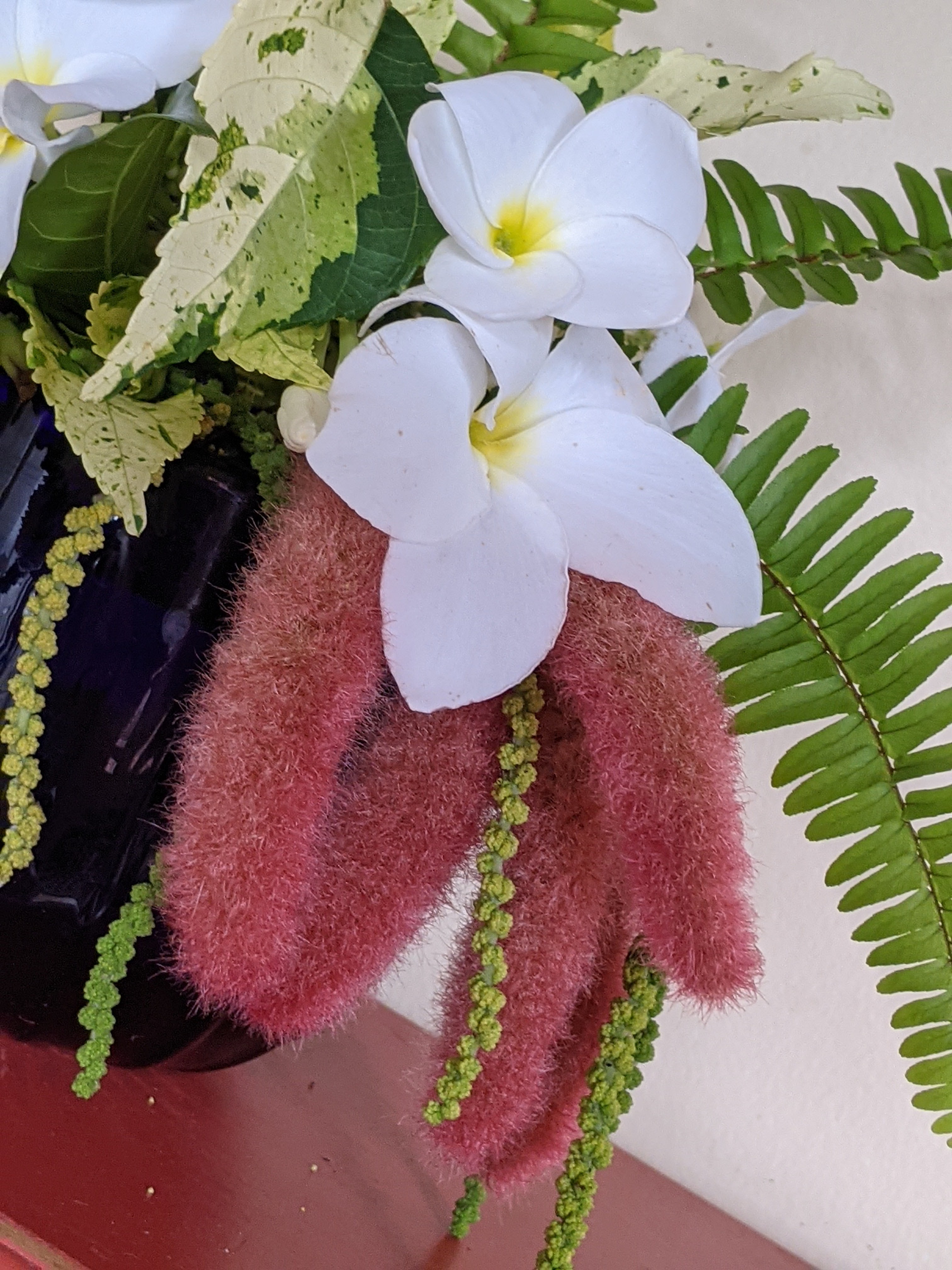 The very tasteful ‘Java White’ Copperleaf (Acalphya wilkesiana) backdrop for my concrete greyhound. This shrub grows like mad. I would estimate I cut about eight feet a year off. How tall it would get without pruning is anyone’s guess.