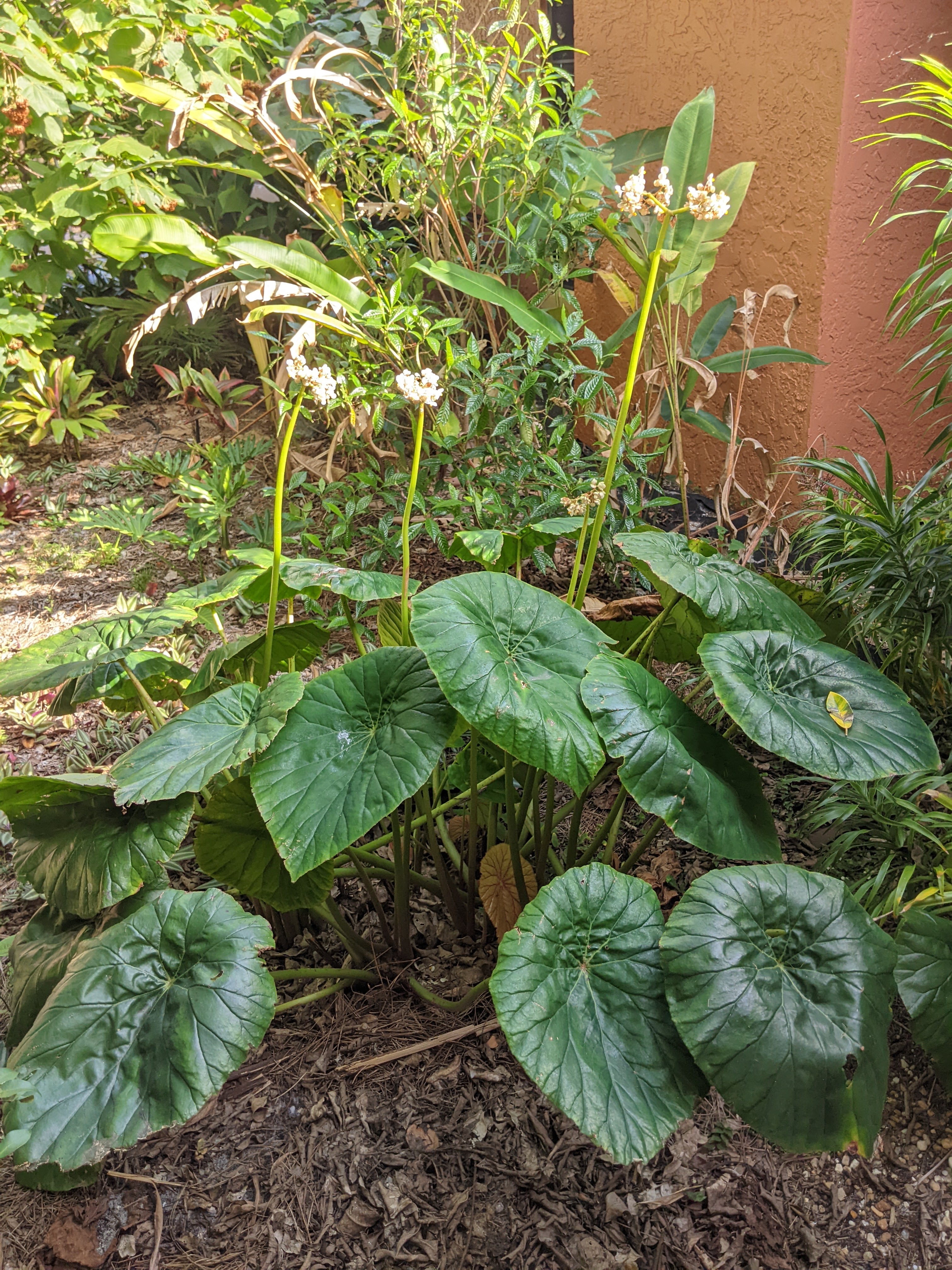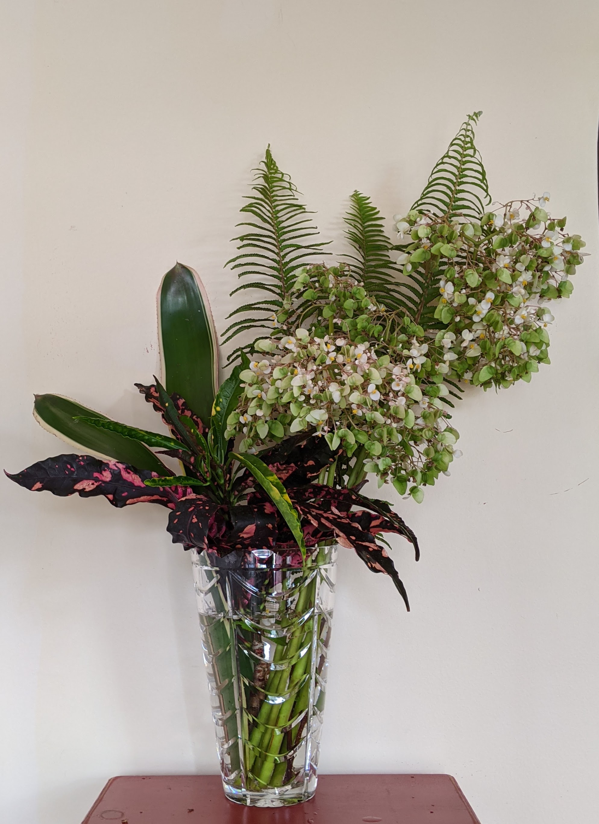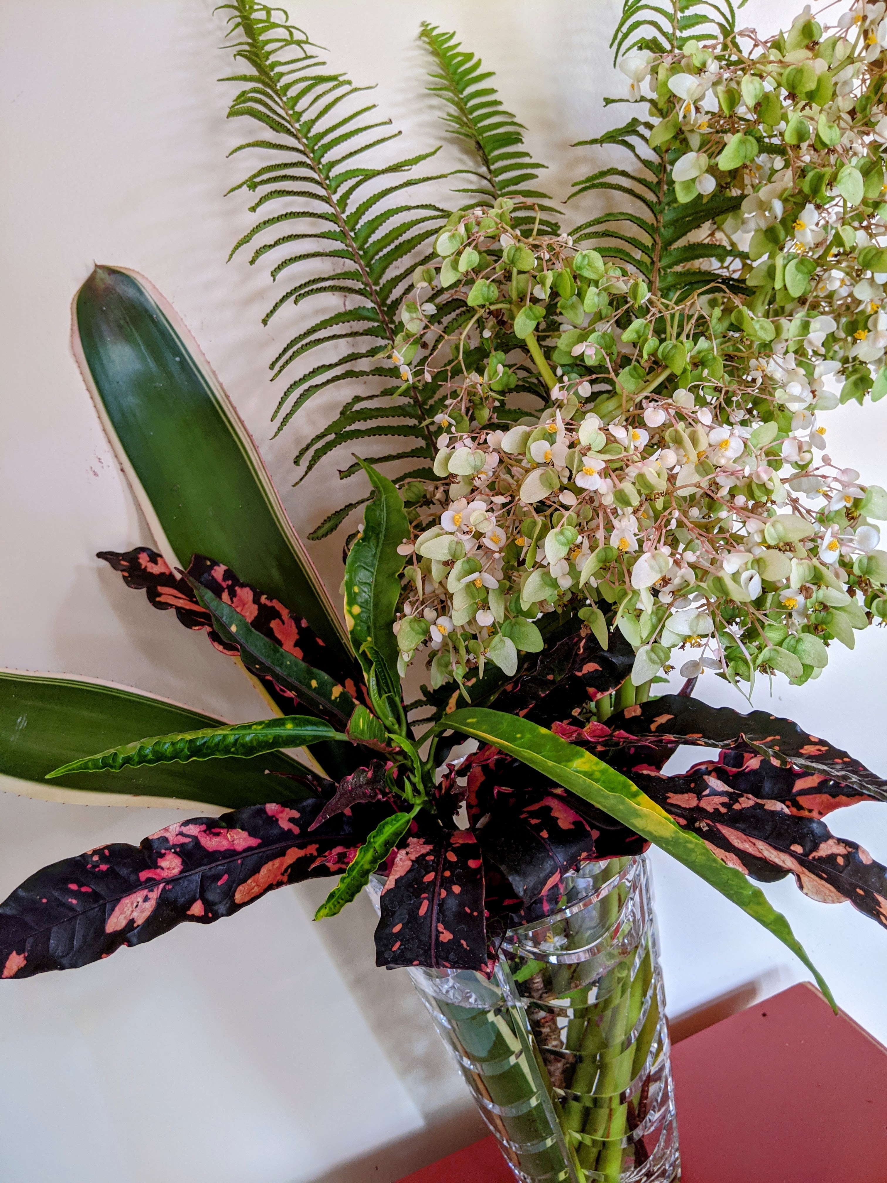 The Begonia in the arrangement is Lotusleaf. Definitely the biggest Begonia I have ever seen. It is a common roadside plant in Central America and pretty indestructible once established in my garden.