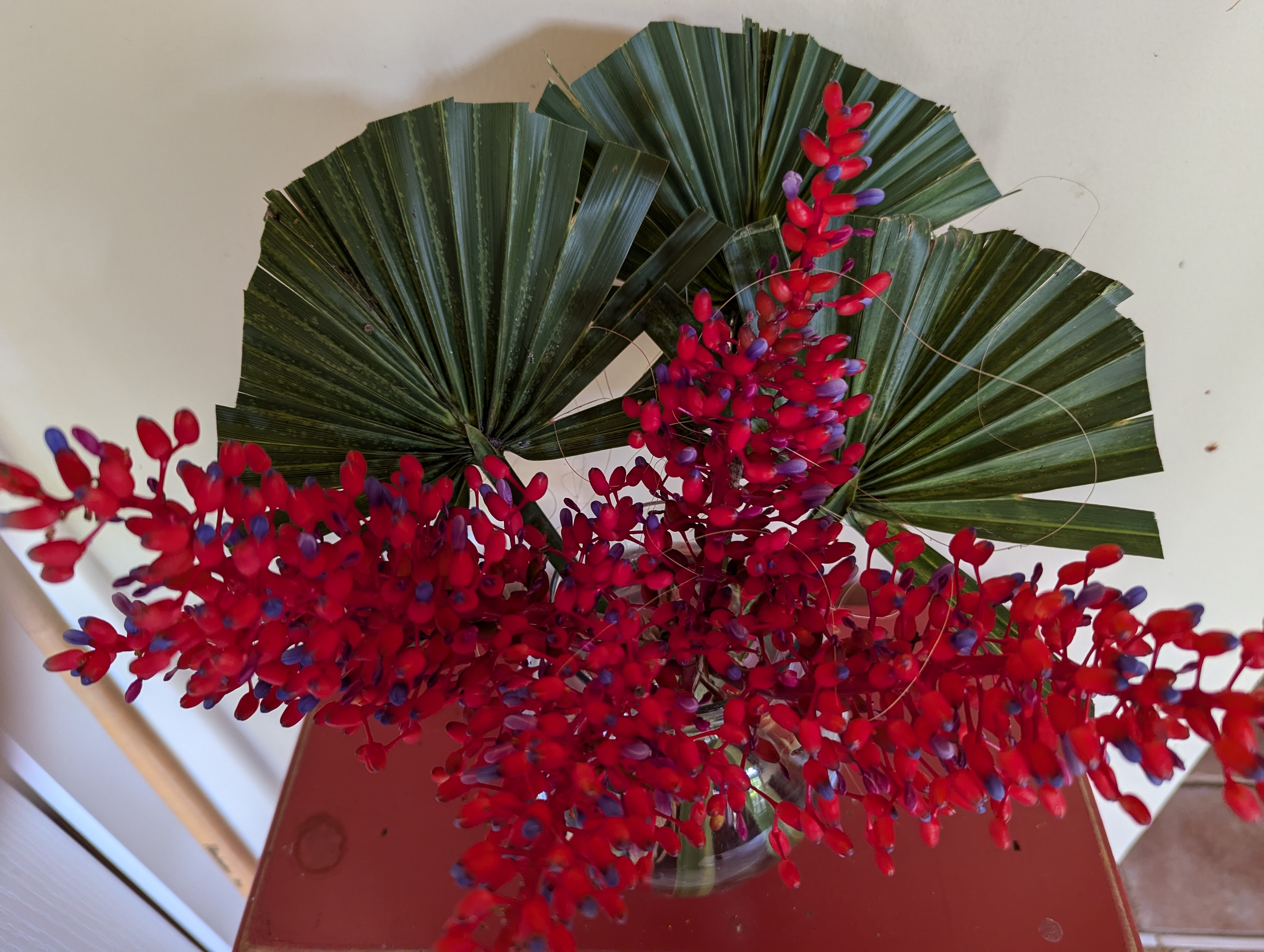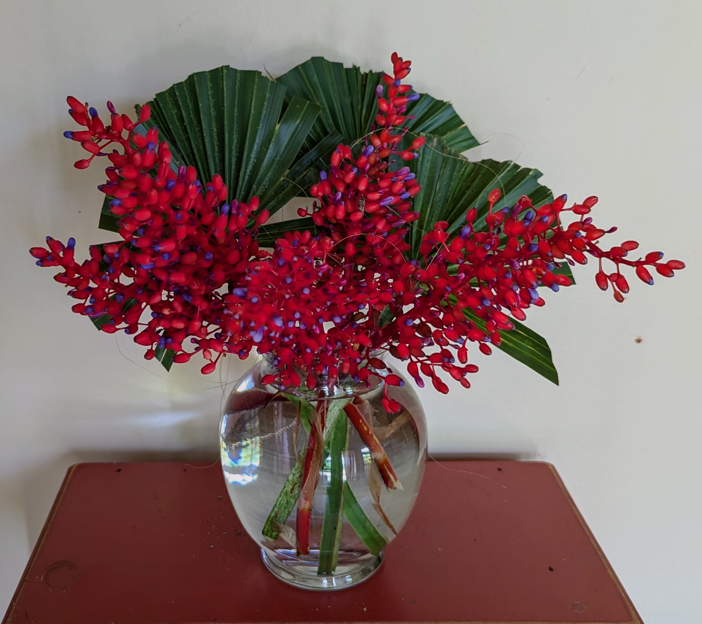 Wandering through the garden, I cut some white and purple – the white flowers are from Tropical Red Salvia (Salvia coccinea) – sometimes it is white. The purple flowers are ‘Cabernet’ Spathoglottis, a Ground Orchid. Then I saw the apricot/orange panicles, these are flowers from the Miniata Bromeliad, fading away. I was surprised to like the color. The usual color is below. The deep purple and gold berries are from a Spicewood (Calyptranthes pallens) – this is one of the supposedly ‘easy to grow natives’ that is not so easy to grow. It has been moved several times and finally seems content, in a place no book recommends. And it doesn’t smell like spices as of yet. The orange tubular flowers are from a Soap Aloe (Aloe saponaria), supposedly people made shampoo with these in the past – and then, the disclaimer. Many people are allergic to this, so caution is advised. There is not enough Benadryl in my house to make shampoo with this Aloe. The graceful creamy white spikes are from the Juba Bush (Iresine diffusa) – this is named for a Caribbean dance – Juba, because it sways in the wind like the dancers, and it really does. I guess I need a Limbo plant. Striped foliage in the back is from Wandering Jew (Transcandentia zebrina) that grows wild in my garden.