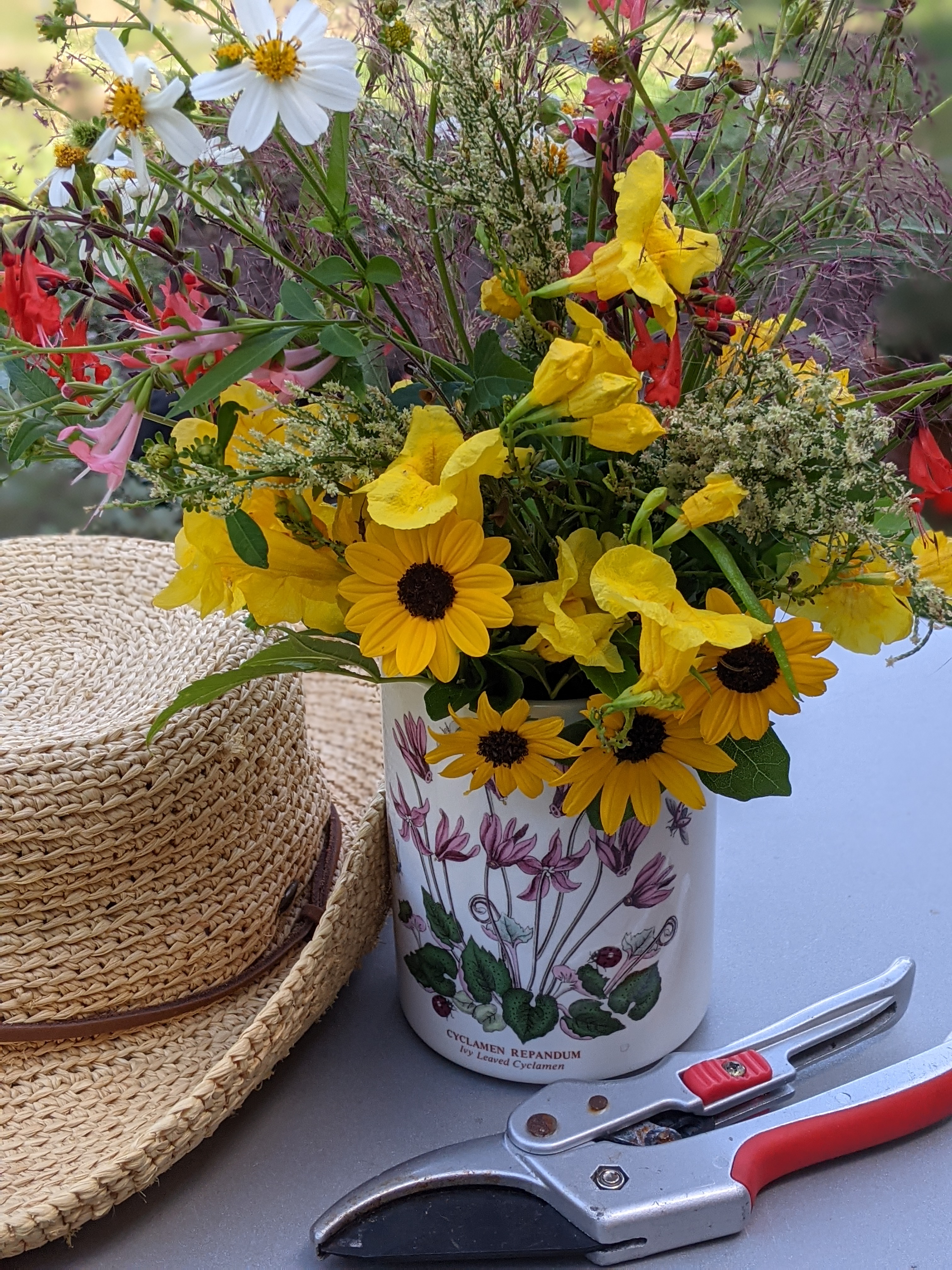 The flowers are reflecting summer to me, with the exception of the Muhly Grass, Muhly means fall in South Florida. The Portmerion canister is a wedding gift from long ago, never used to store anything – it occasionally serves as a vase.