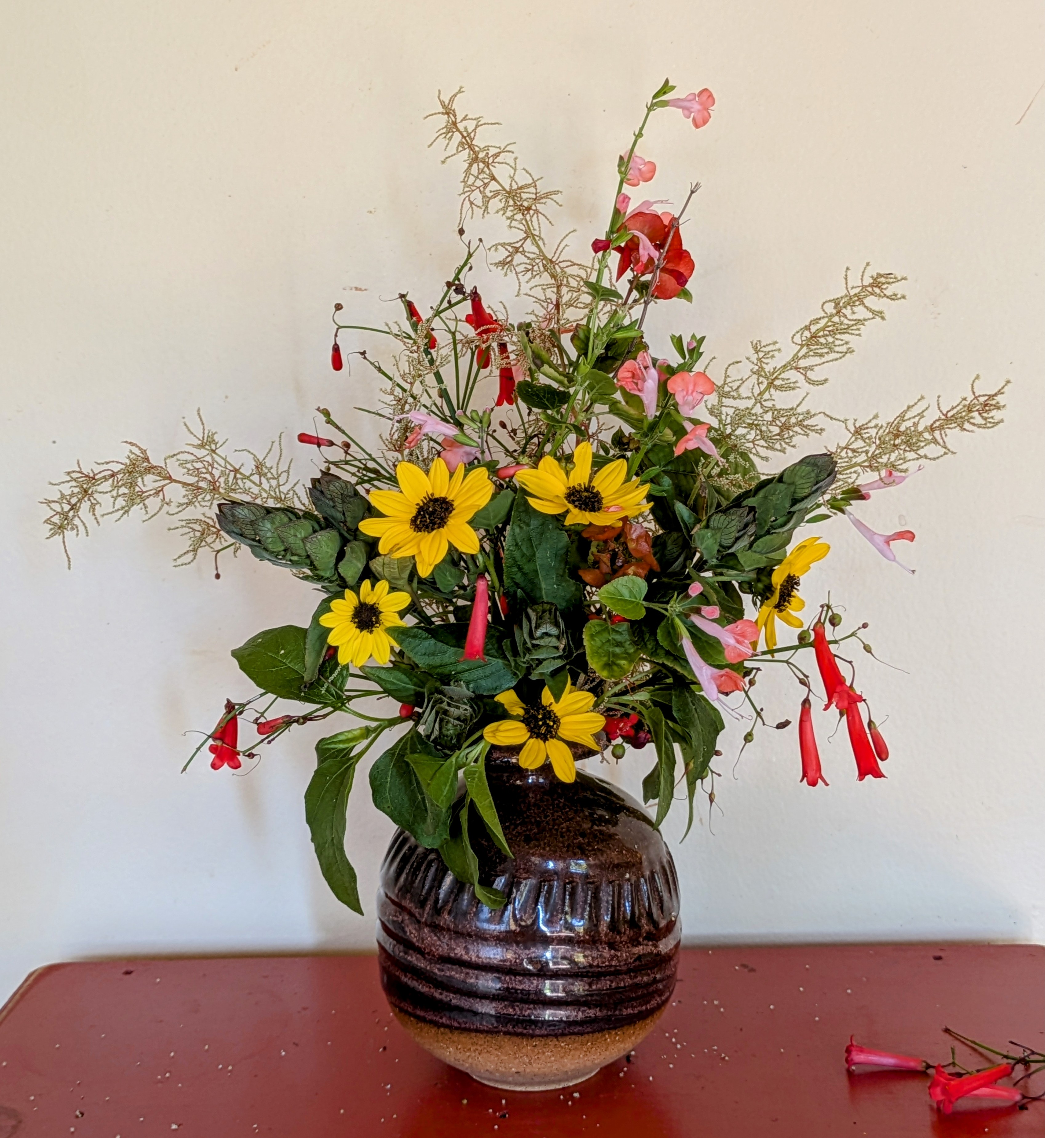 The red berries are Brazilian Pepper (Schinus terebinthifolia) – a dreadful invasive plant in my garden. I am certain these were planted for their lovely berries and frighteningly quick growth habit. There are now untold zillions of these growing wild while we try to get rid of them. I may have saved the planet from 60 with this vase. Sigh. The purple foliage is ‘Purple Prince’ Alternanthera – planted as an annual color some years ago these appear intermittently growing from crevices in paving stones. Red flowers are Shrimp Plants (Justicia brandegeana) – my neighbor gave me one about ten years ago and it keeps going on. The trimmed palm frond, another seedling Cabbage Palm (Palmetto Sabal). Cream colored flower spikes are Juba Bush (Iresine diffusa), a gift from an unknown benefactor I have been diligently trying to propagate (no results). Long grey foliage at the neck of the bottle is a native air plant (Tillandsia spp). This is a relative of Spanish Moss and just appears. No idea why.
