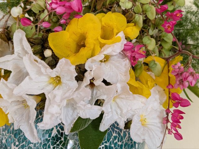 The hunt was on for holiday mood flowers with skinny stems. In South Florida! A challenge, to say the least. My garden provided several selections. Not one of them was planted by me. Where did they come from?? An unanswerable question.
