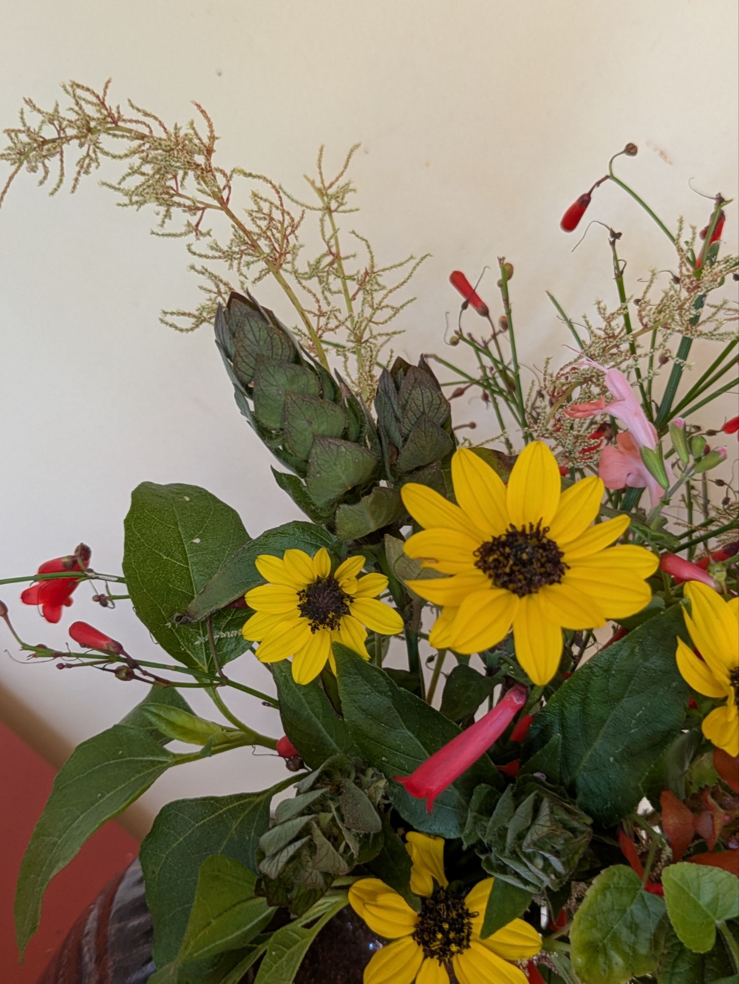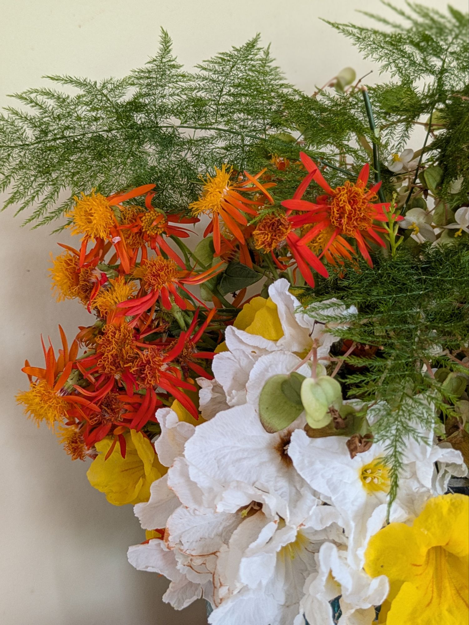 The hunt was on for holiday mood flowers with skinny stems. In South Florida! A challenge, to say the least. My garden provided several selections. Not one of them was planted by me. Where did they come from?? An unanswerable question.