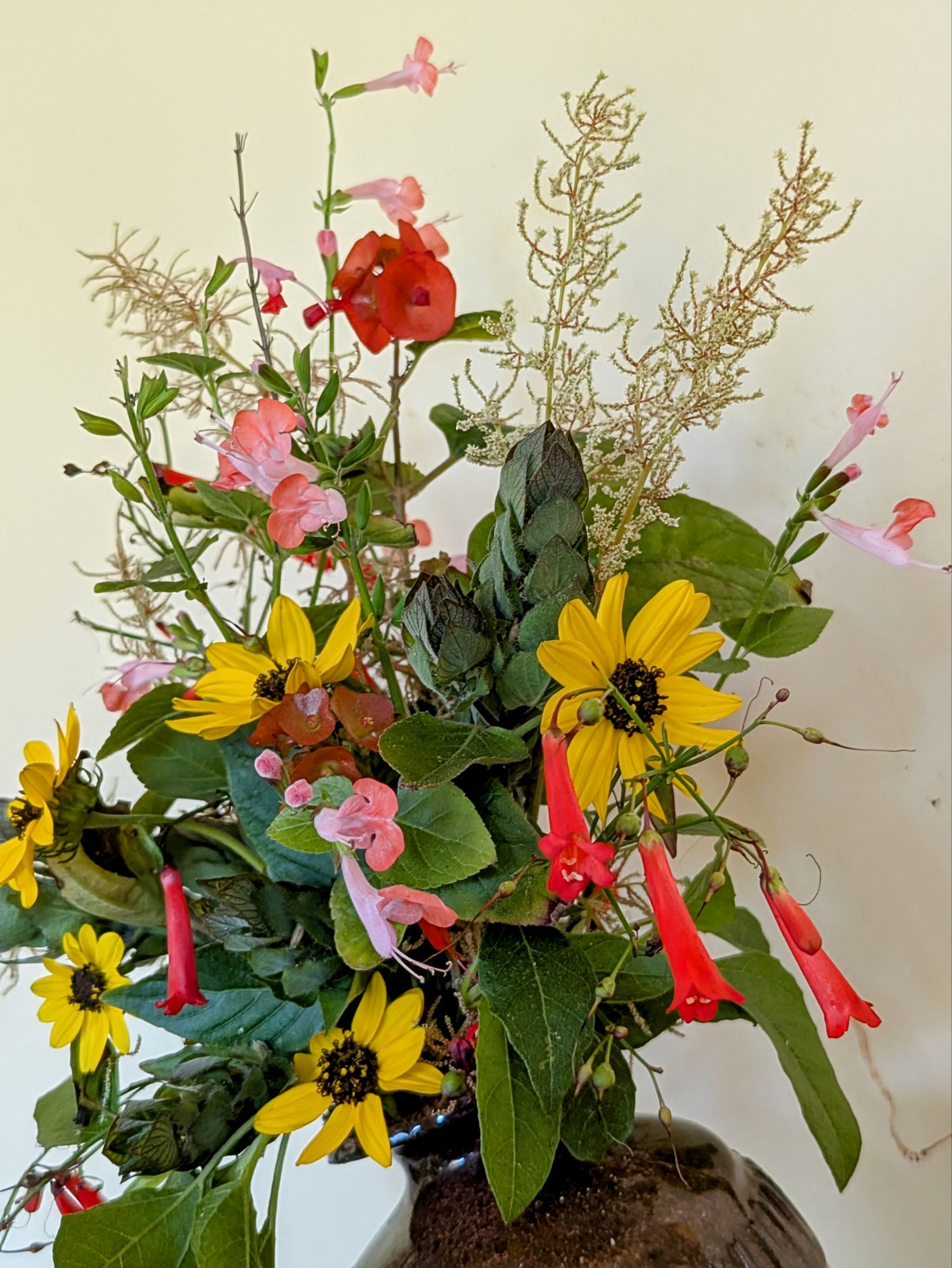 The red berries are Brazilian Pepper (Schinus terebinthifolia) – a dreadful invasive plant in my garden. I am certain these were planted for their lovely berries and frighteningly quick growth habit. There are now untold zillions of these growing wild while we try to get rid of them. I may have saved the planet from 60 with this vase. Sigh. The purple foliage is ‘Purple Prince’ Alternanthera – planted as an annual color some years ago these appear intermittently growing from crevices in paving stones. Red flowers are Shrimp Plants (Justicia brandegeana) – my neighbor gave me one about ten years ago and it keeps going on. The trimmed palm frond, another seedling Cabbage Palm (Palmetto Sabal). Cream colored flower spikes are Juba Bush (Iresine diffusa), a gift from an unknown benefactor I have been diligently trying to propagate (no results). Long grey foliage at the neck of the bottle is a native air plant (Tillandsia spp). This is a relative of Spanish Moss and just appears. No idea why.