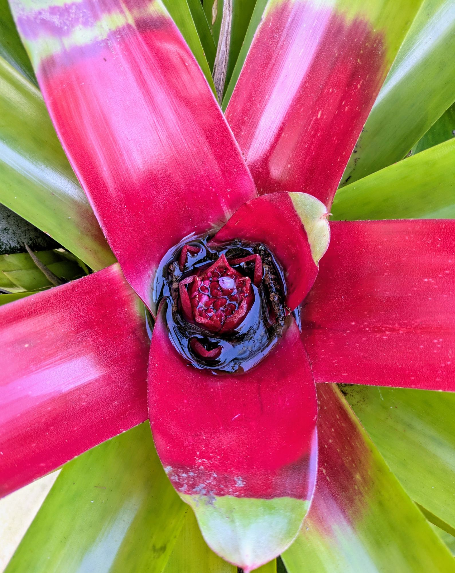 Winter flowering bromeliads are doing their thing. This is a McWilliamsii Neoregelia just starting to flower. Its cup is full of water from overnight showers.