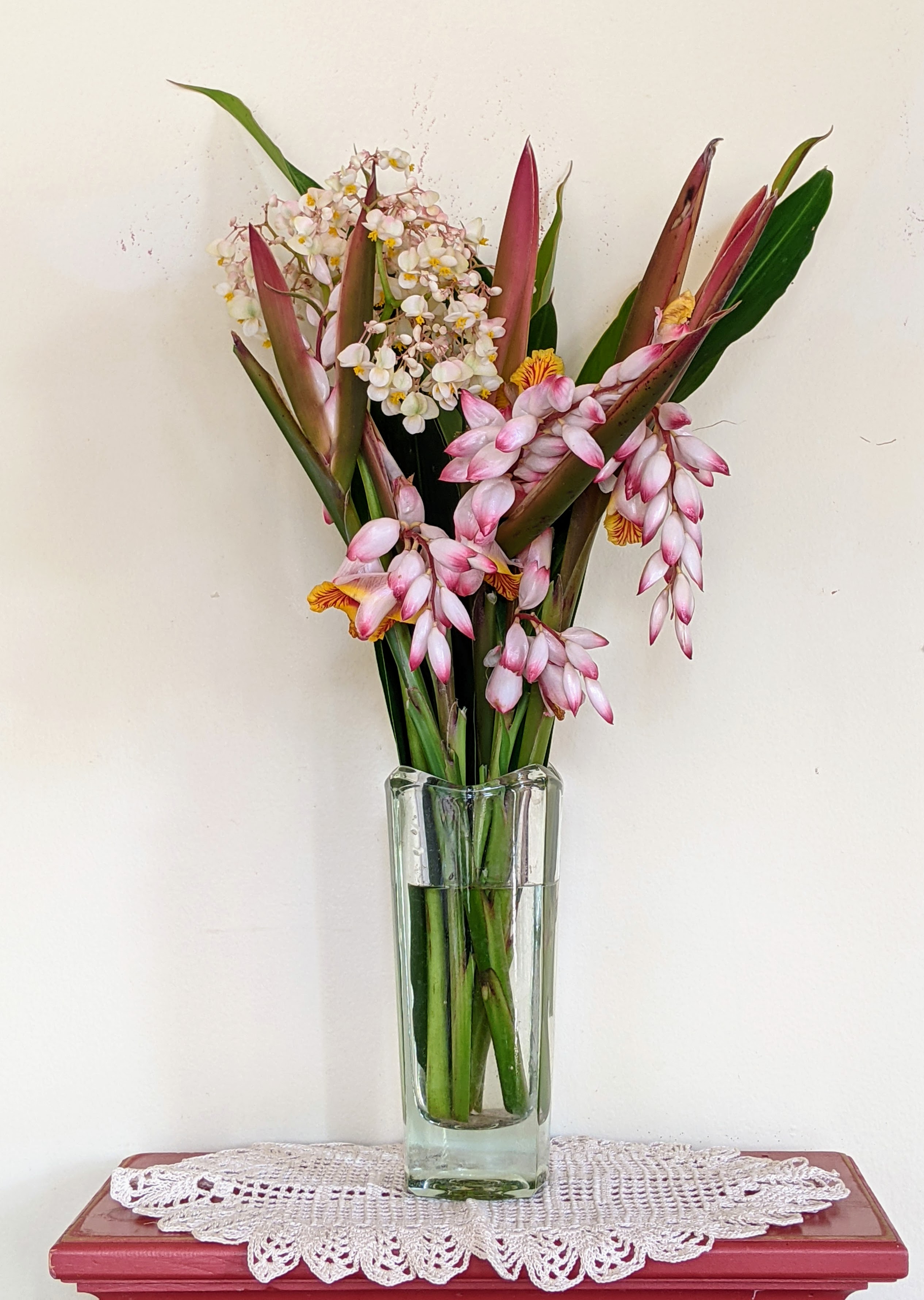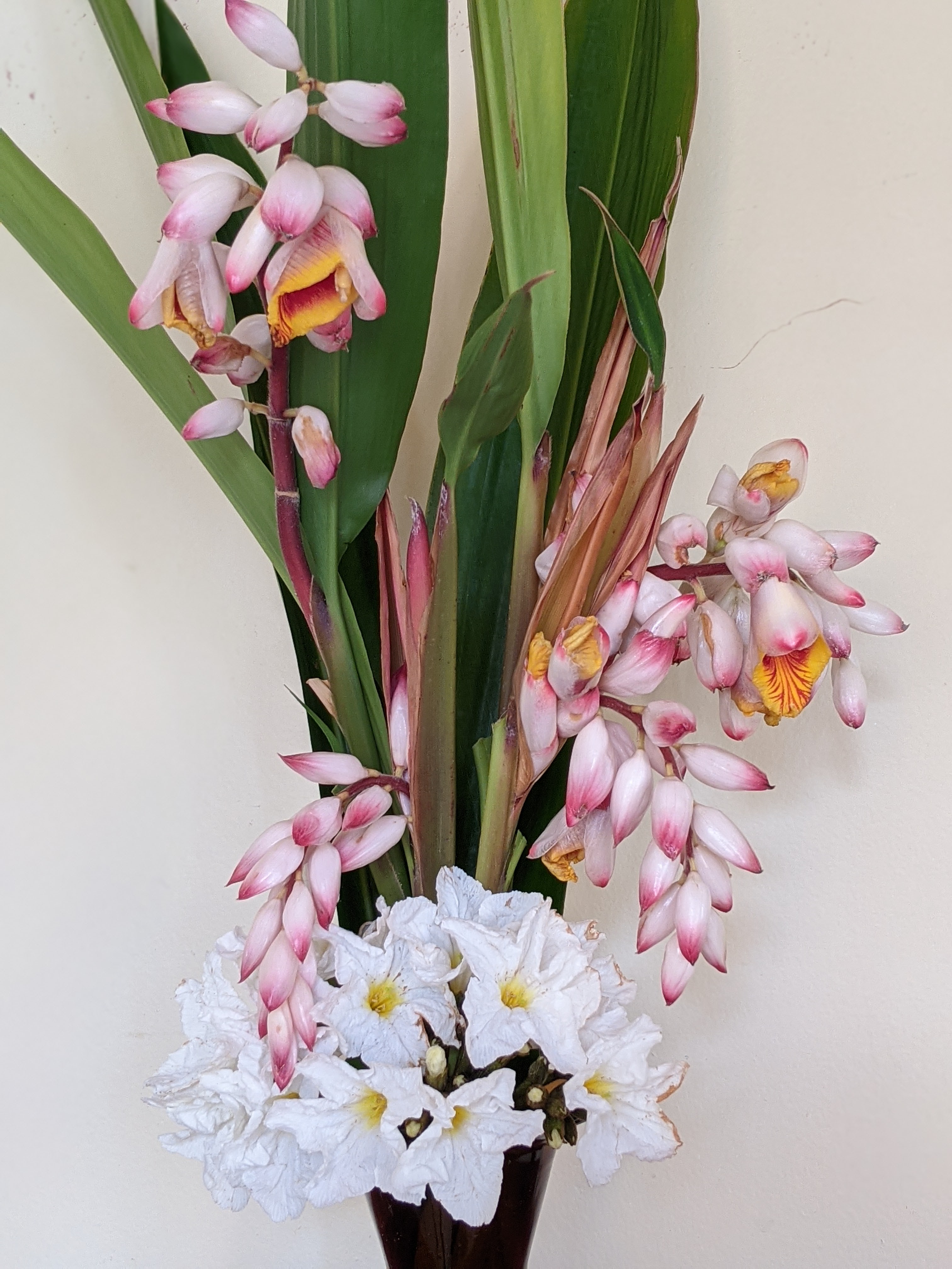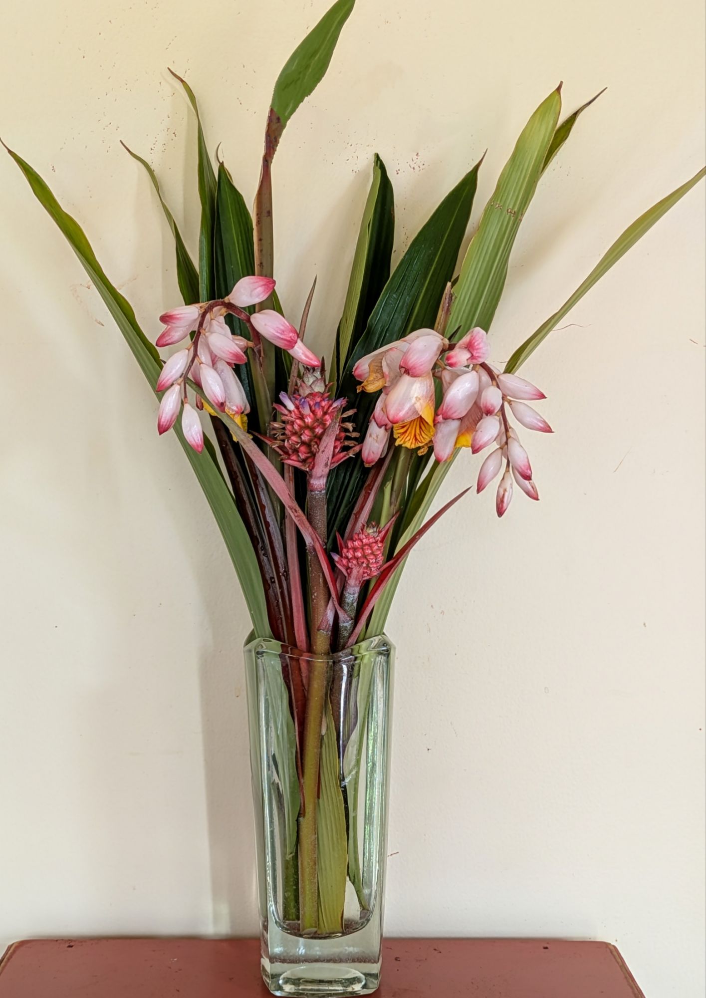 The Shell Ginger is actually a bit late this year, though I do associate it with spring. It sometimes flowers a few times a year. So, it is a bit unpredictable and actually multi-seasonal..sounding like a gardening marketing piece here. The Gingers with solid green foliage are a bit difficult to find but flower on a regular basis. Varigated Ginger is known to flower about once a decade.