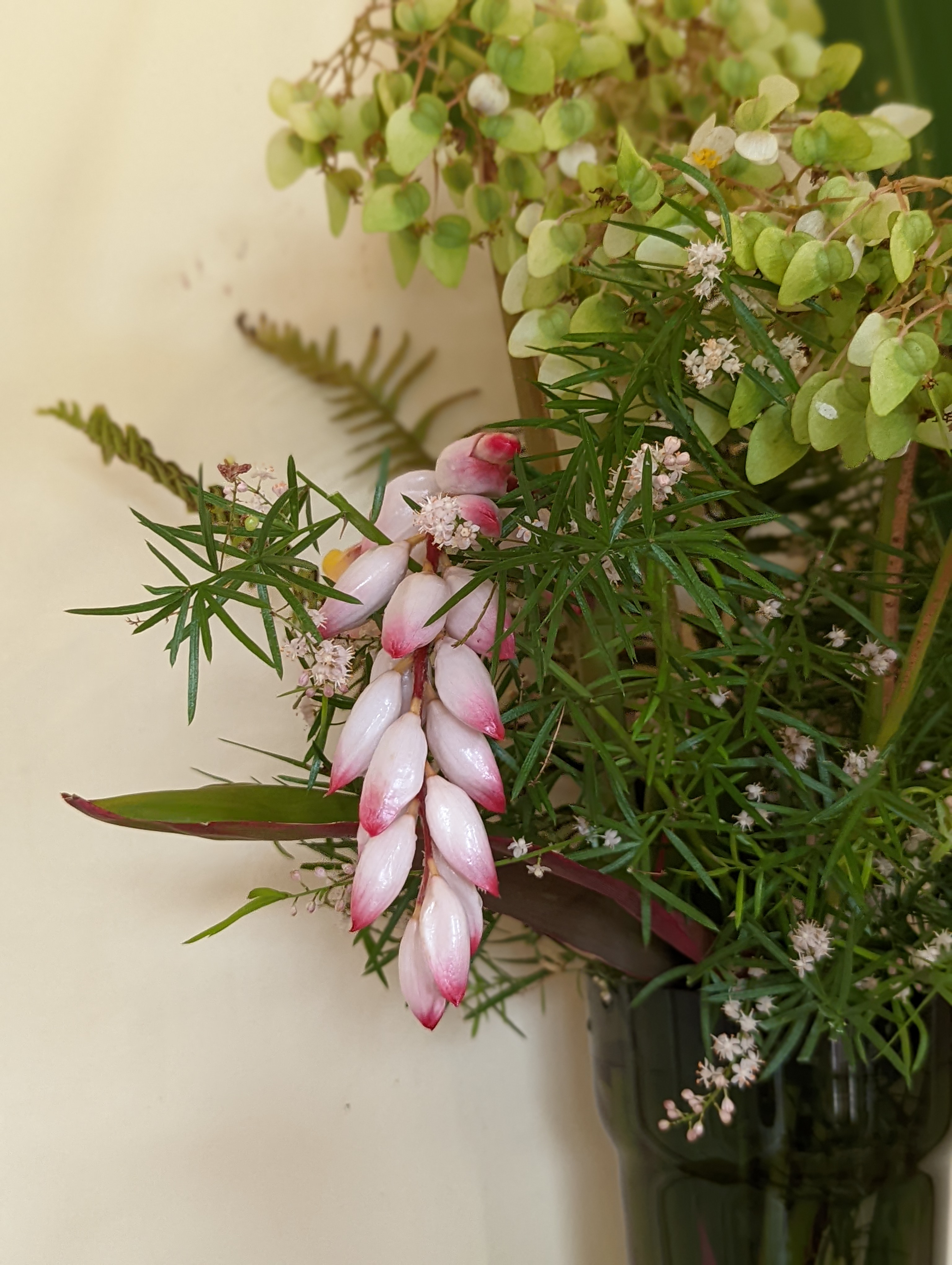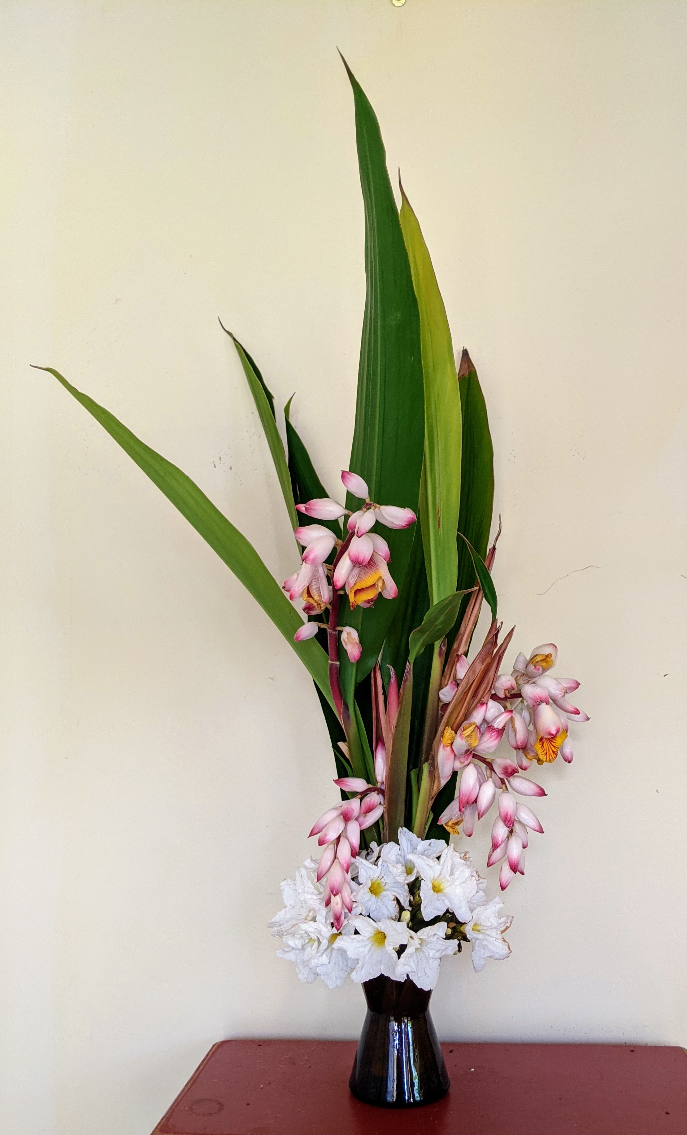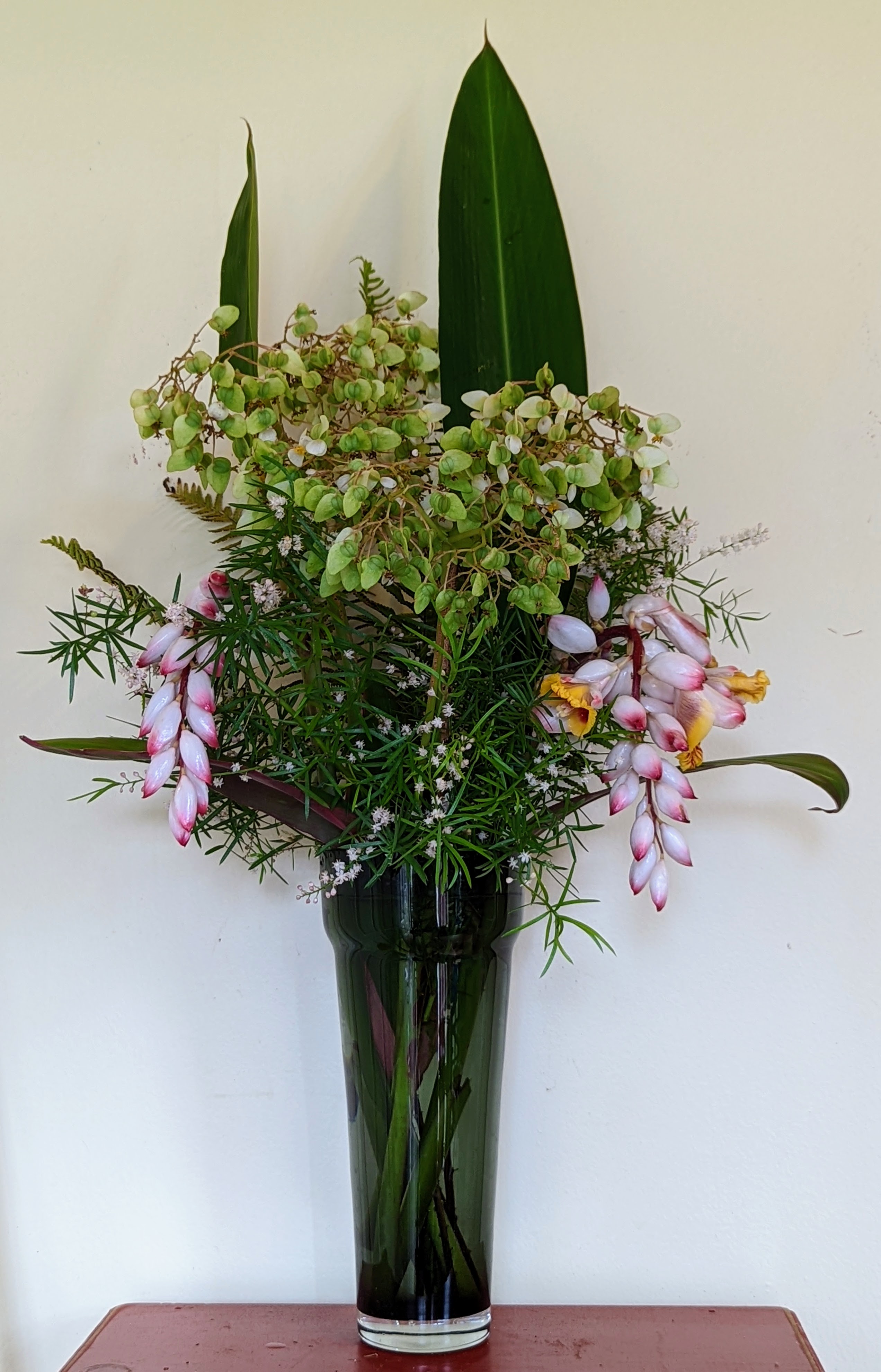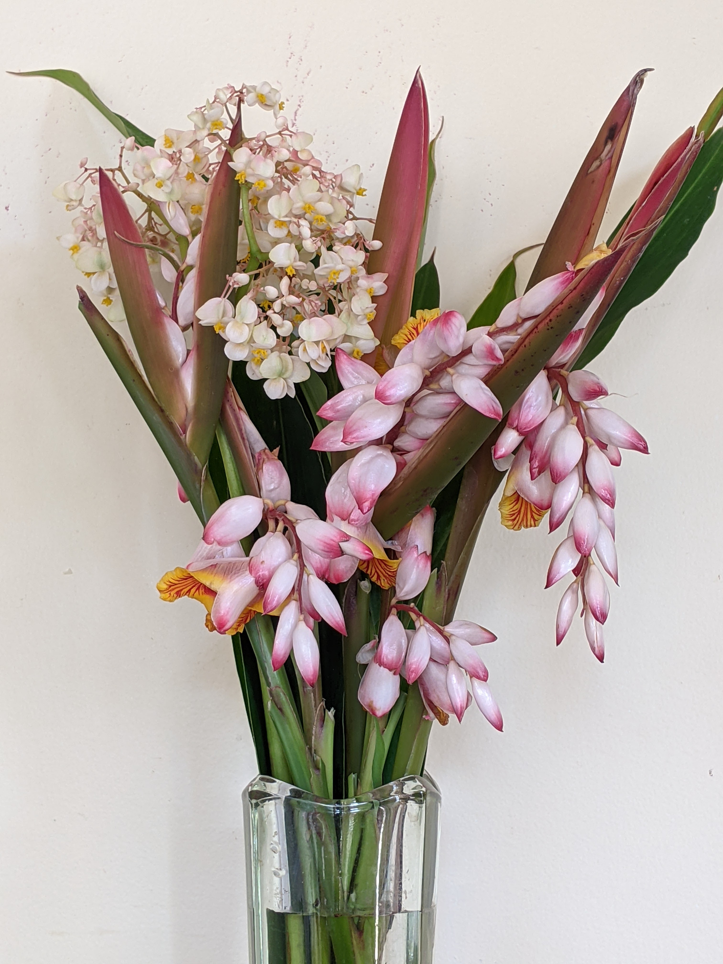 The Shell Ginger is actually a bit late this year, though I do associate it with spring. It sometimes flowers a few times a year. So, it is a bit unpredictable and actually multi-seasonal..sounding like a gardening marketing piece here. The Gingers with solid green foliage are a bit difficult to find but flower on a regular basis. Varigated Ginger is known to flower about once a decade.