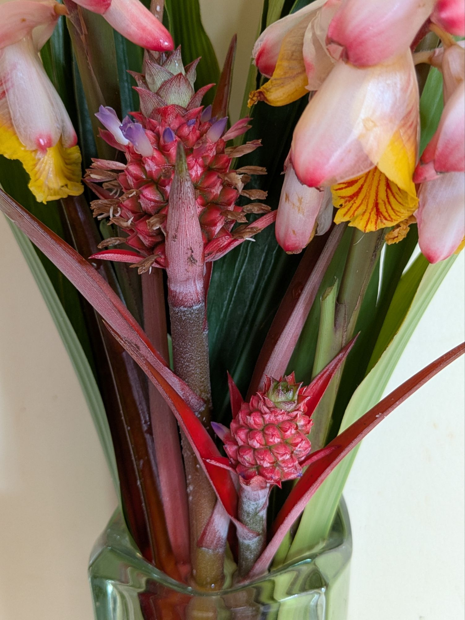 This is a miniature ornamental pineapple. I am told they are edible and may be juiced. I think about 50 would be needed to make juicing worthwhile, so I just use mine in vases.They are so cute it is difficult to resist cutting them. A friend gave me a start of this plant some years ago, now there are many in the garden. The only downside – sharp everything.