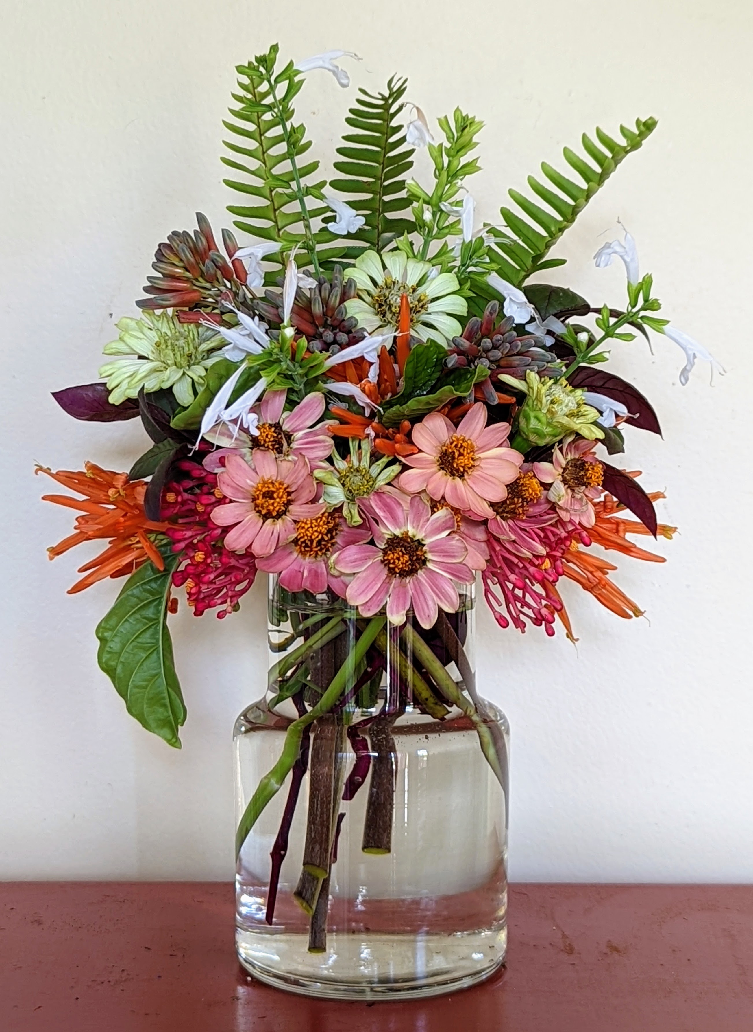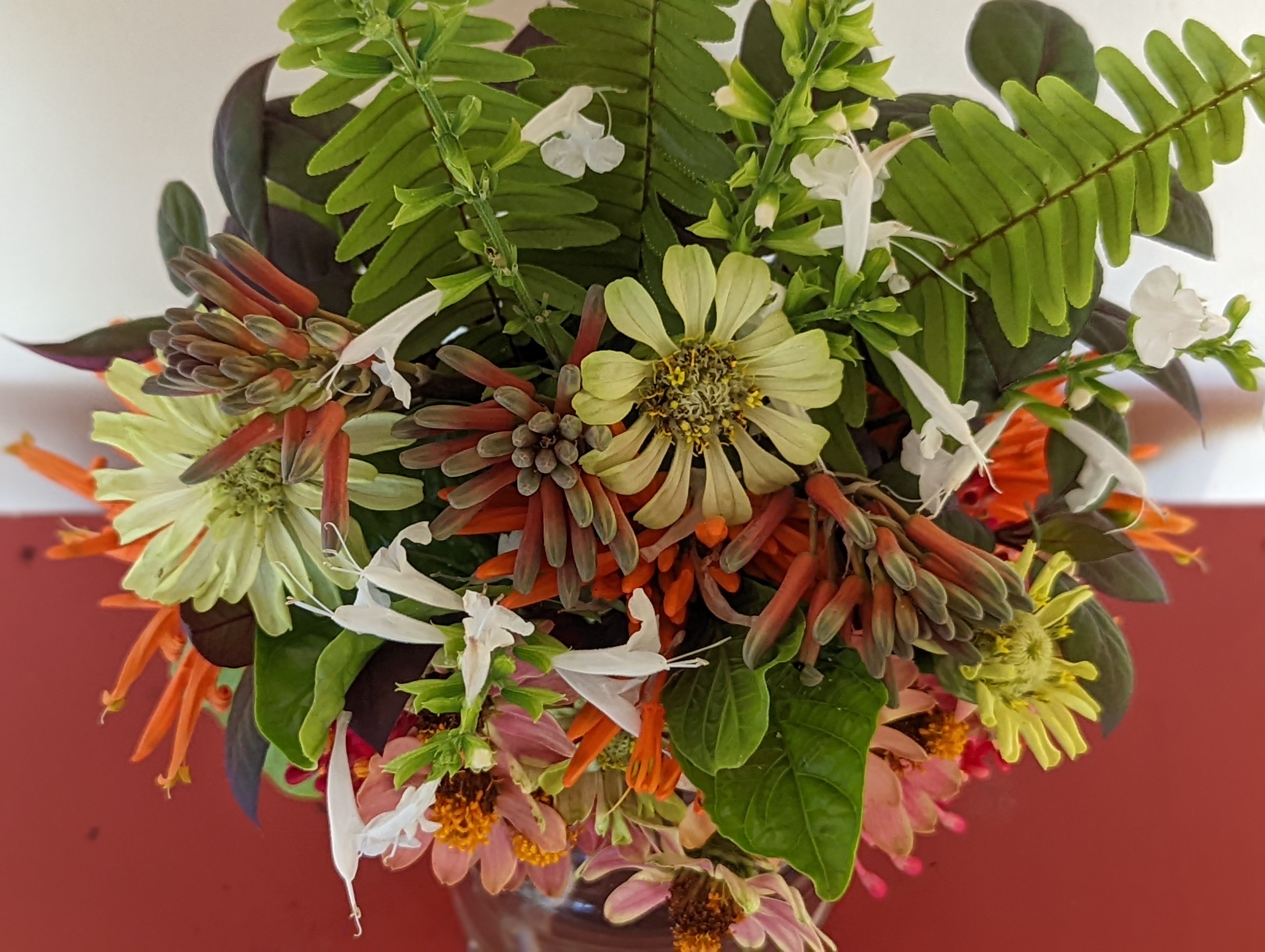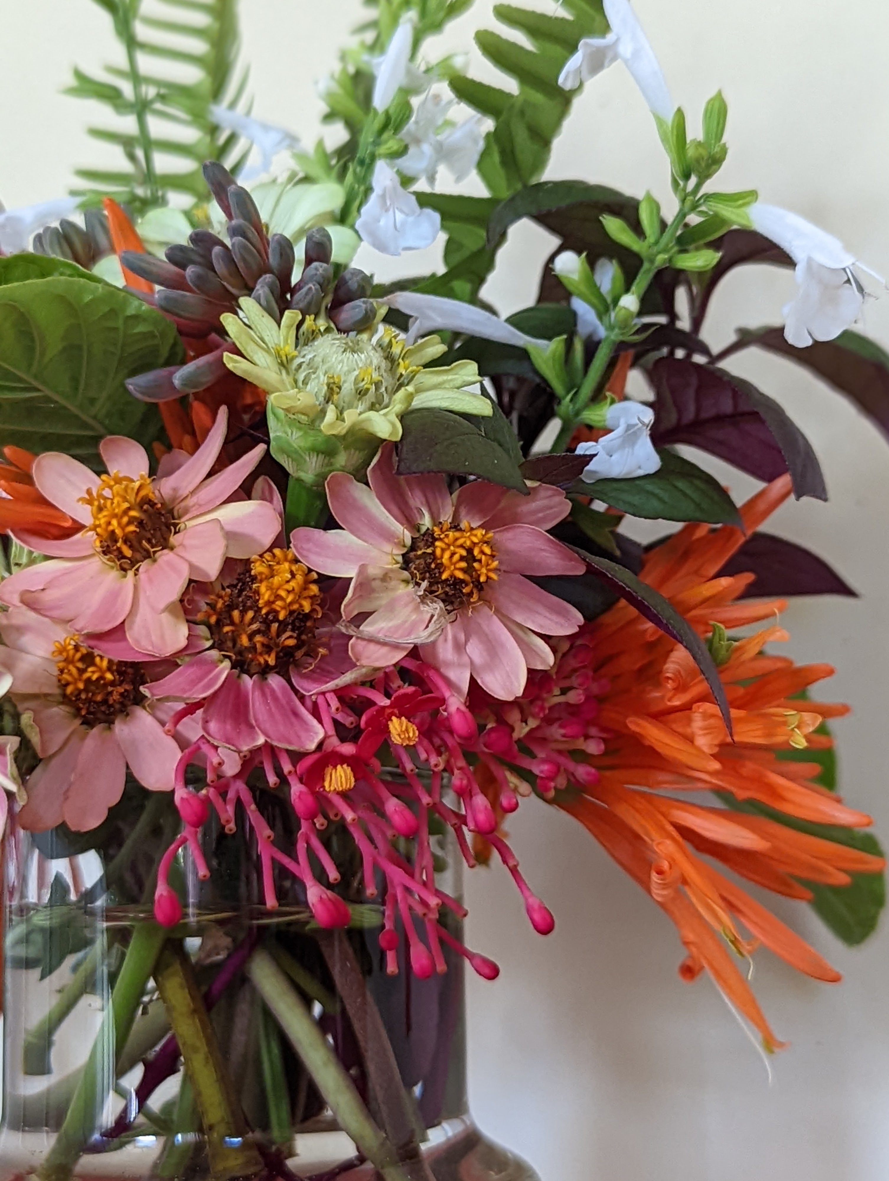 The pineapple, on its good side. The flowers are: in peach, pink and green, Apricot Profusion, Cactus and Envy Zinnias; the pink flower is the same Dahlia from last week, identified as Purple Gem; white flowers are from Tropical Gardenia (Tabernaemontana diviricata). A few stems of Tropical Red Salvia (Salvia coccinea) are in the back.